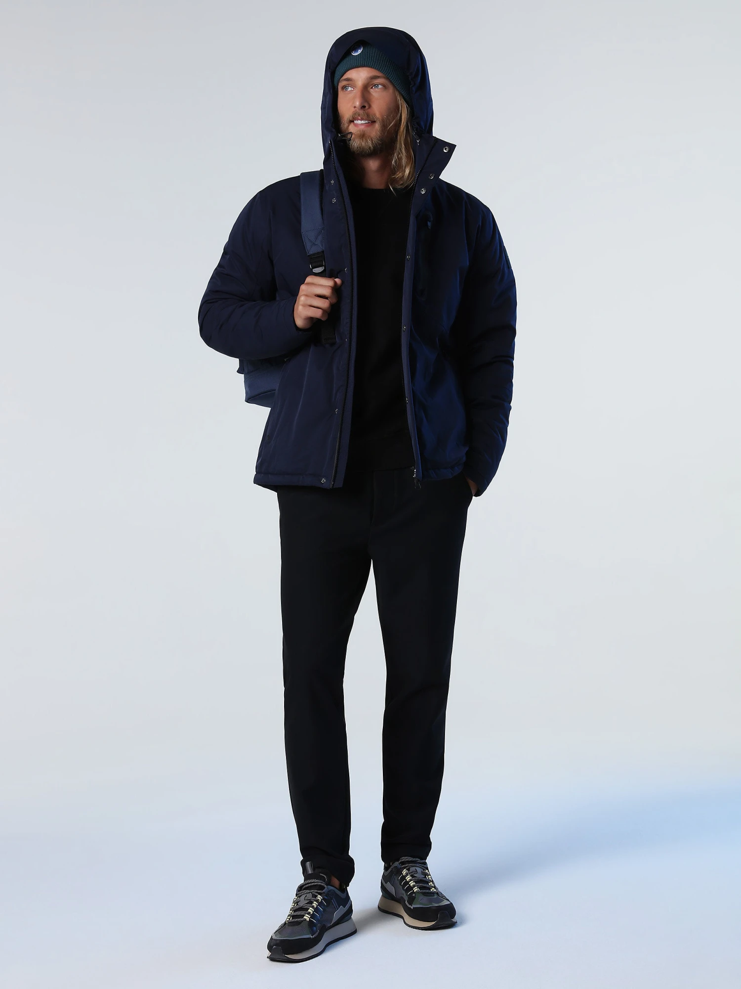 Admiral jacket crafted from water-repellent double-layer fabric with inner heat-taped seams and Repreve padding.