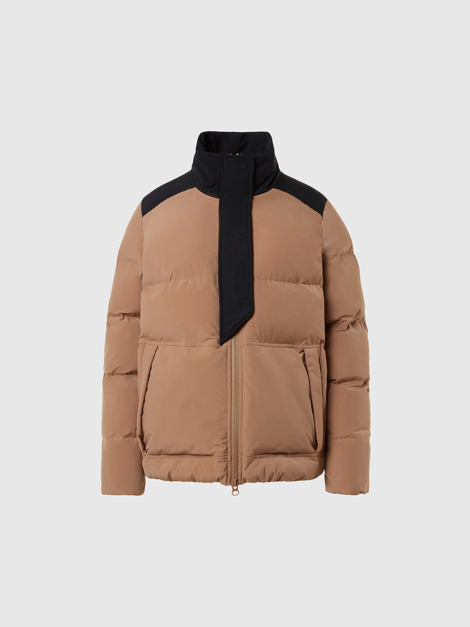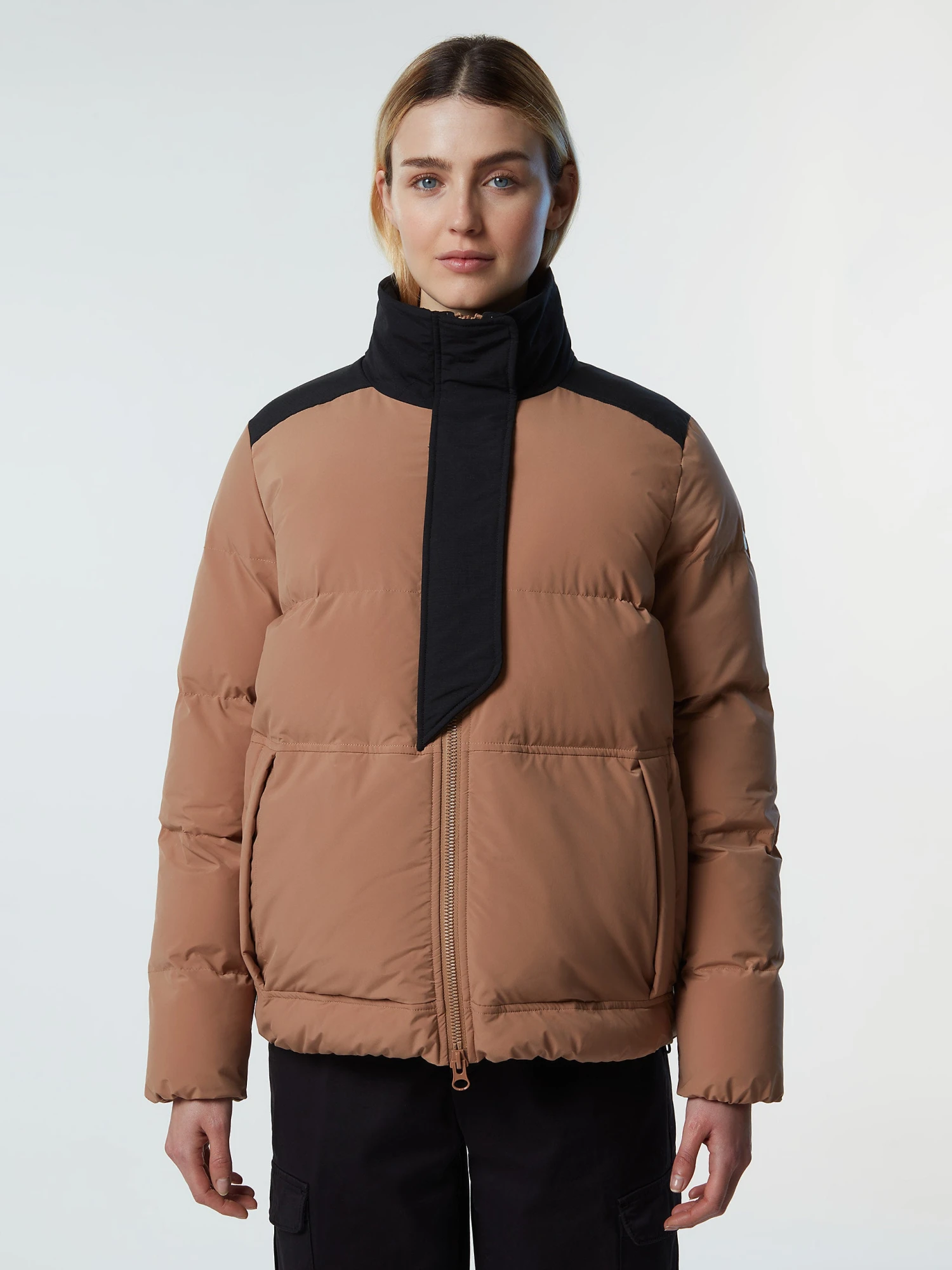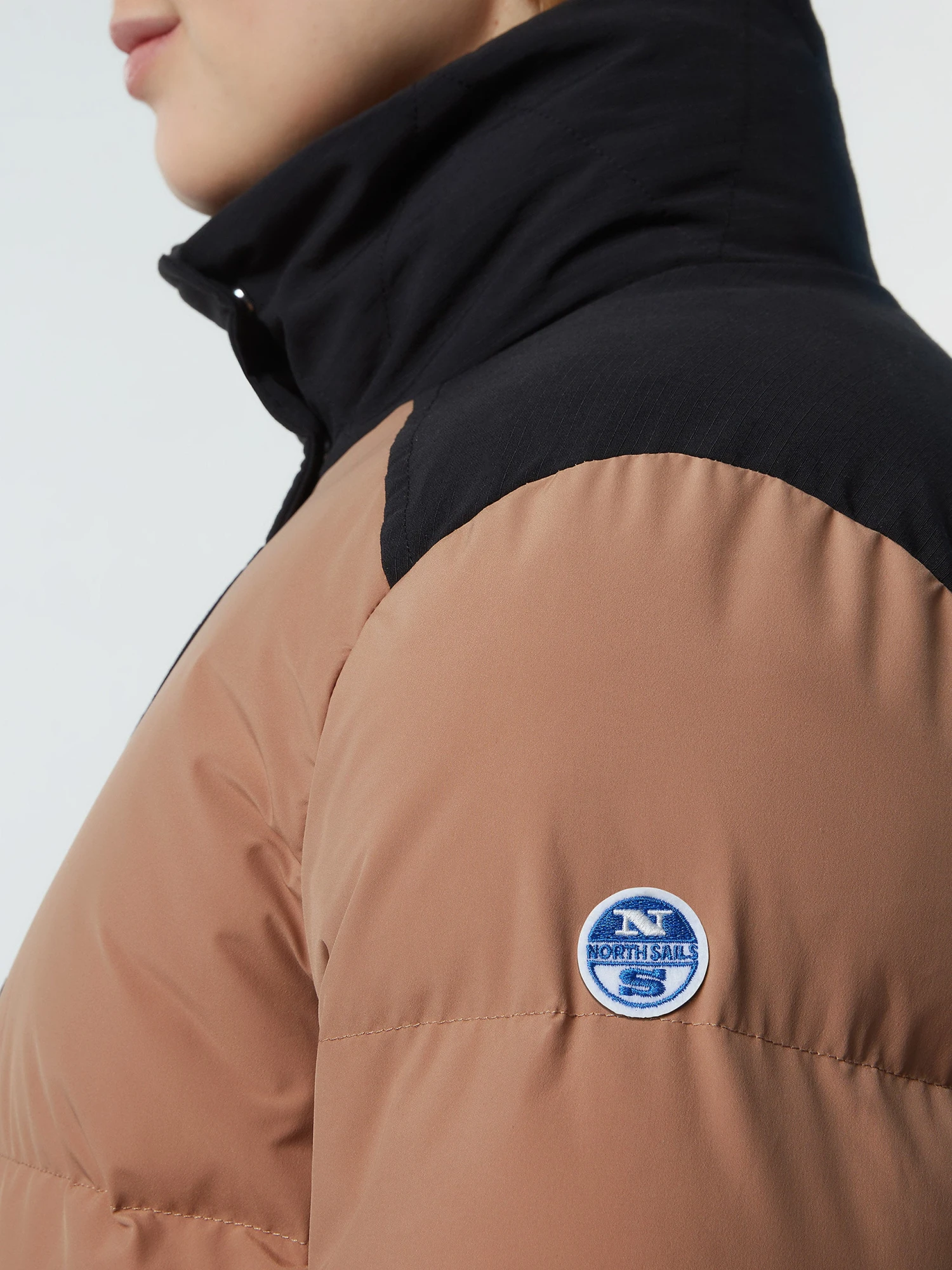 Women’s puffer jacket made from recycled nylon and heavy ripstop. Adjustable hem, front storm placket and stand collar. Embellished with a logo patch on the sleeve.