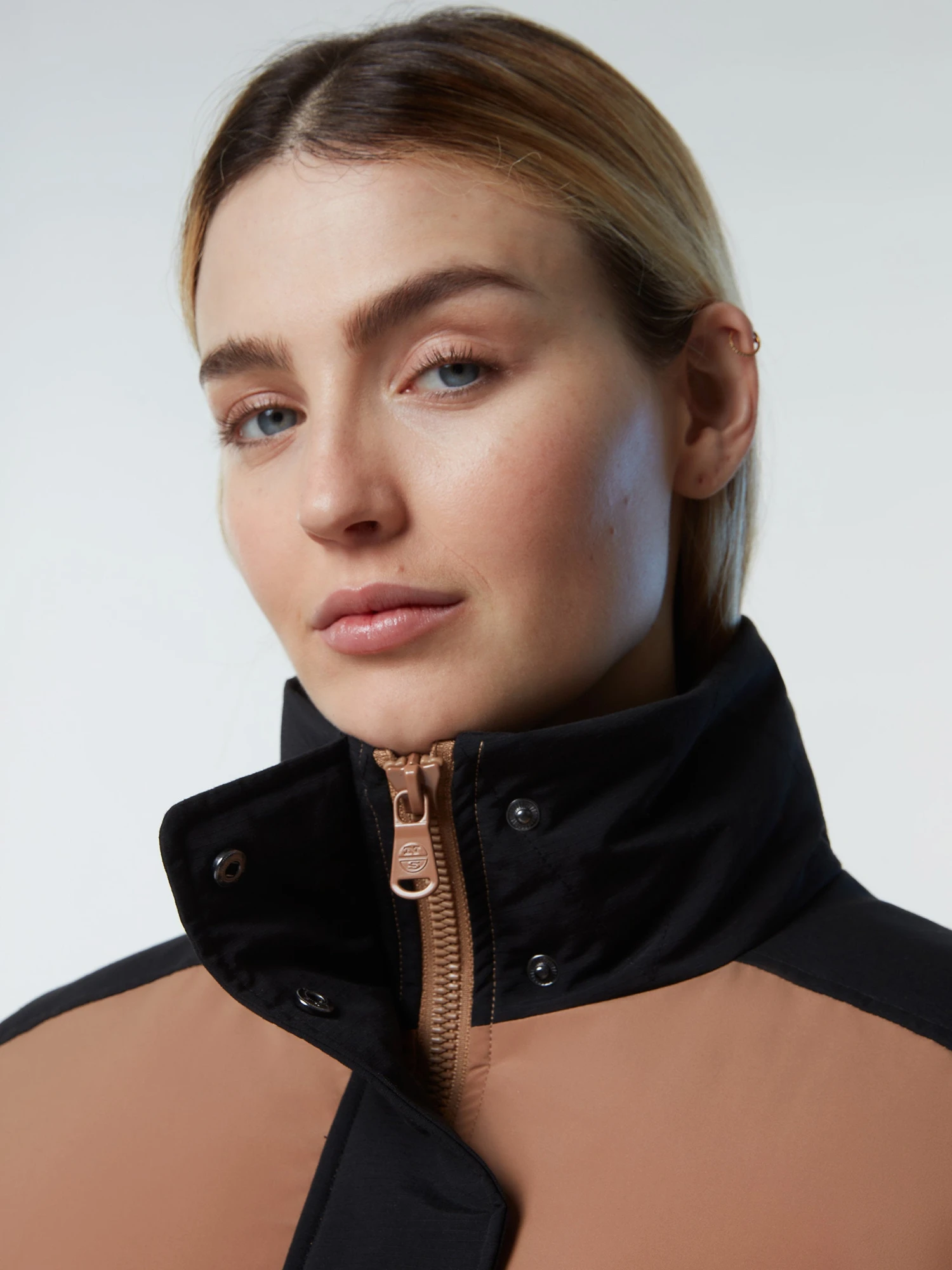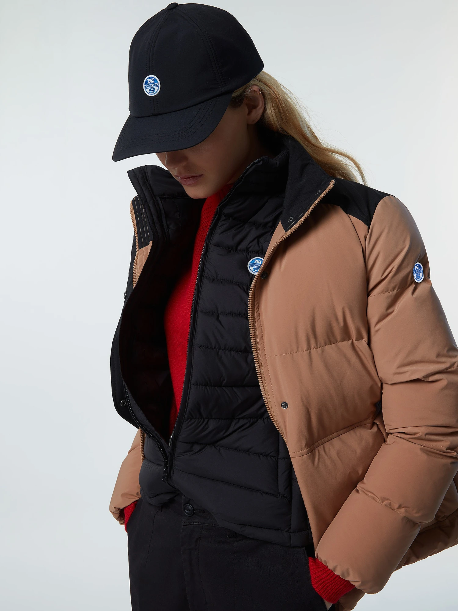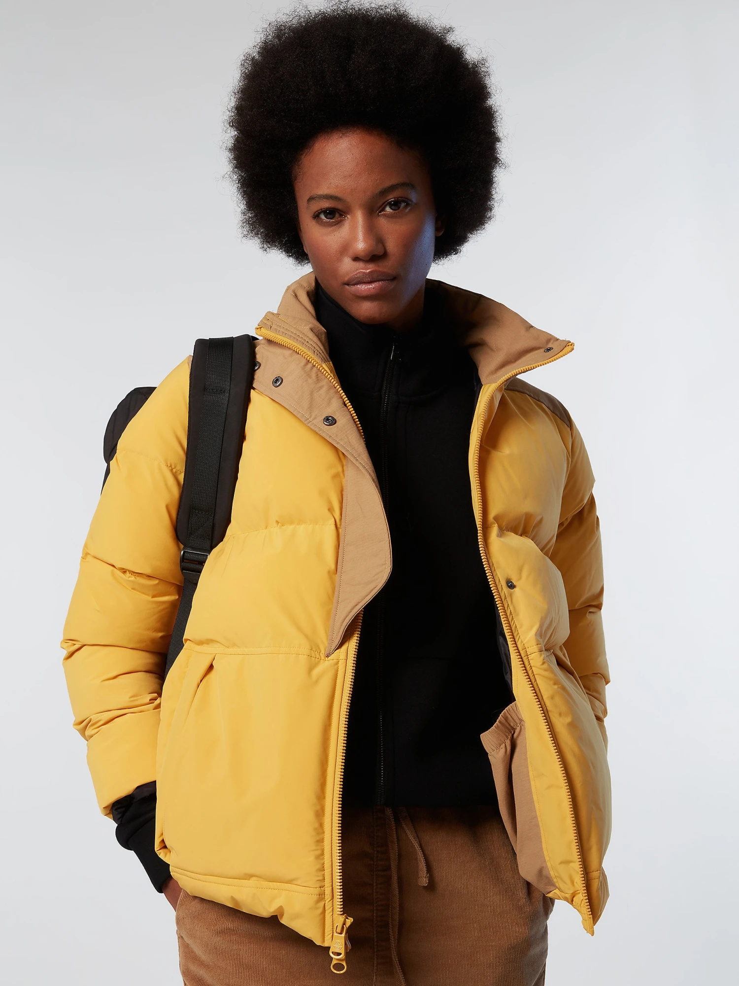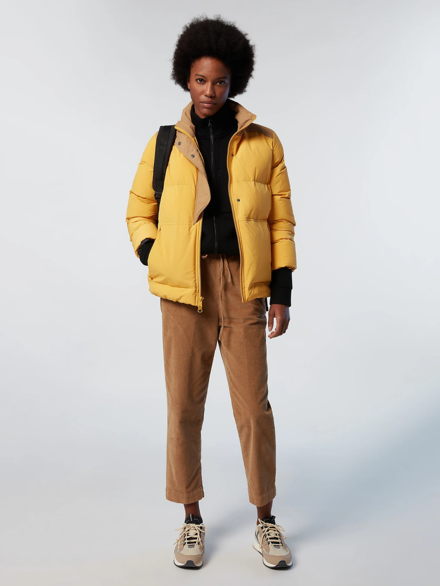 Women’s puffer jacket made from recycled nylon and heavy ripstop. Adjustable hem, front storm placket and stand collar. Embellished with a logo patch on the sleeve.