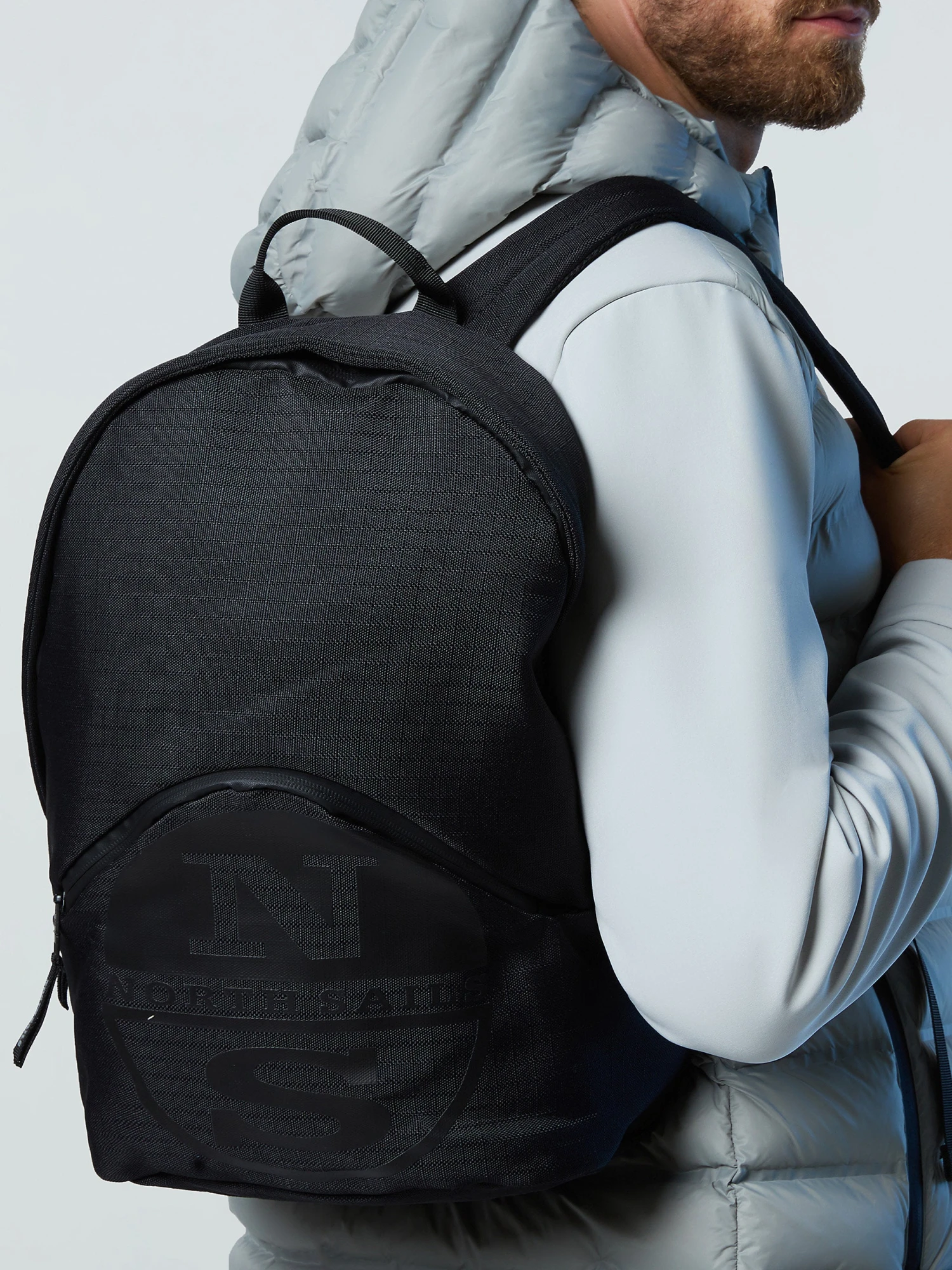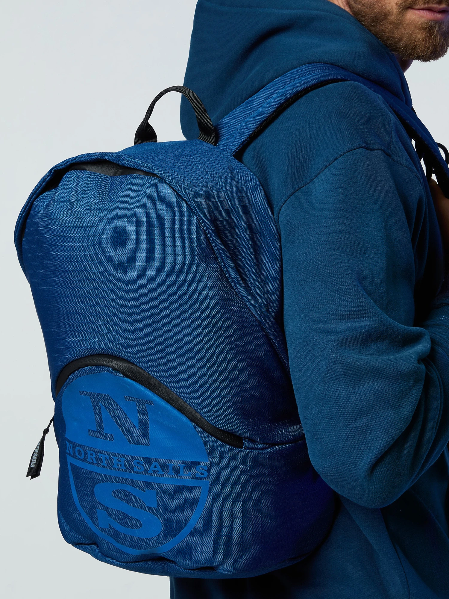 Men’s backpack made from recycled ripstop, featuring a padded back and adjustable straps. Complete with a front zipper pocket with tonal North Sails logo print.