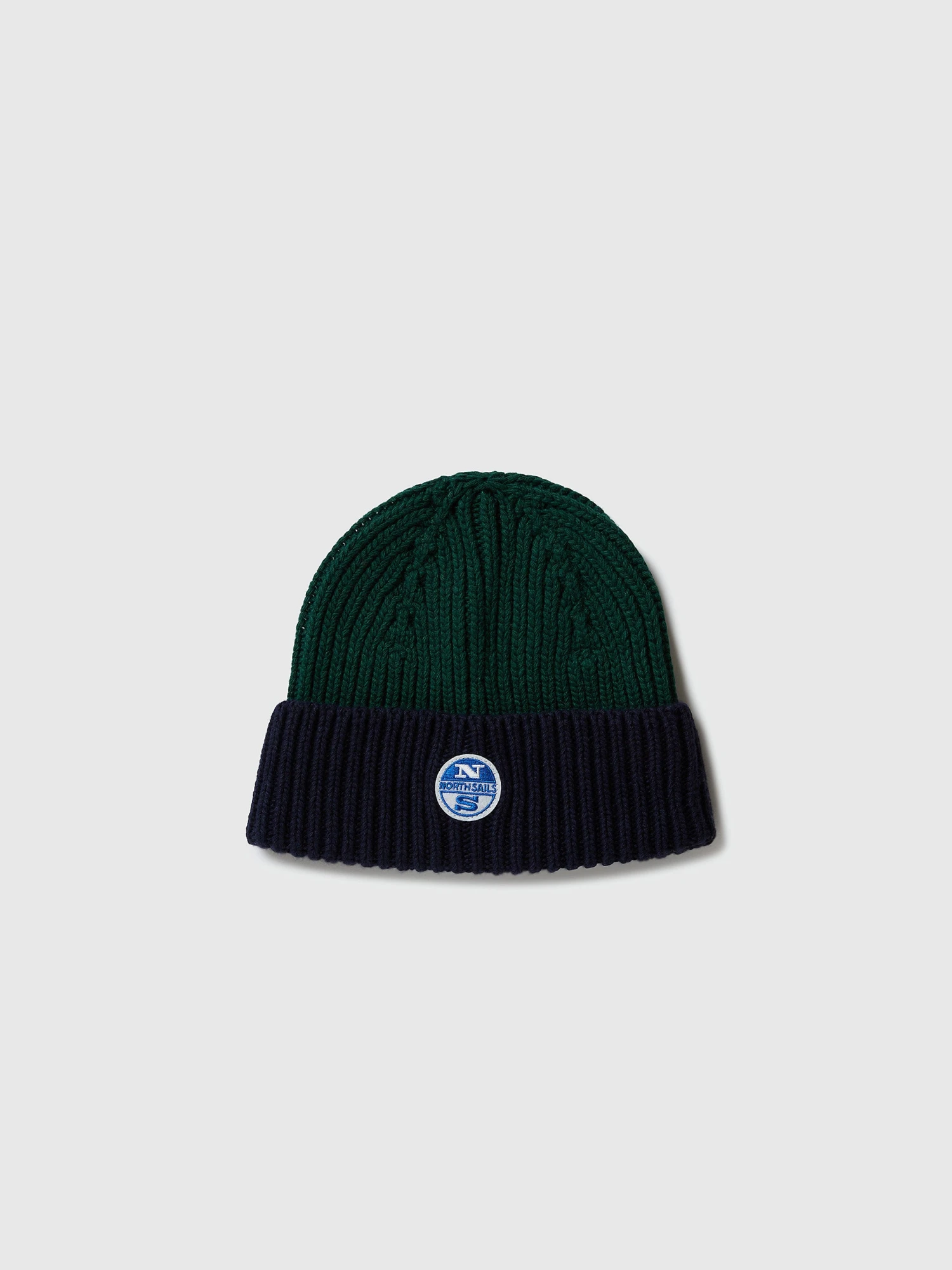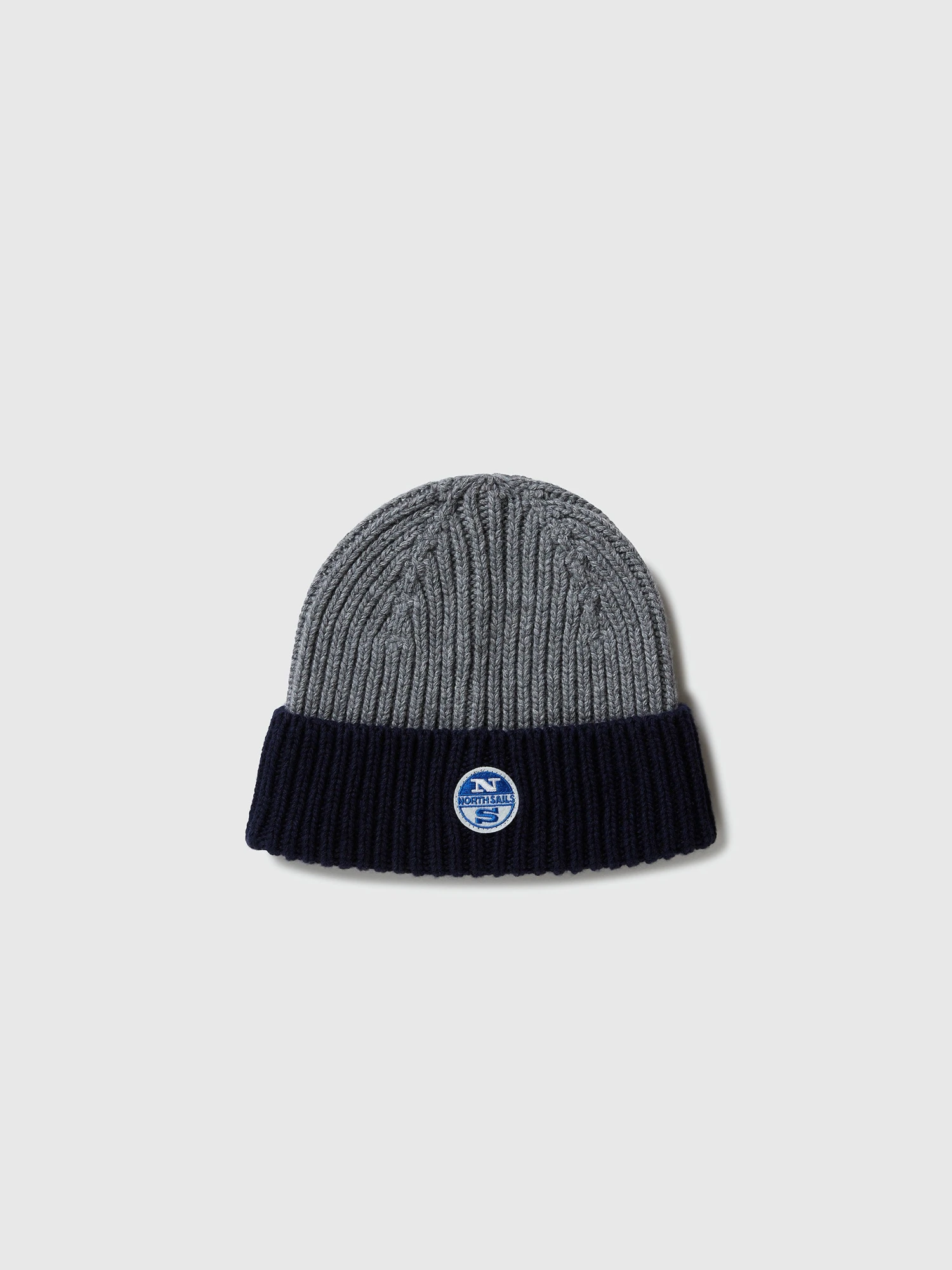 Wool blend beanie with a finely ribbed texture and a turn-up brim accented with a logo patch.