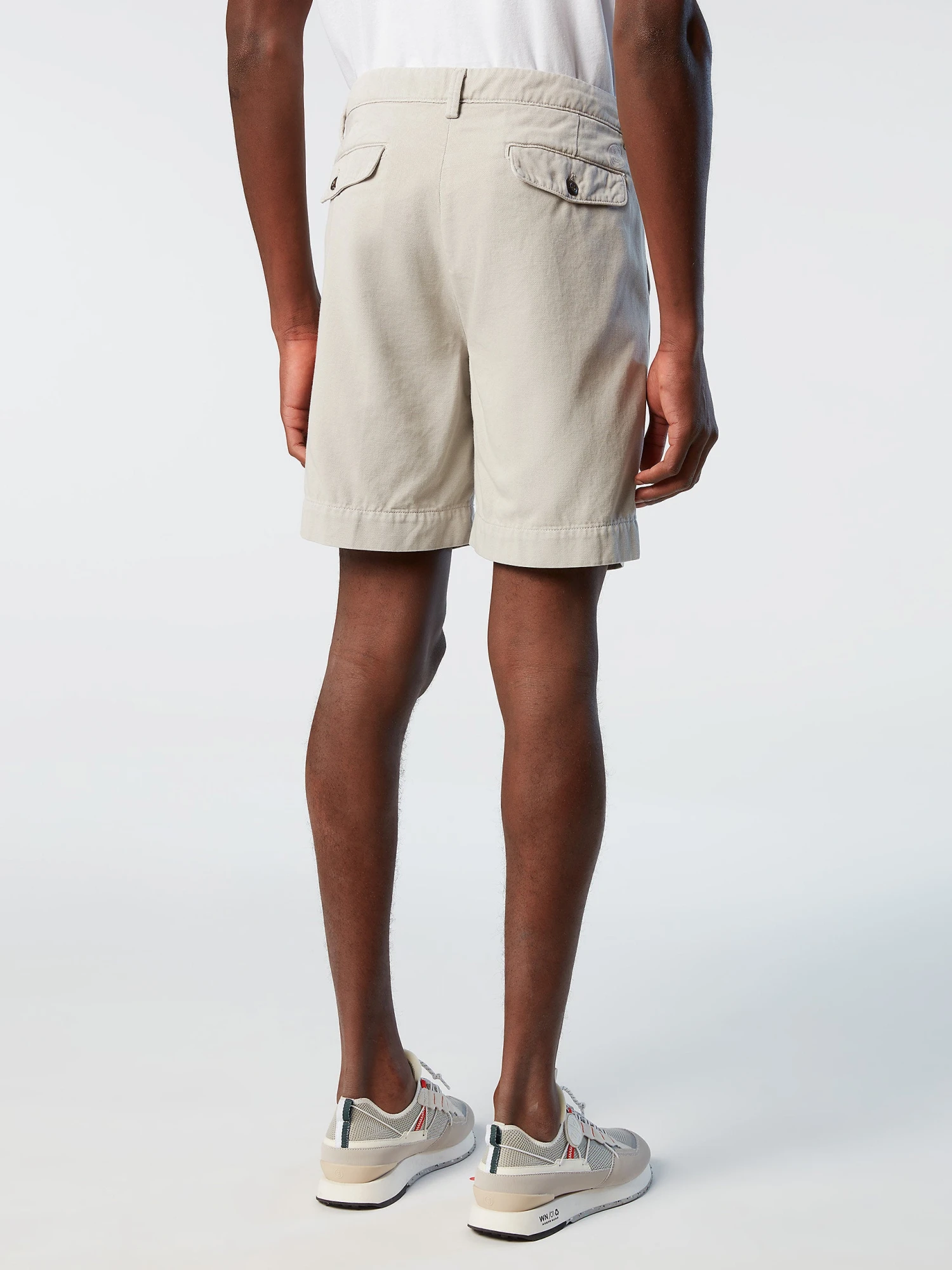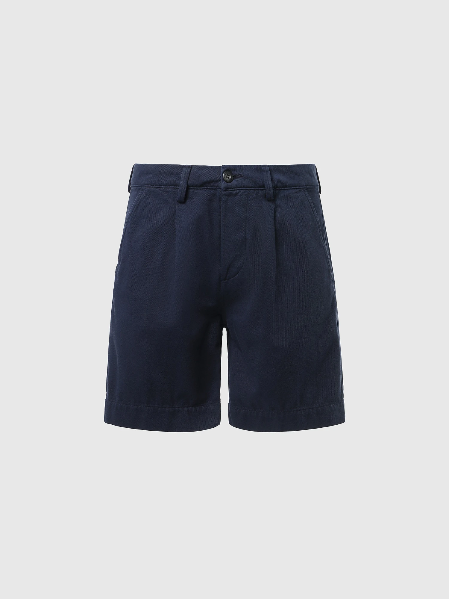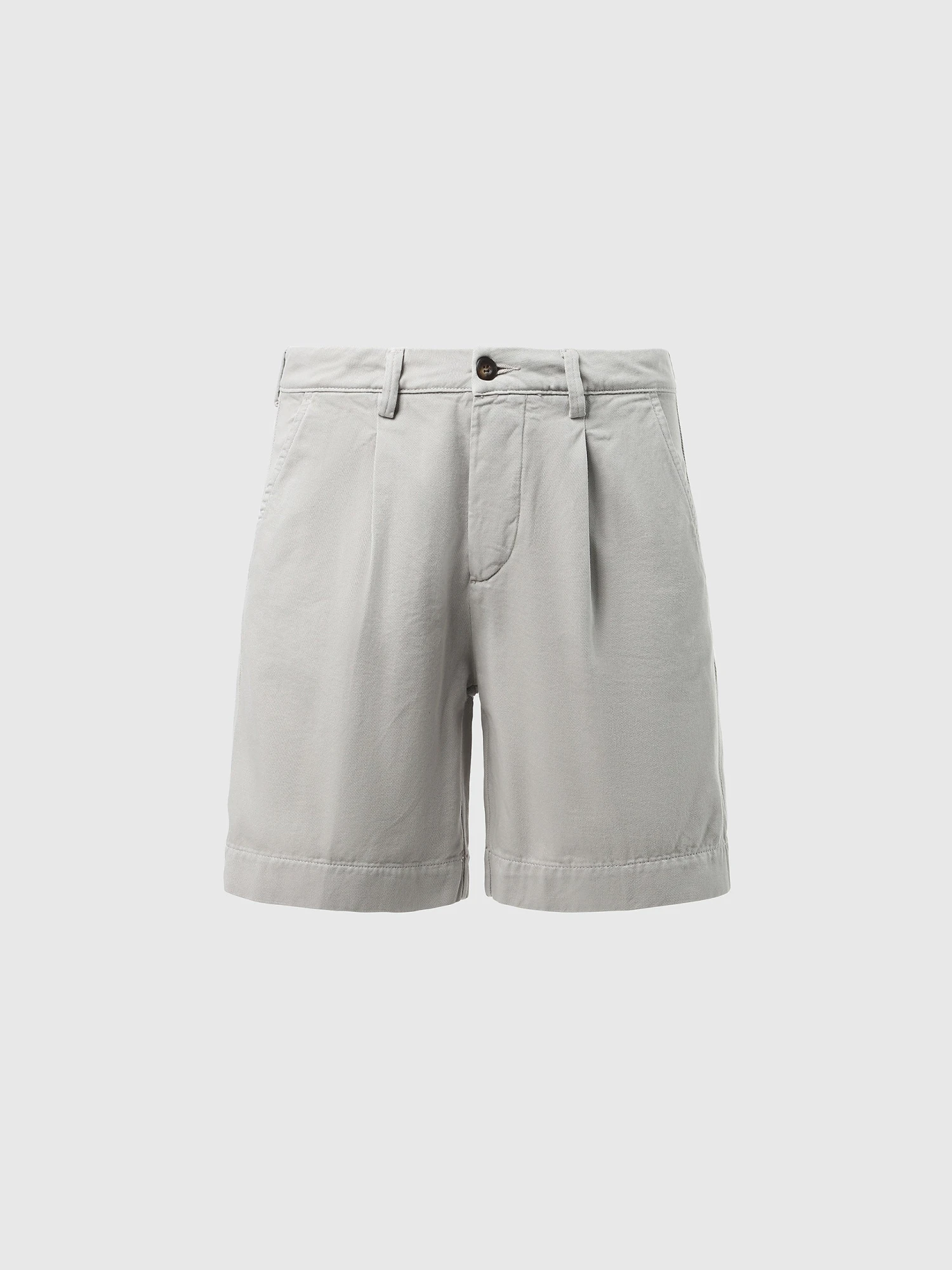 Chino shorts made from BCI cotton twill, styled with elegant front pleats. Back flap pockets and tonal embroidered logo.