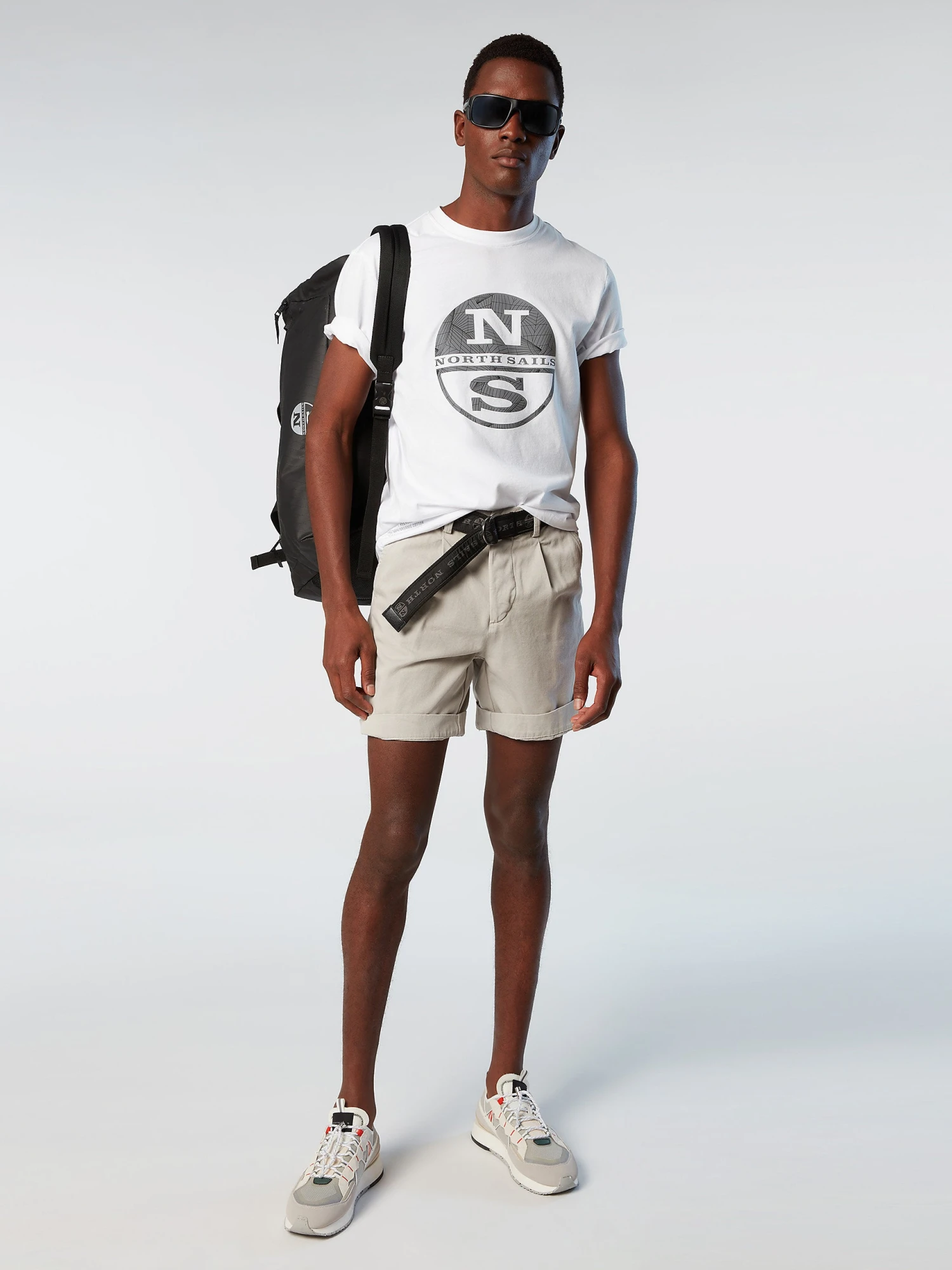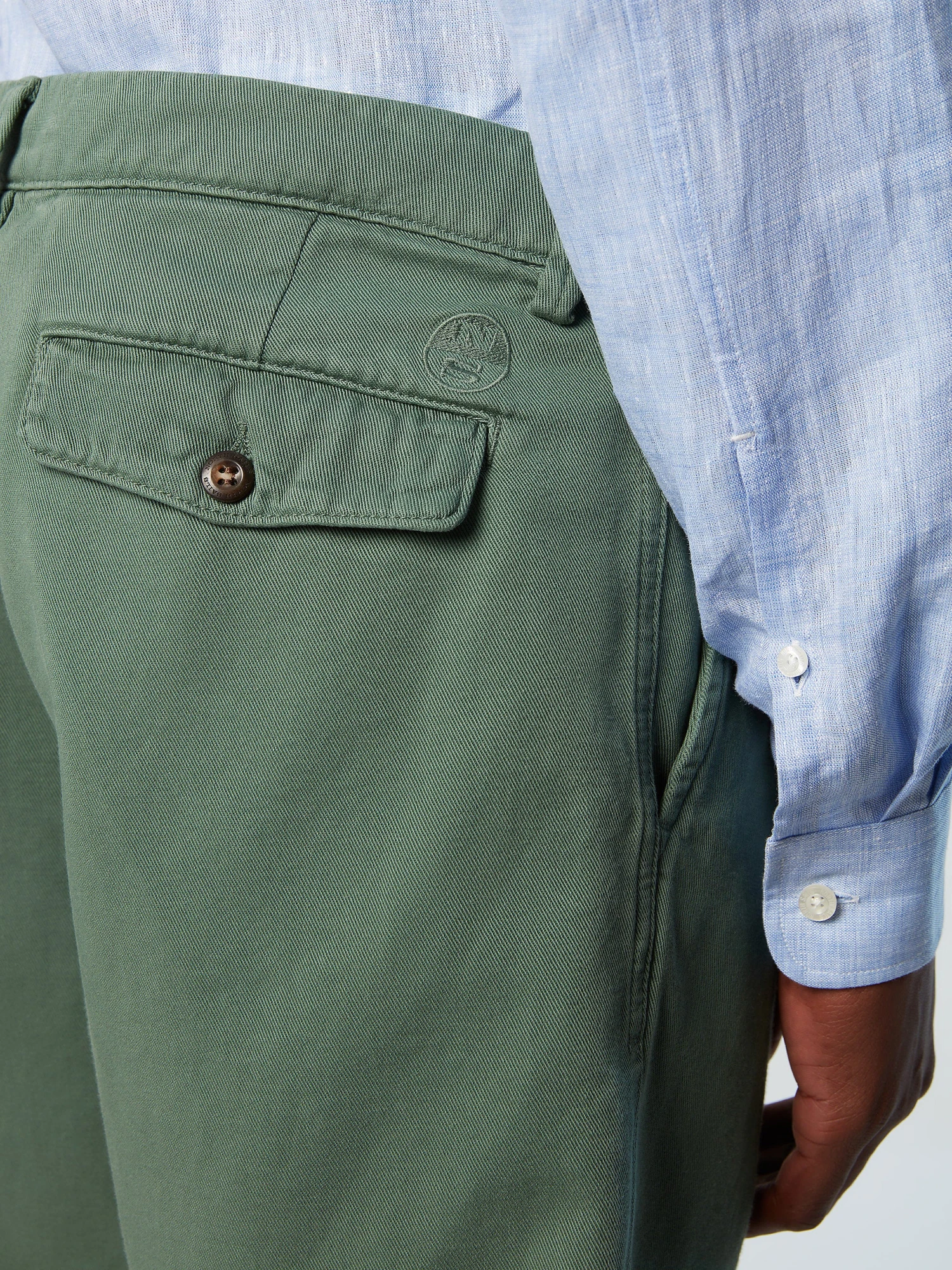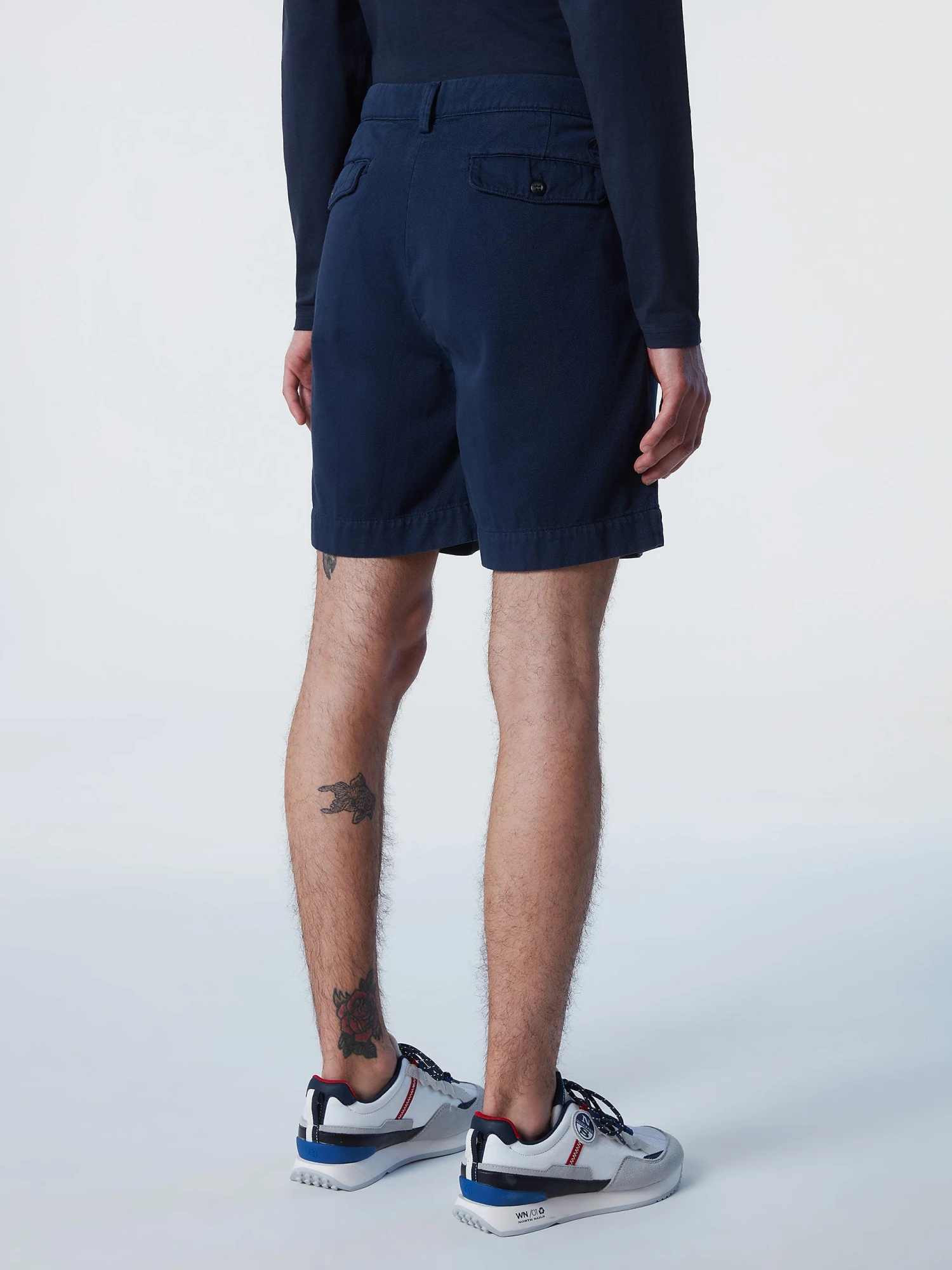 Chino shorts made from BCI cotton twill, styled with elegant front pleats. Back flap pockets and tonal embroidered logo.