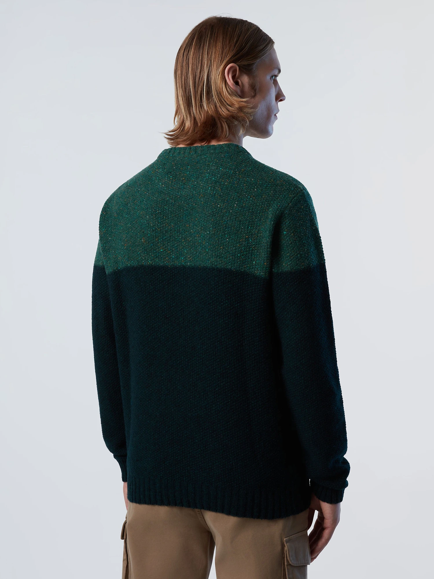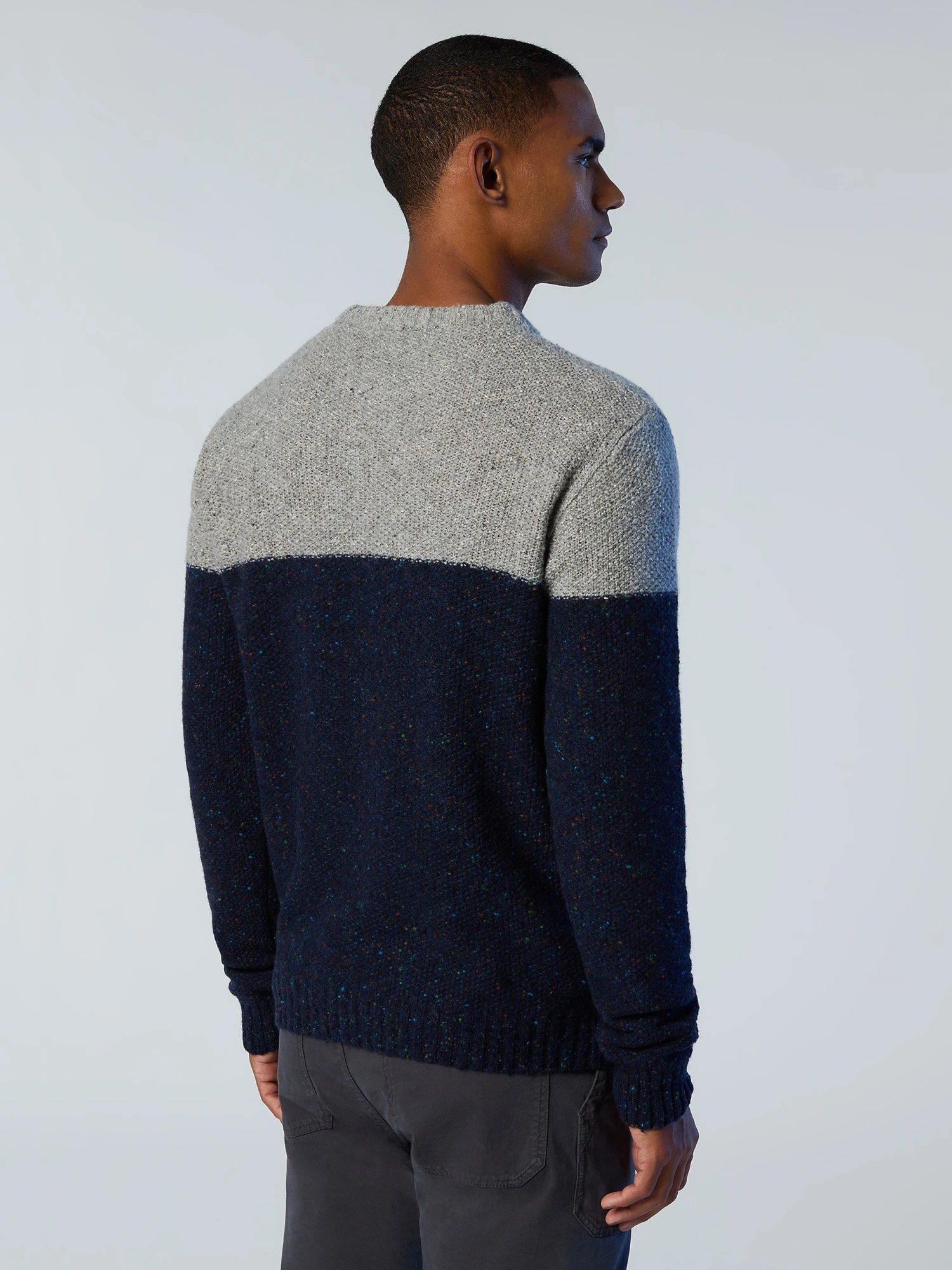 Men’s crew-neck sweater knitted from a recycled wool blend. Colour-block design, embellished with a logo patch on the sleeve.