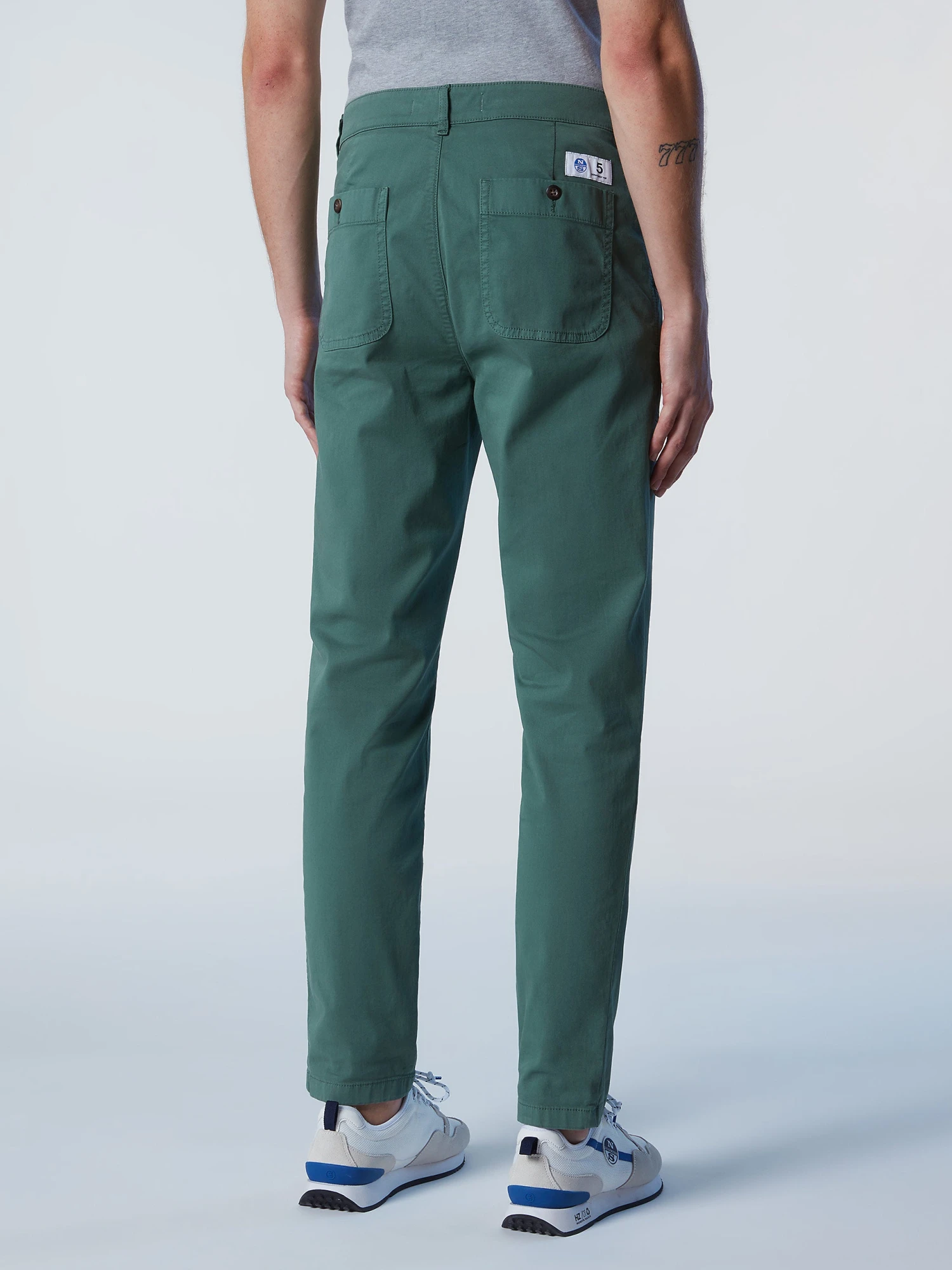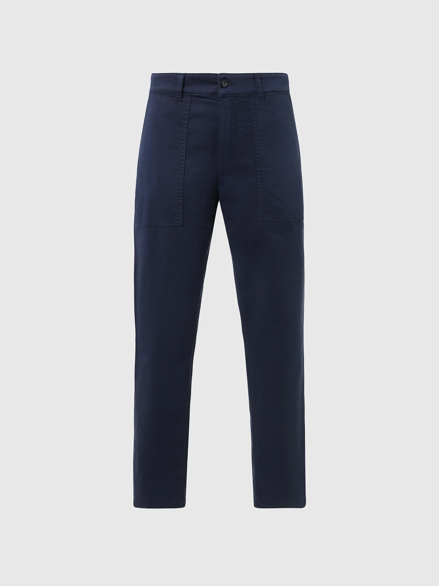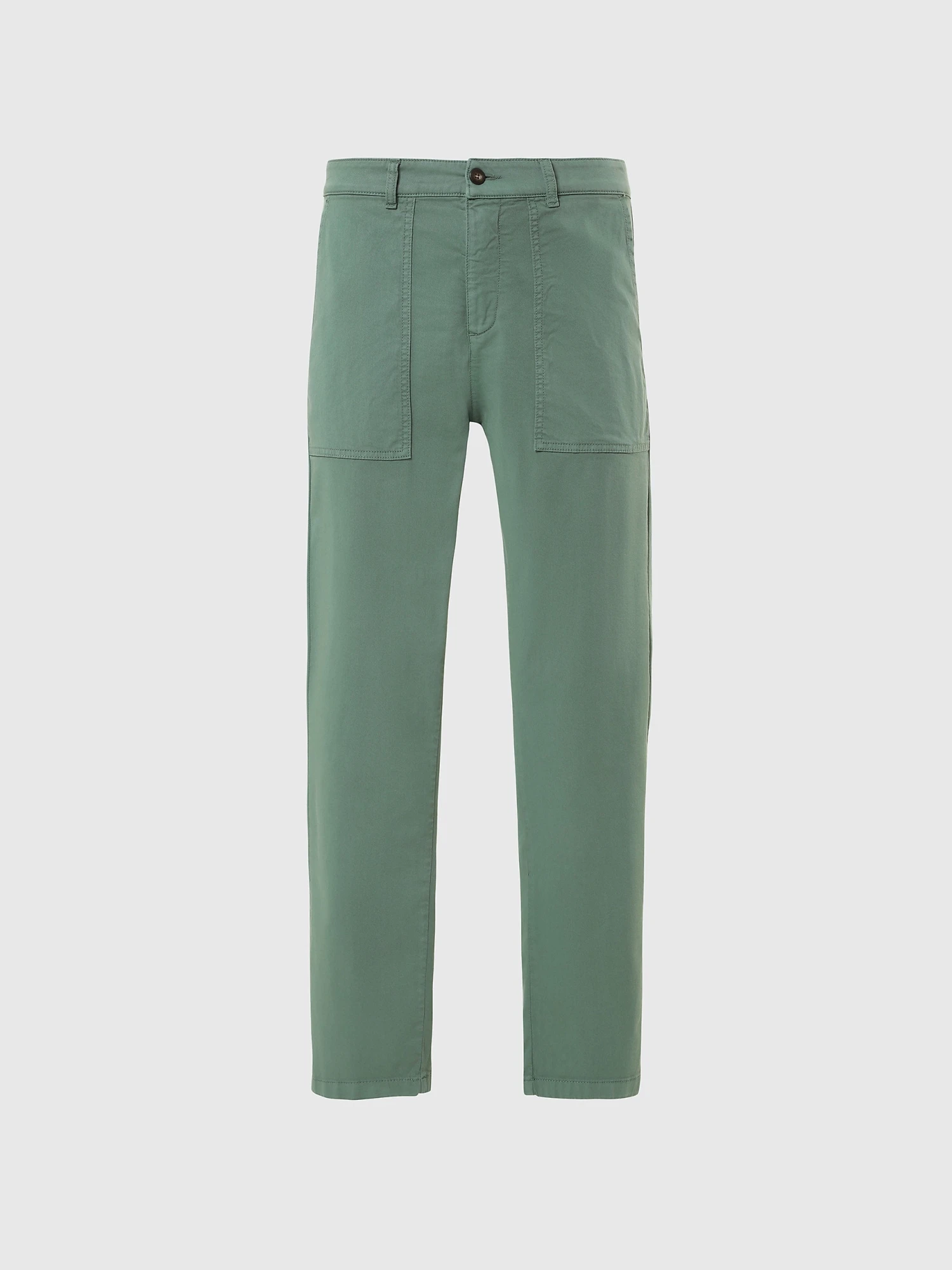 Men’s fatigue pants made from stretch organic cotton gabardine. Slim-fit straight-leg style with slant pockets and a tonal logo patch on the back.