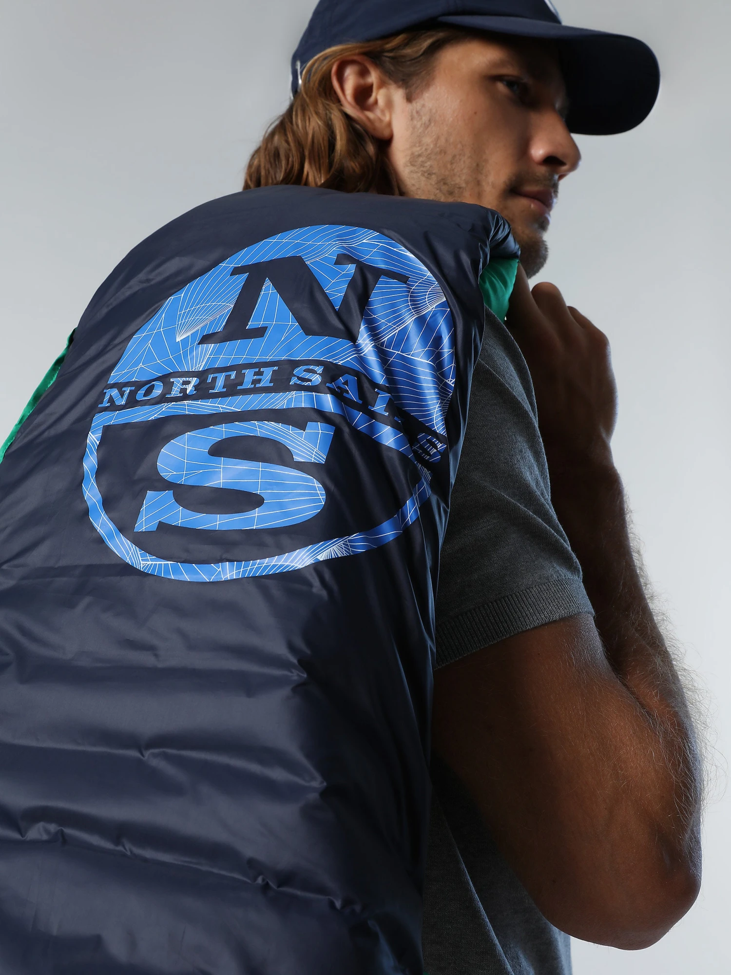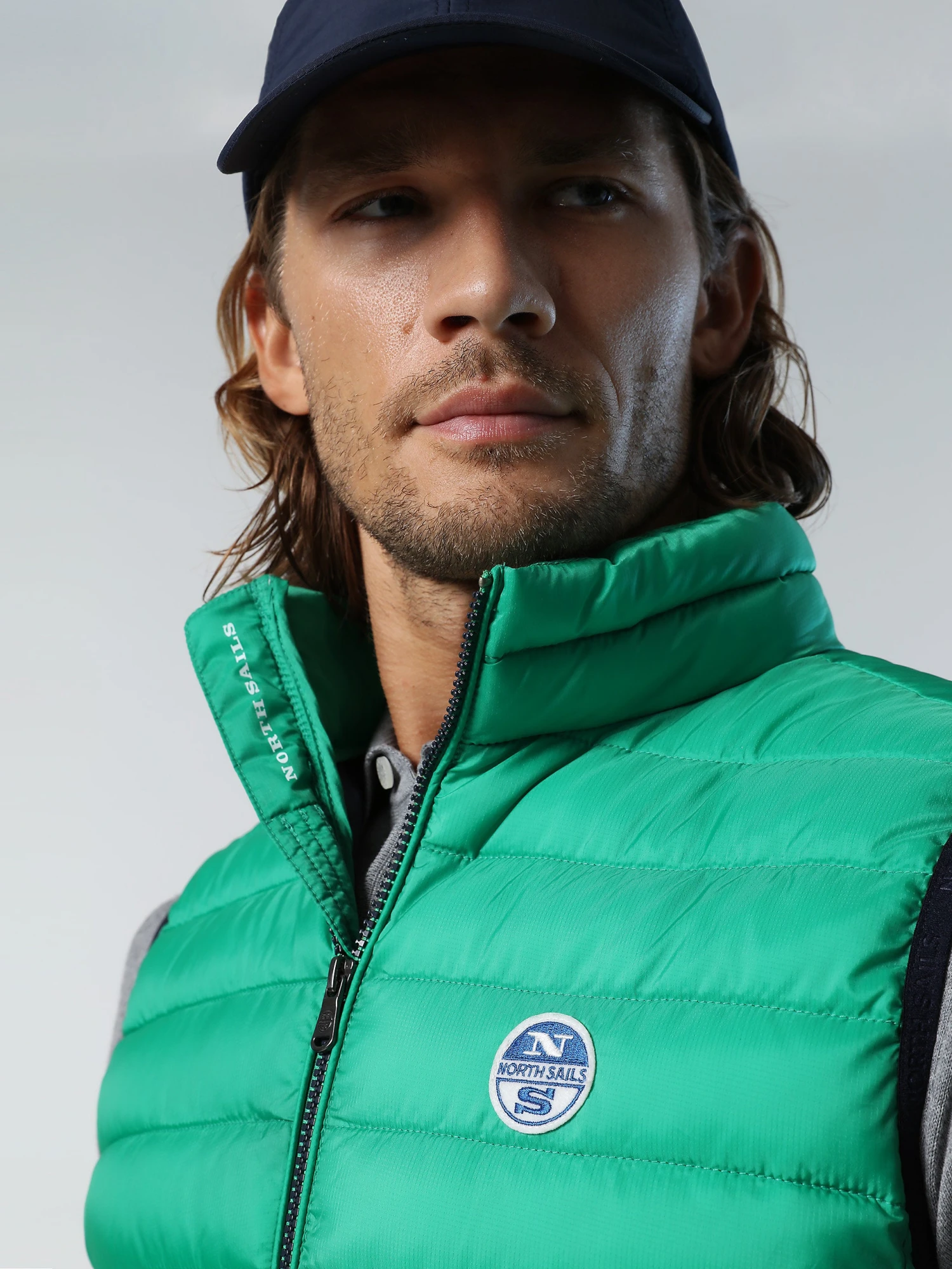 Men’s high-neck vest crafted from recycled micro-ripstop fabric with a water-repellent coating. Filled with Repreve padding: an innovative fibre made from recycled plastic bottles.