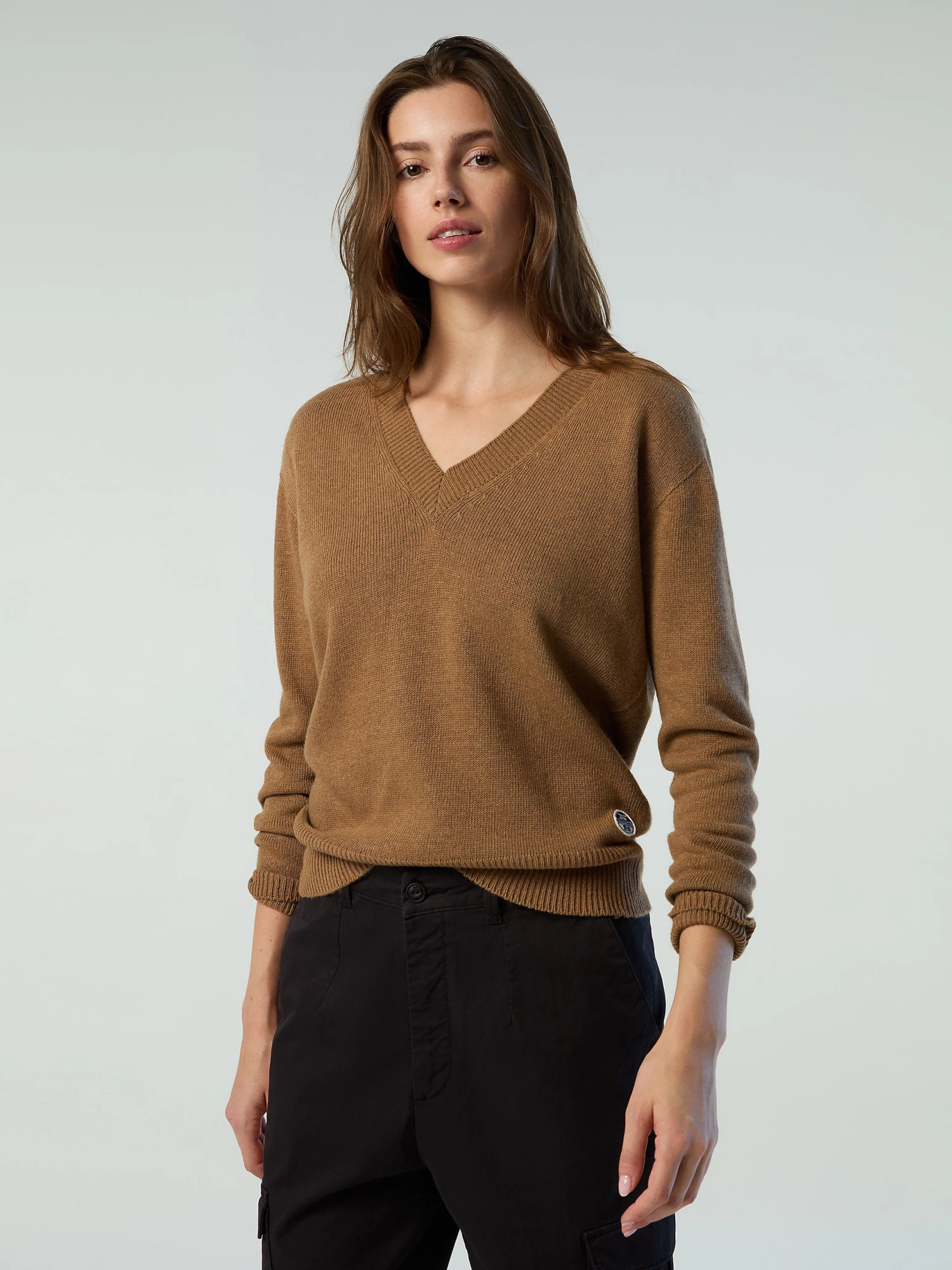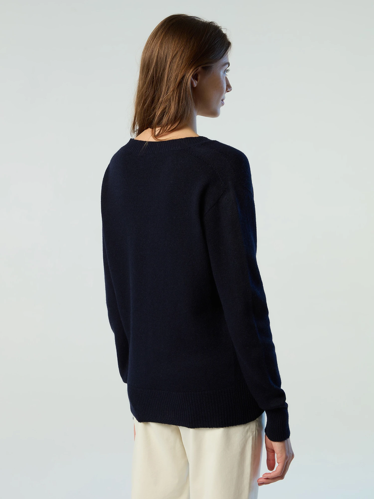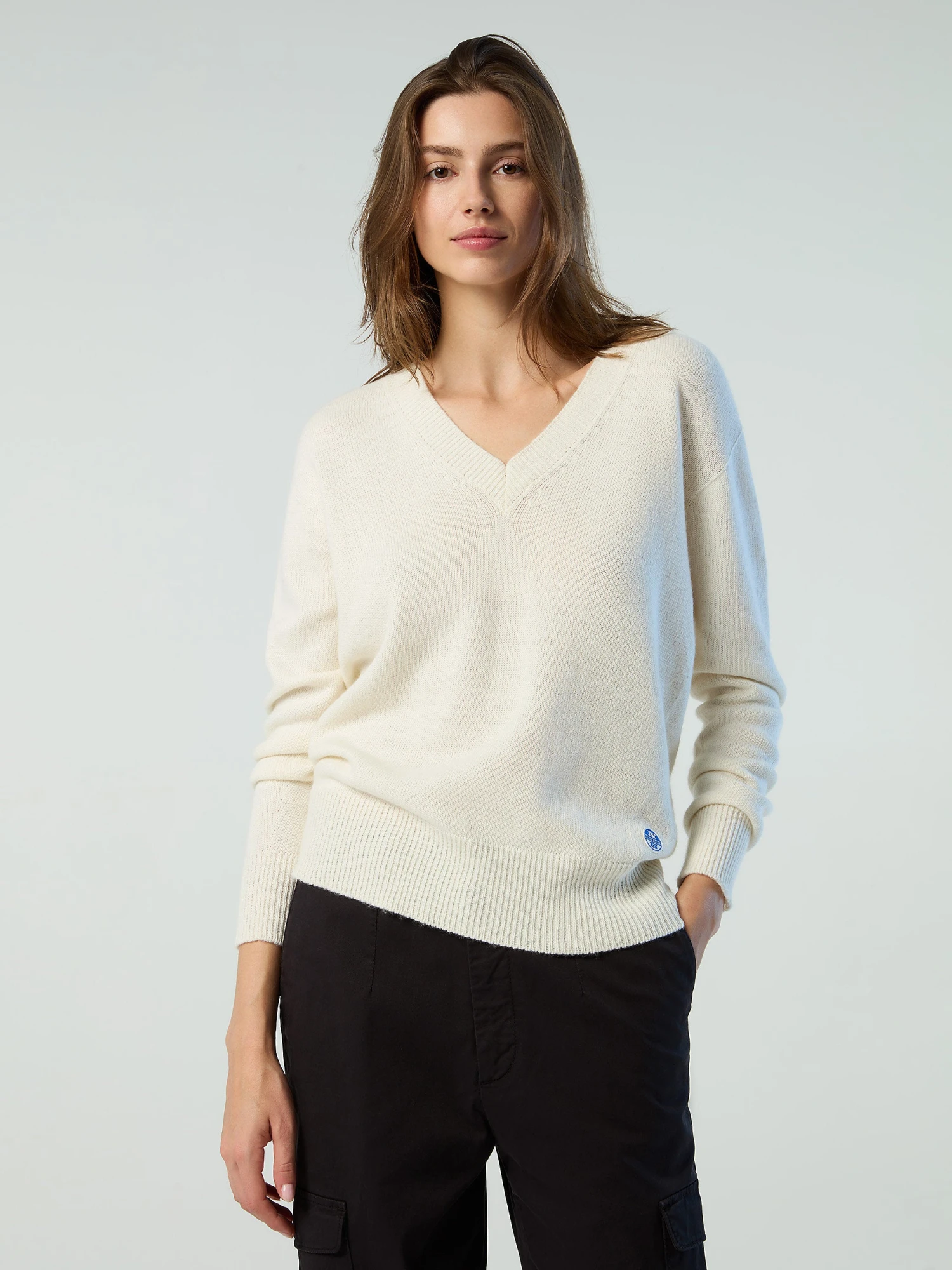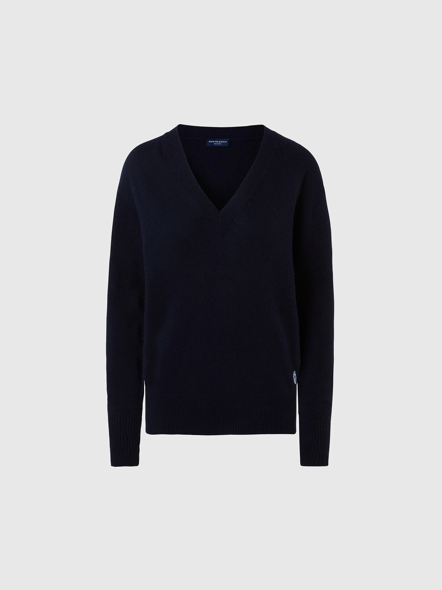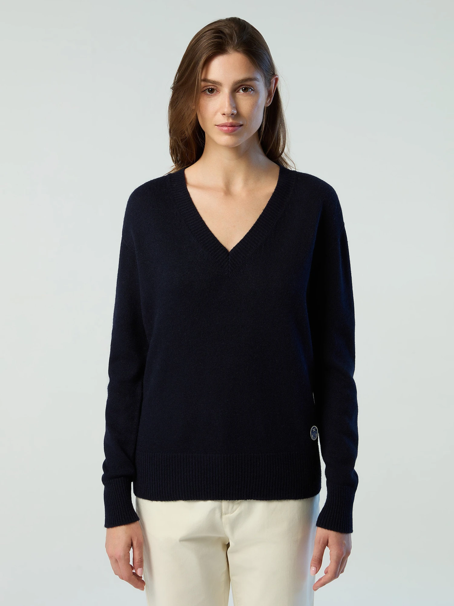 Women’s V-neck sweater knitted from a recycled cashmere blend. Finished with ribbed trims and a North Sails patch.