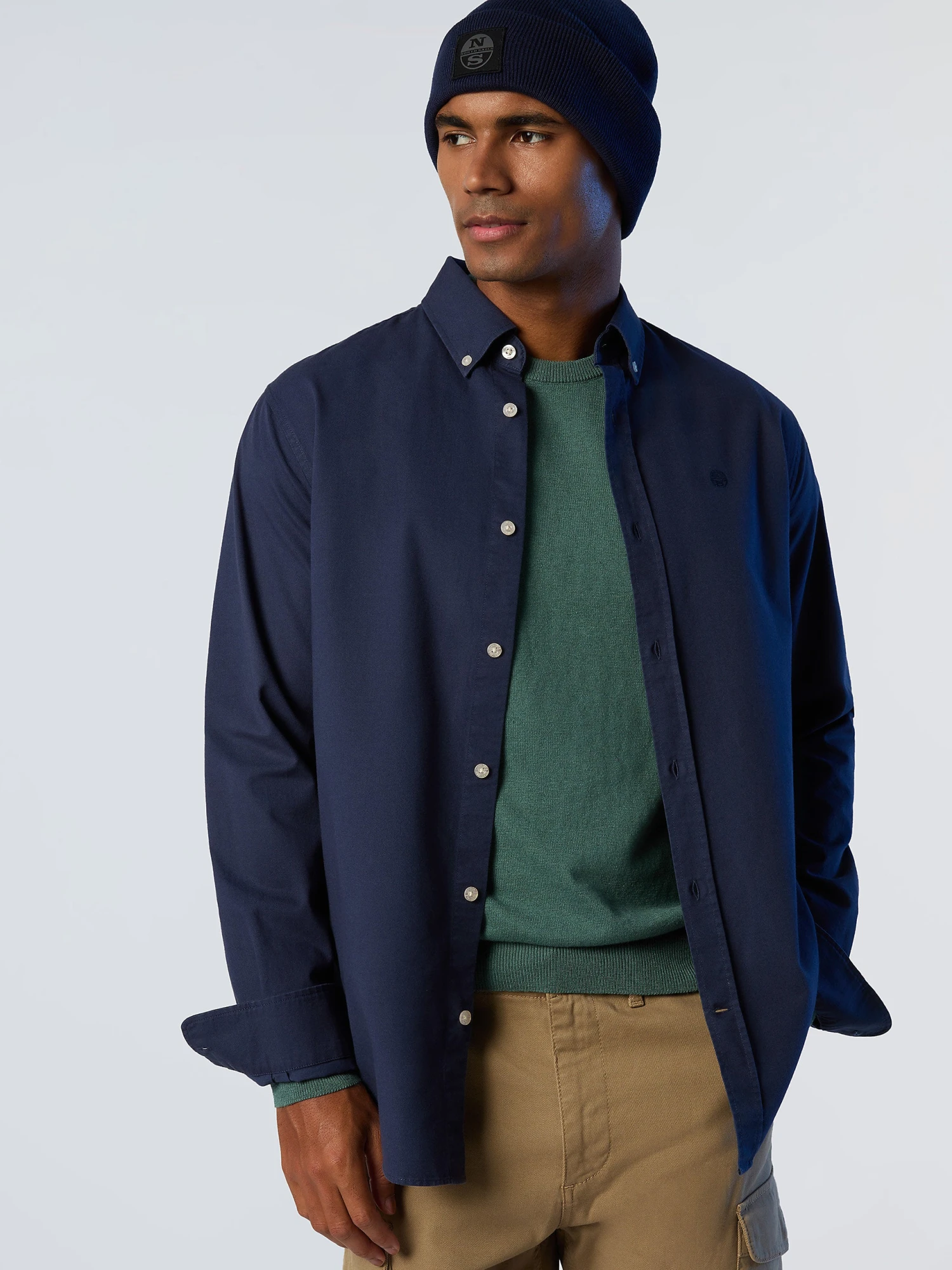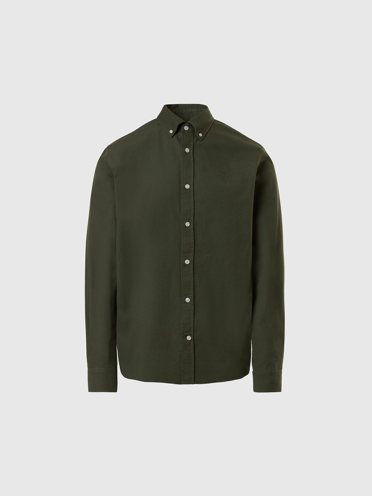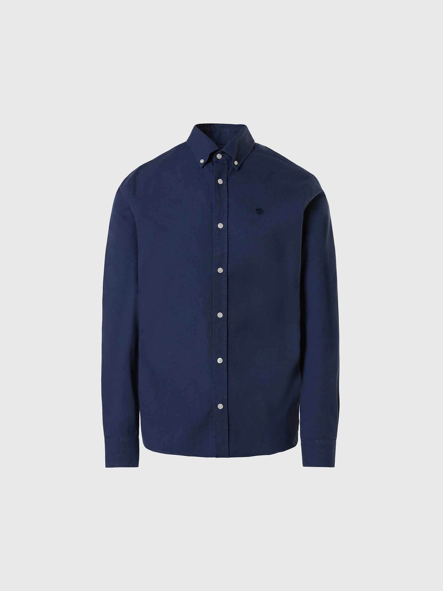 Men’s shirt made from recycled and organic cotton. Garment-dyed and embellished with an embroidered logo on the chest.