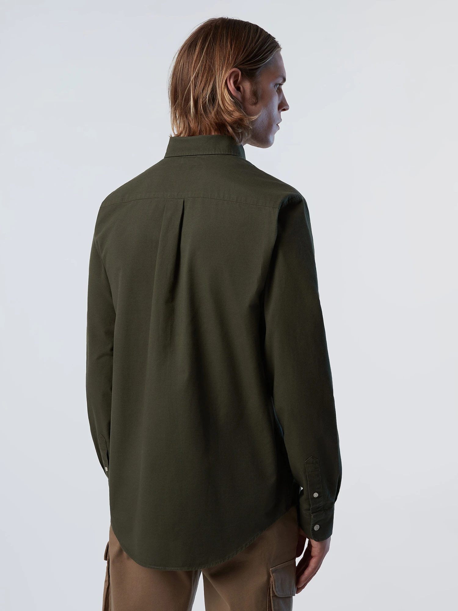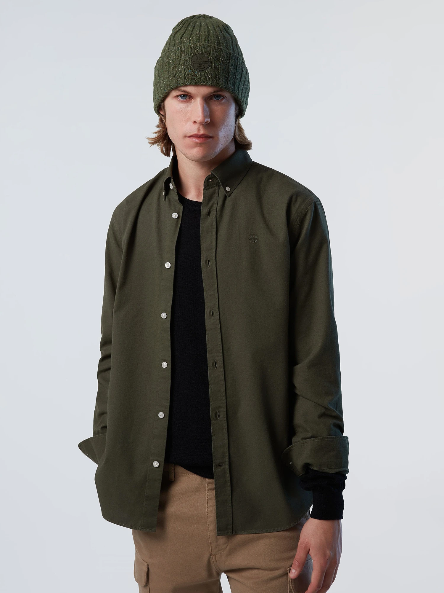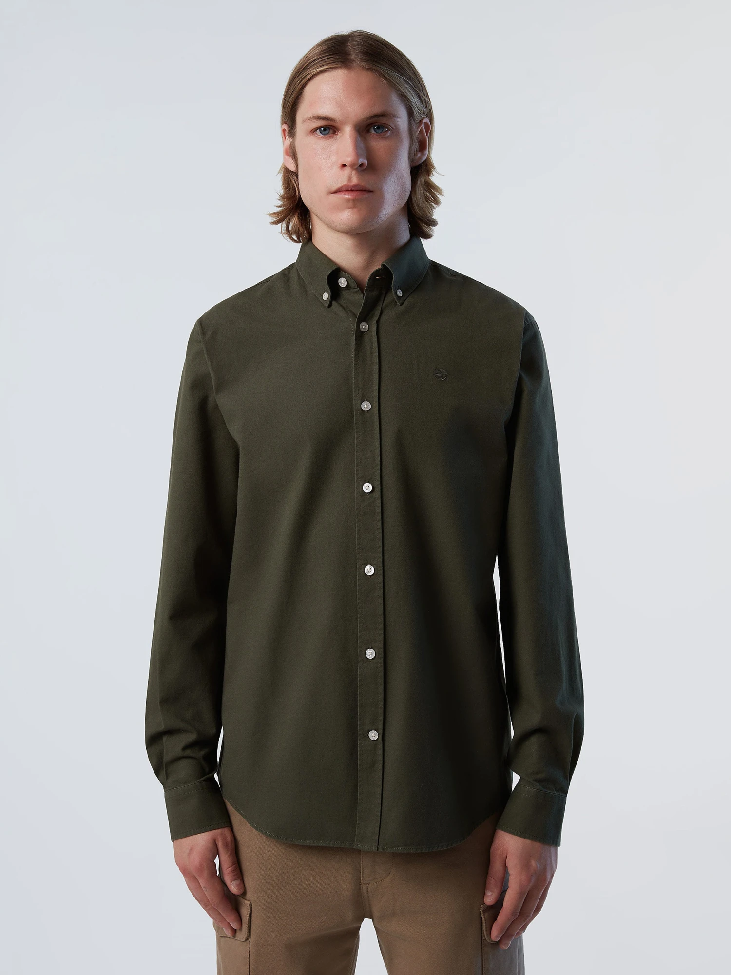 Men’s shirt made from recycled and organic cotton. Garment-dyed and embellished with an embroidered logo on the chest.