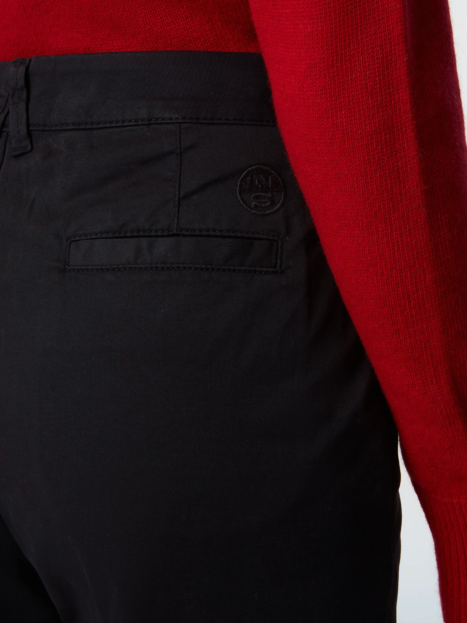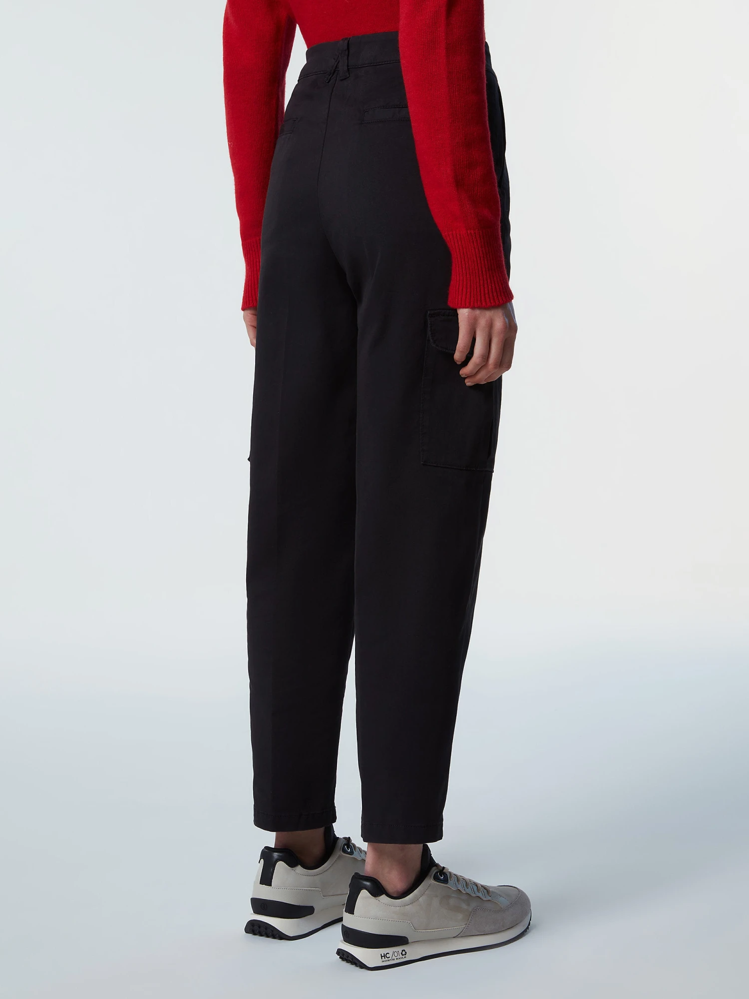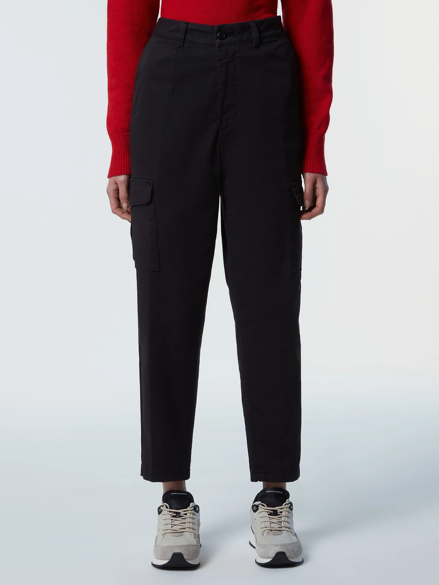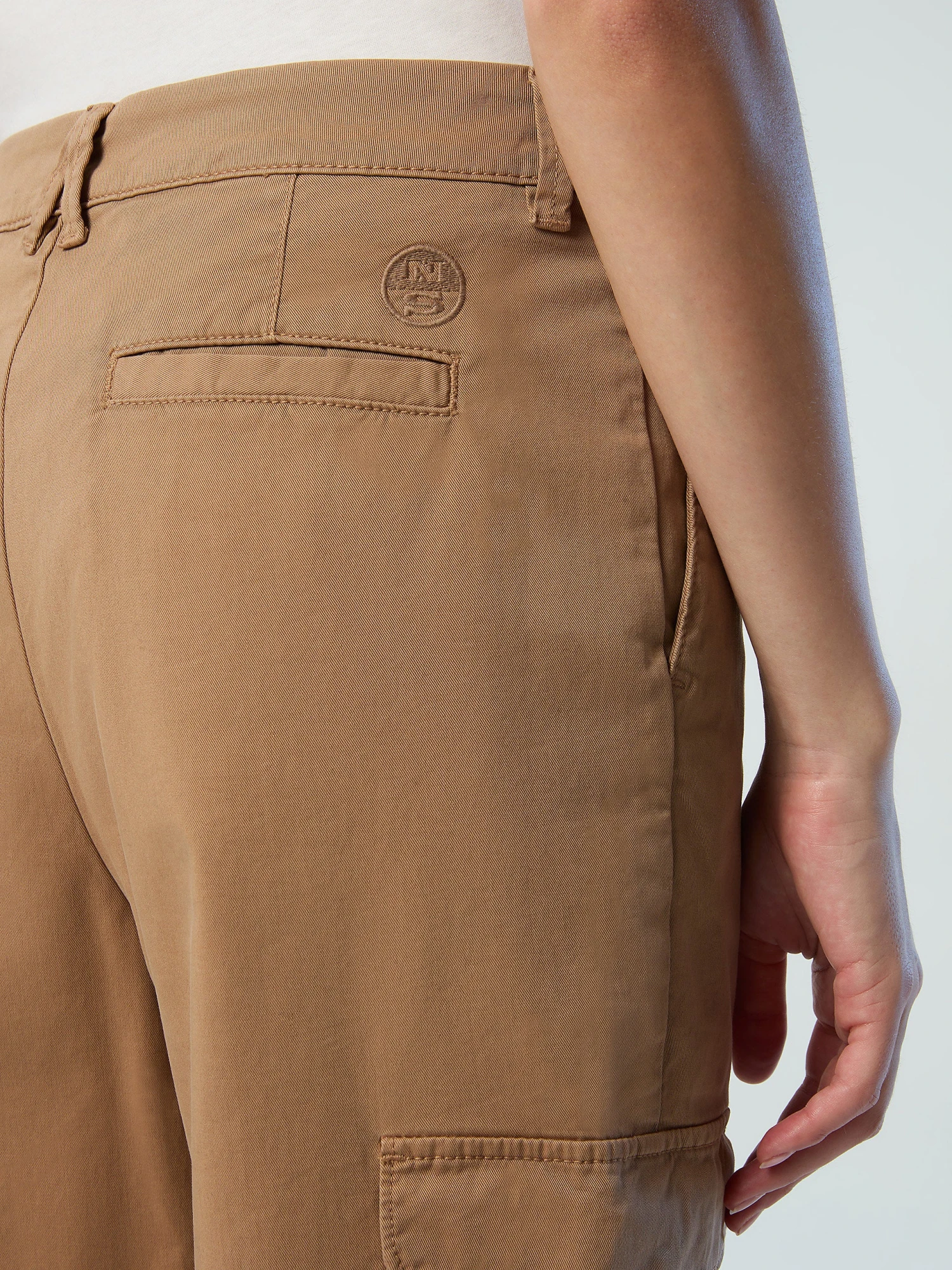 Women’s cargo pants made from stretch organic cotton gabardine. Straight-leg silhouette with belt loops and patch pockets. Embellished with an embroidered logo detail.