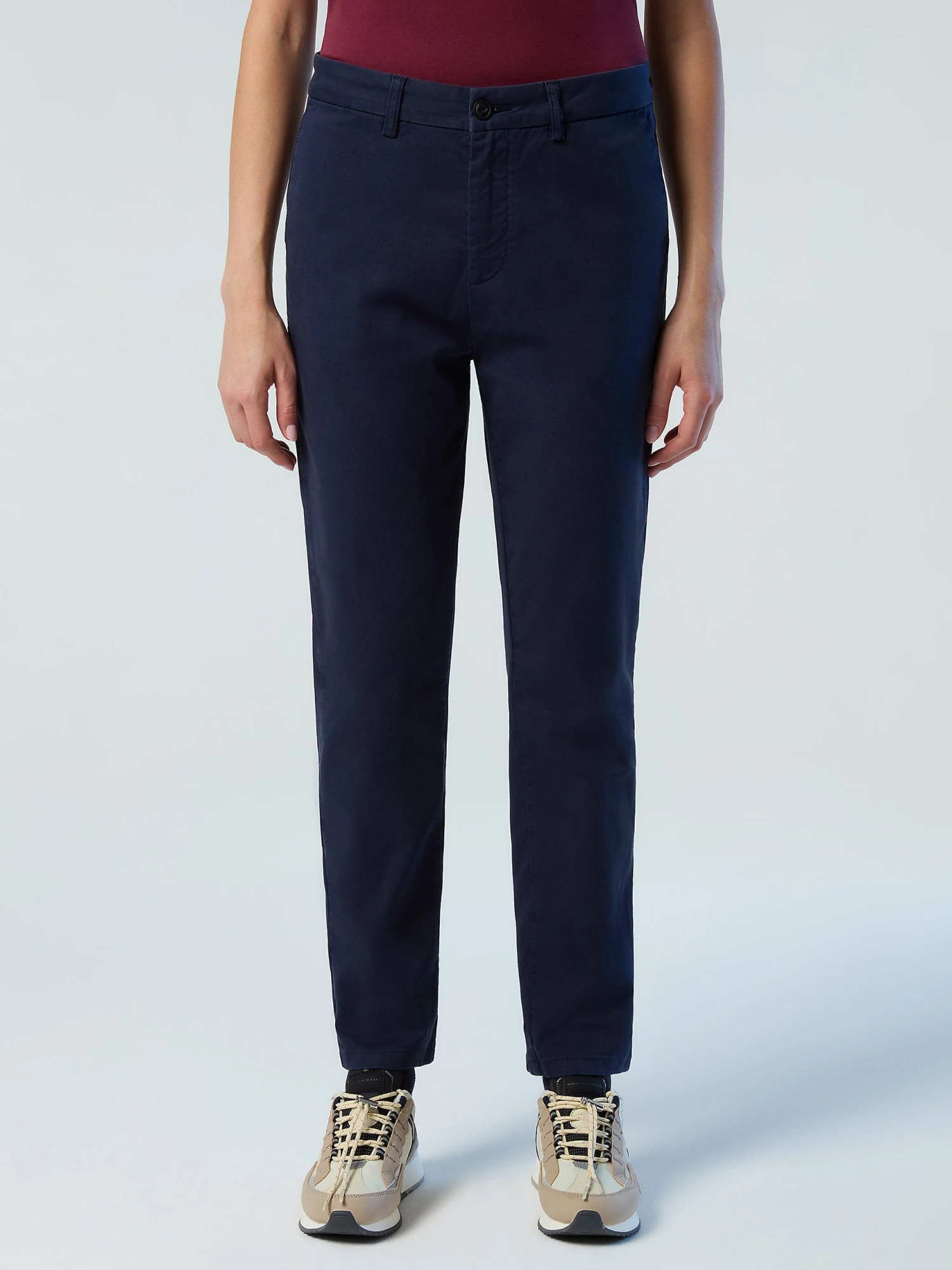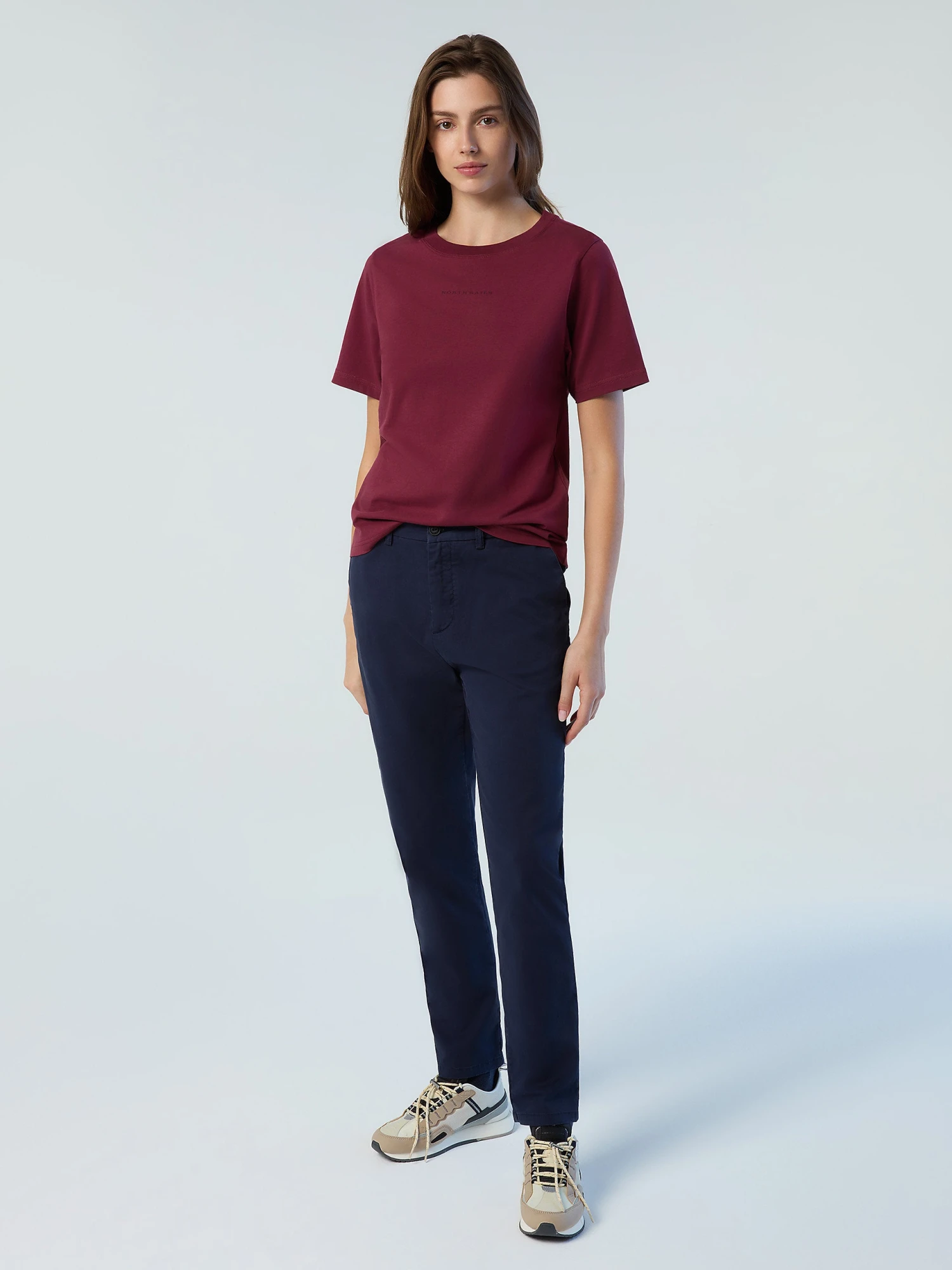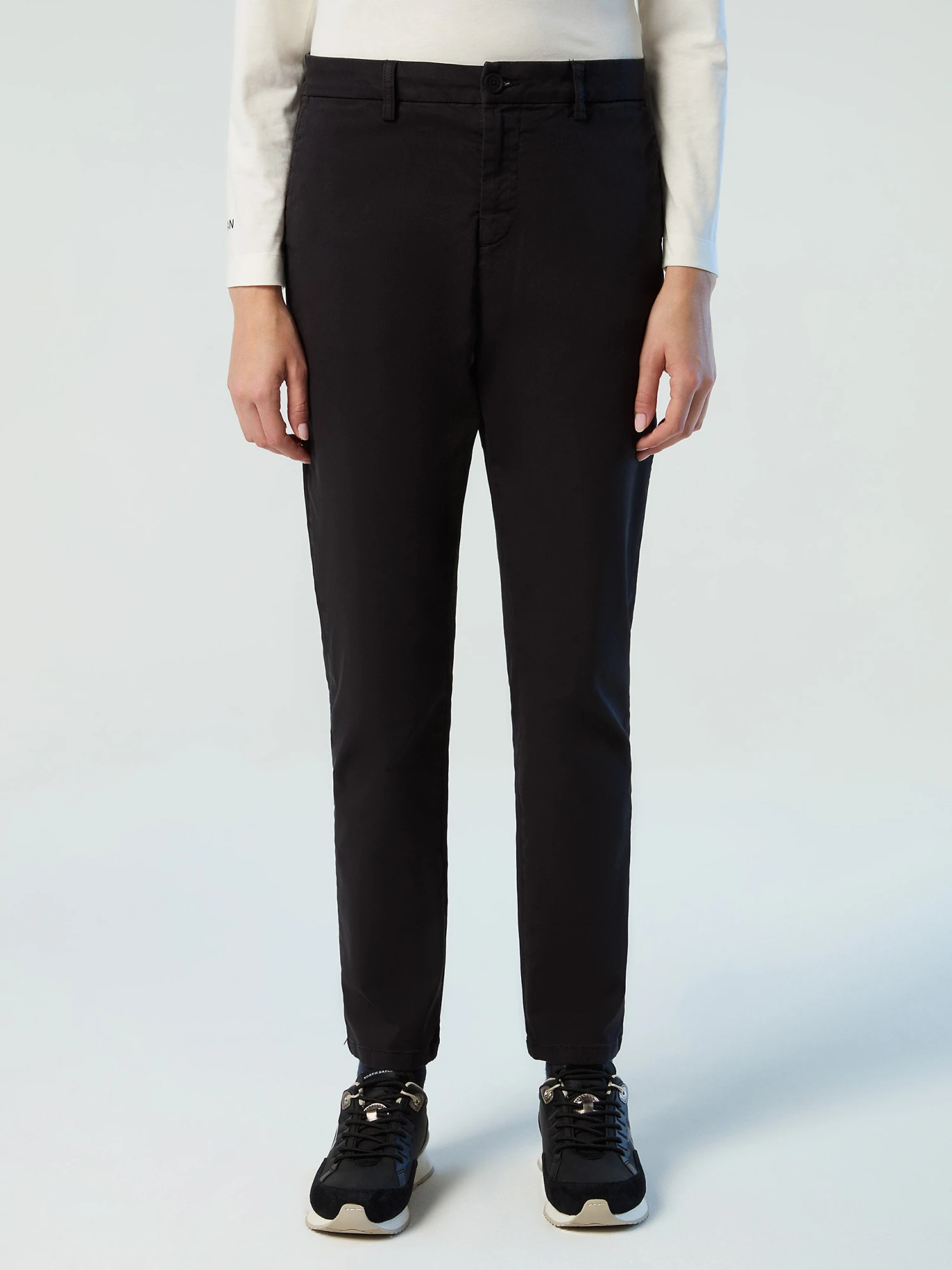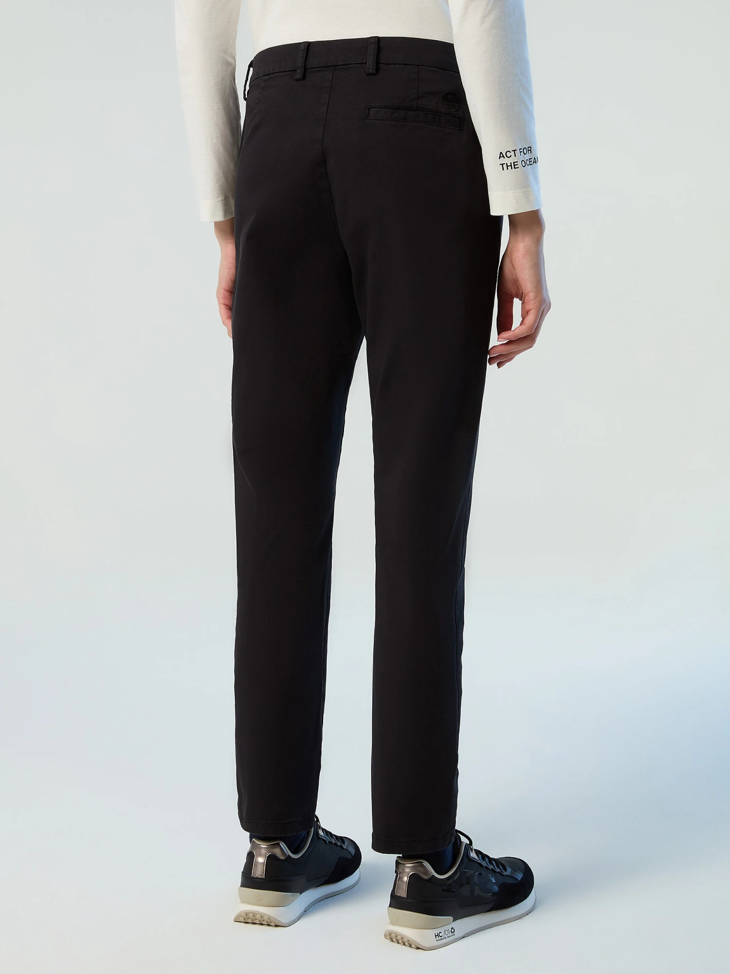 Women’s chinos made from stretch organic cotton gabardine. Straight-leg silhouette with belt loops and slant pockets. Embellished with an embroidered logo detail.