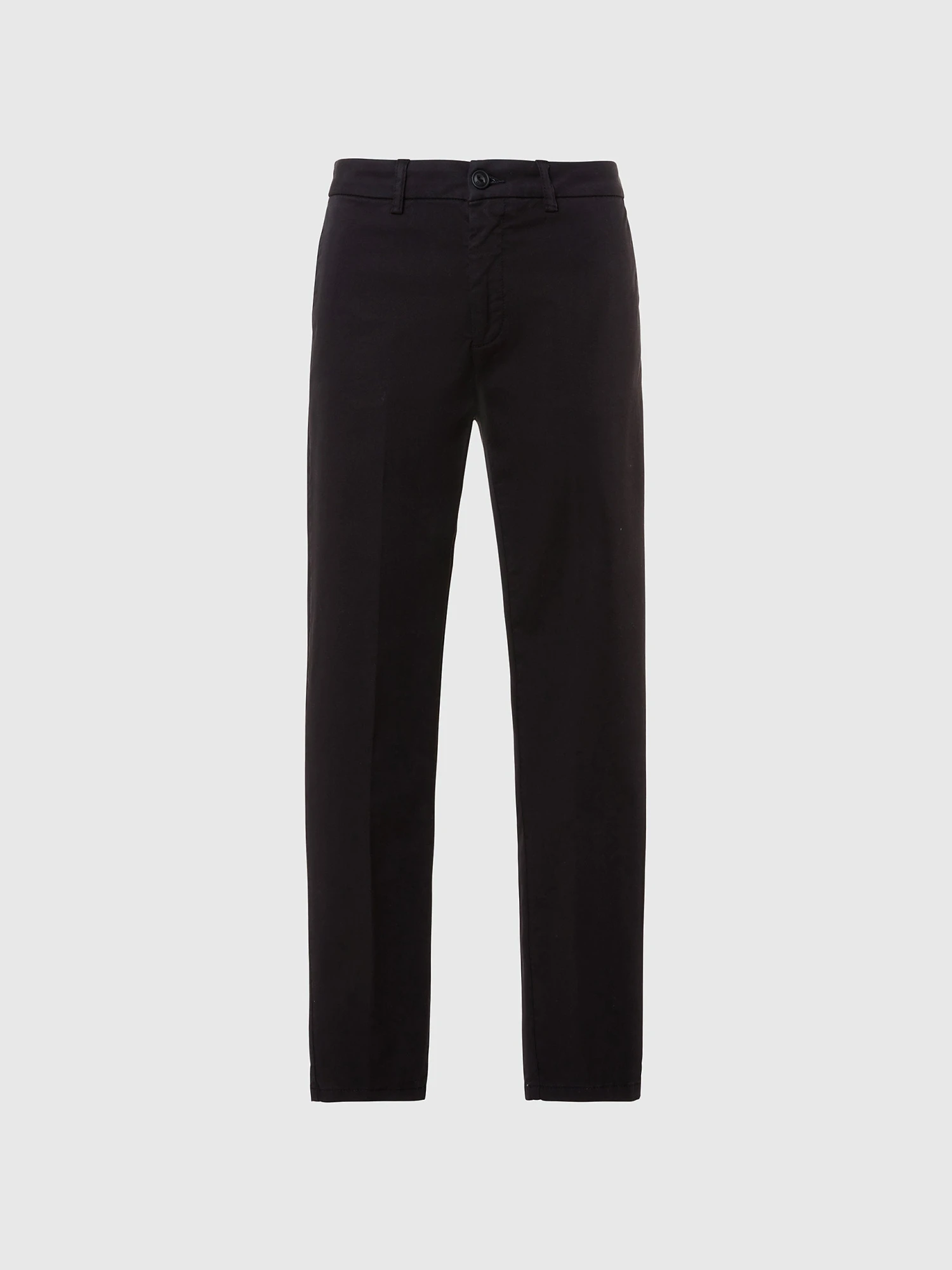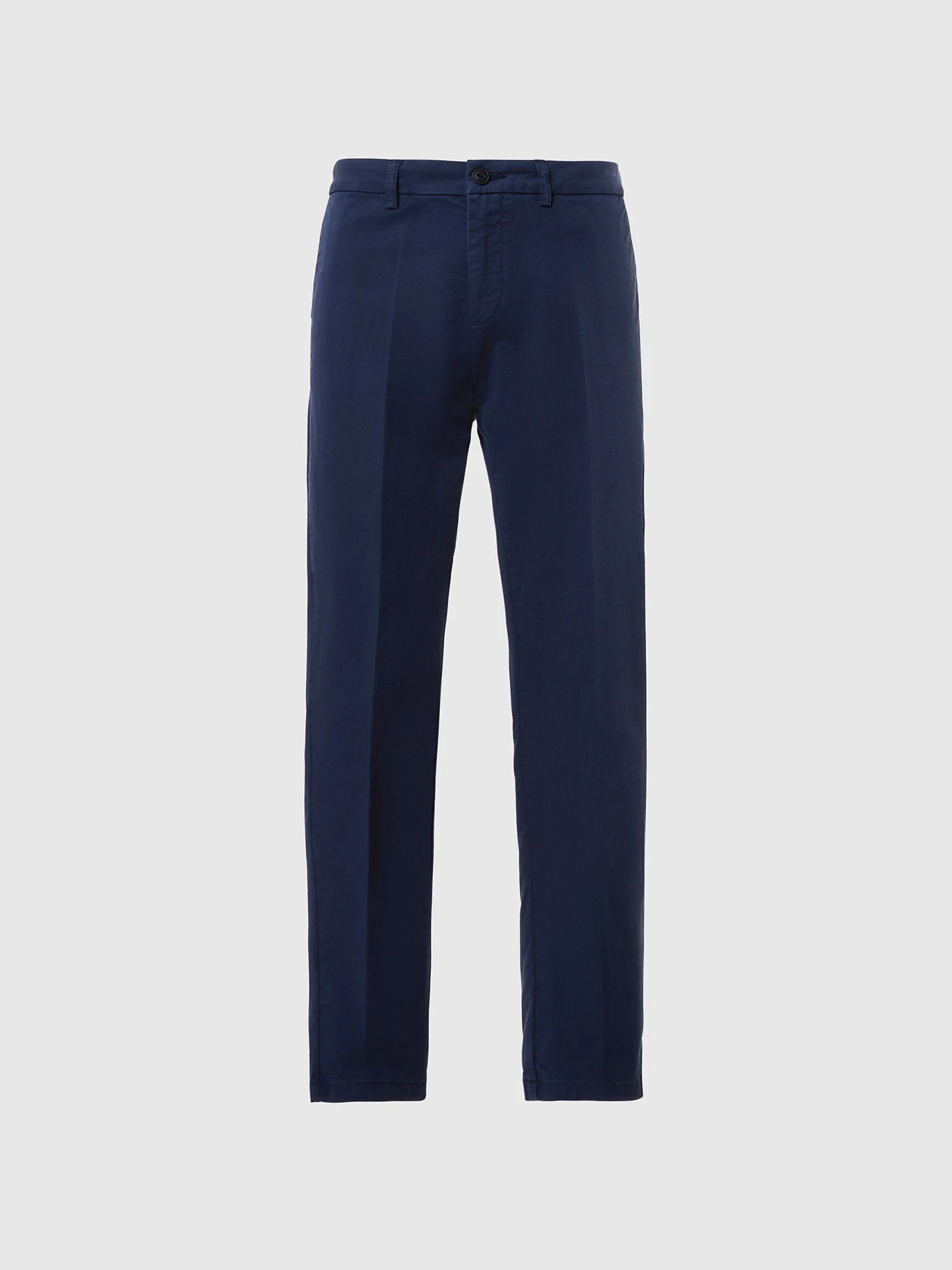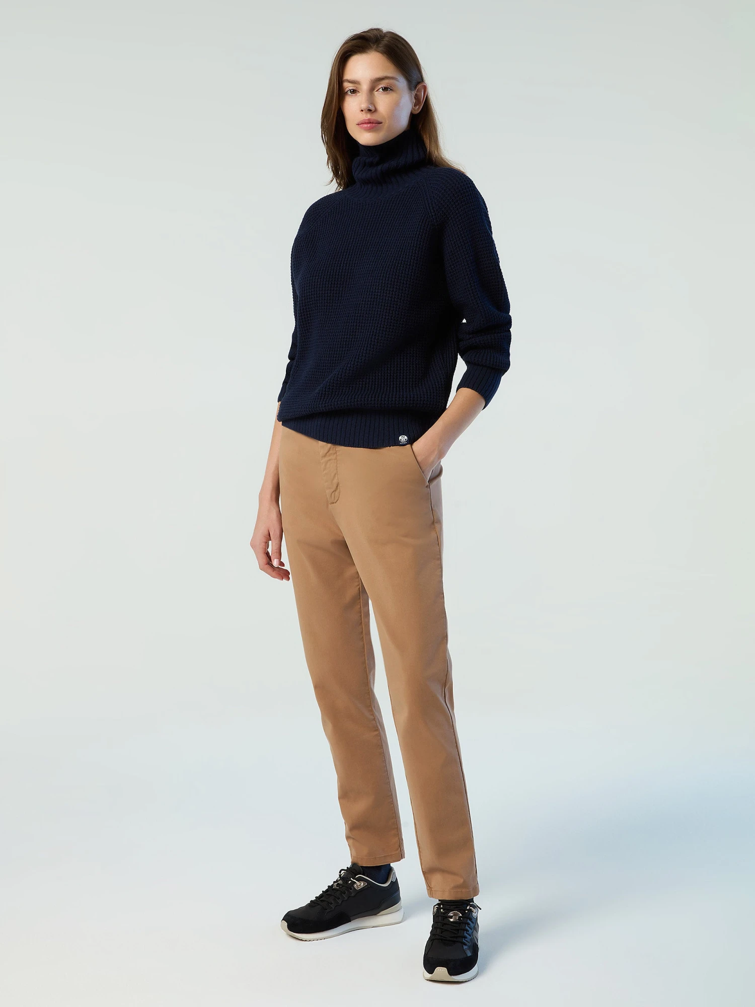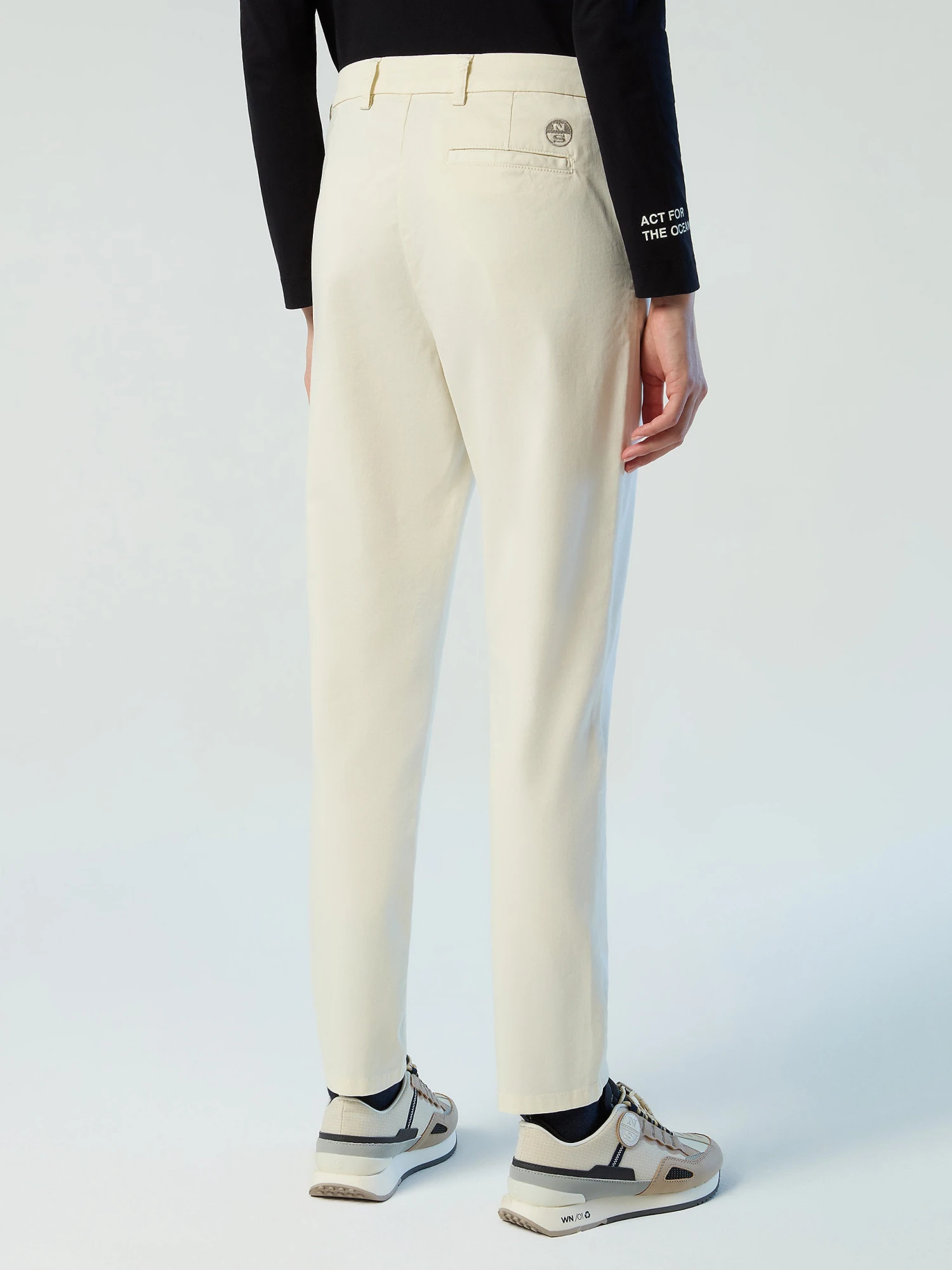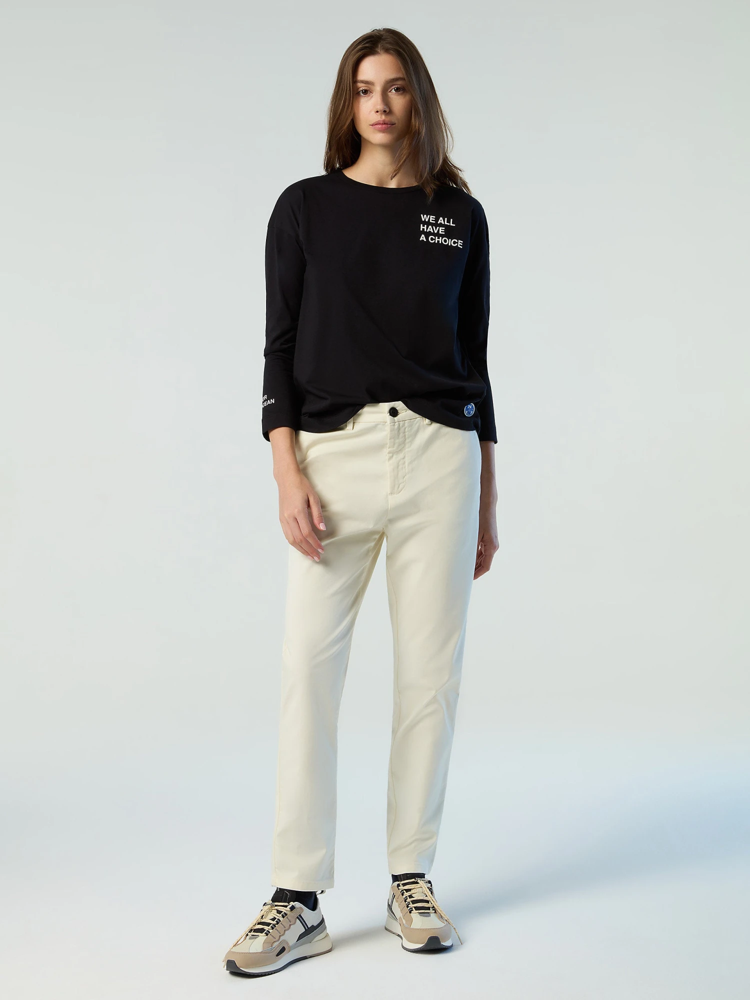 Women’s chinos made from stretch organic cotton gabardine. Straight-leg silhouette with belt loops and slant pockets. Embellished with an embroidered logo detail.
