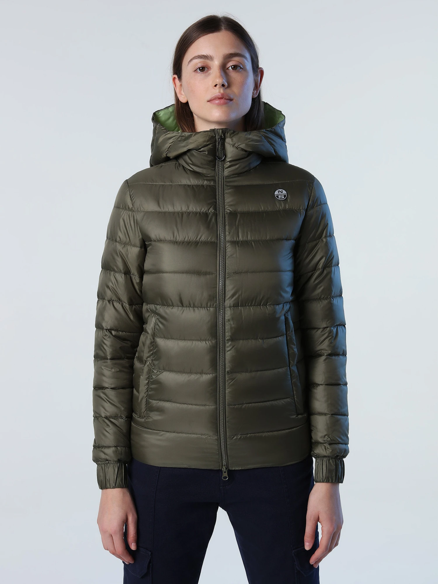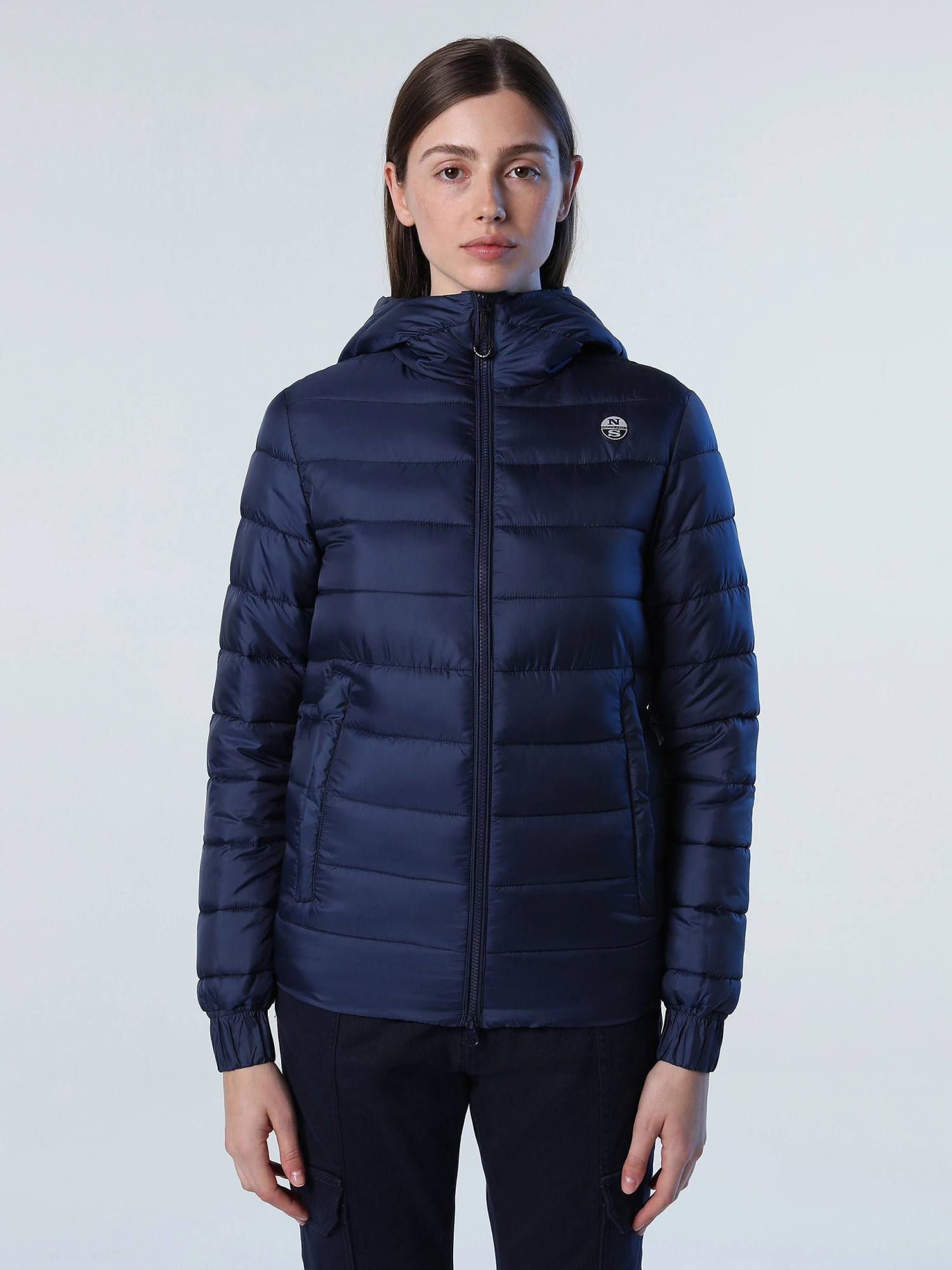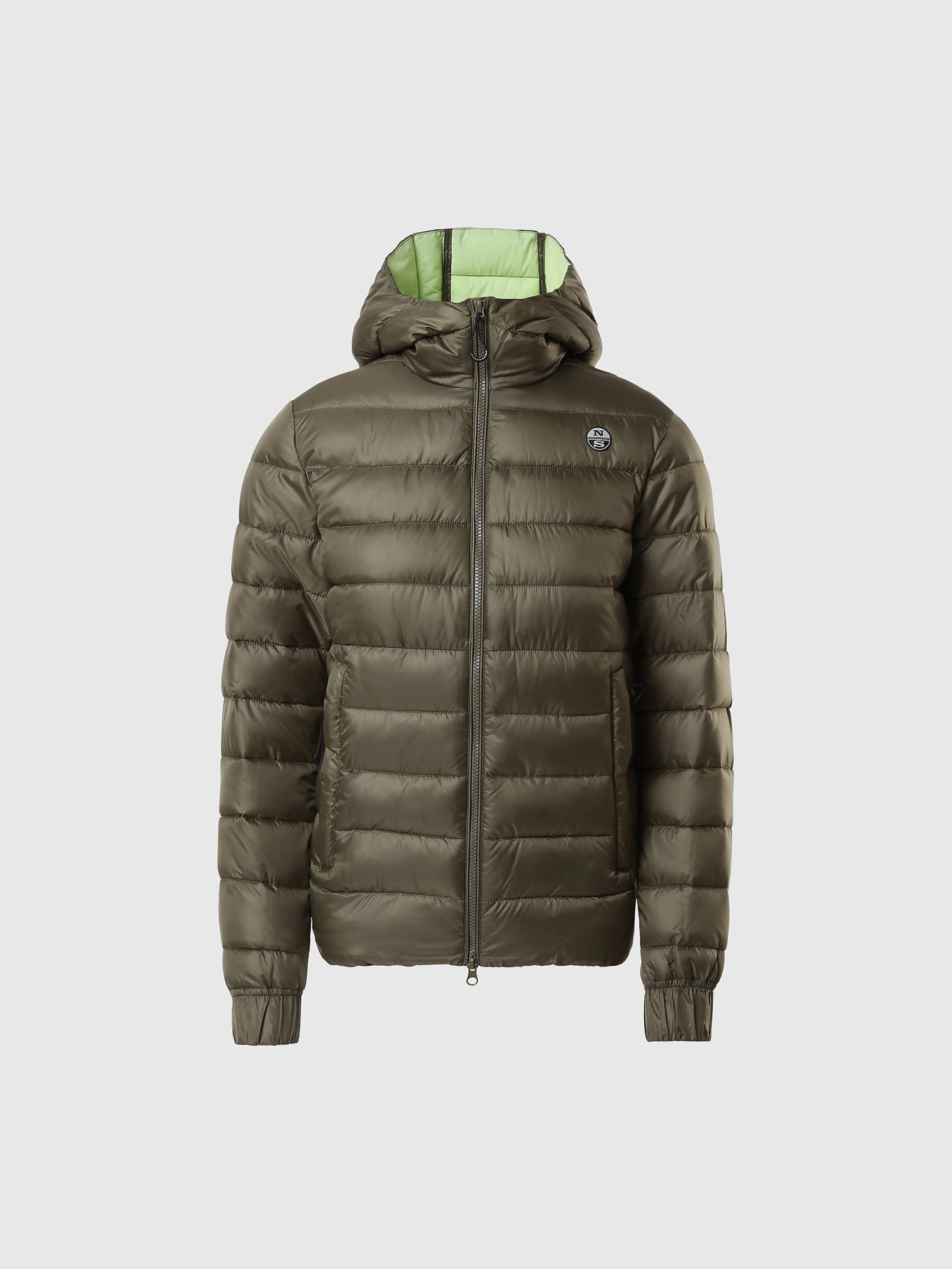 Puffer jacket made from recycled nylon micro-ripstop with striped quilting. Finished with a detachable hood, drawstring waist and reflective North Sails logo on the sleeve.