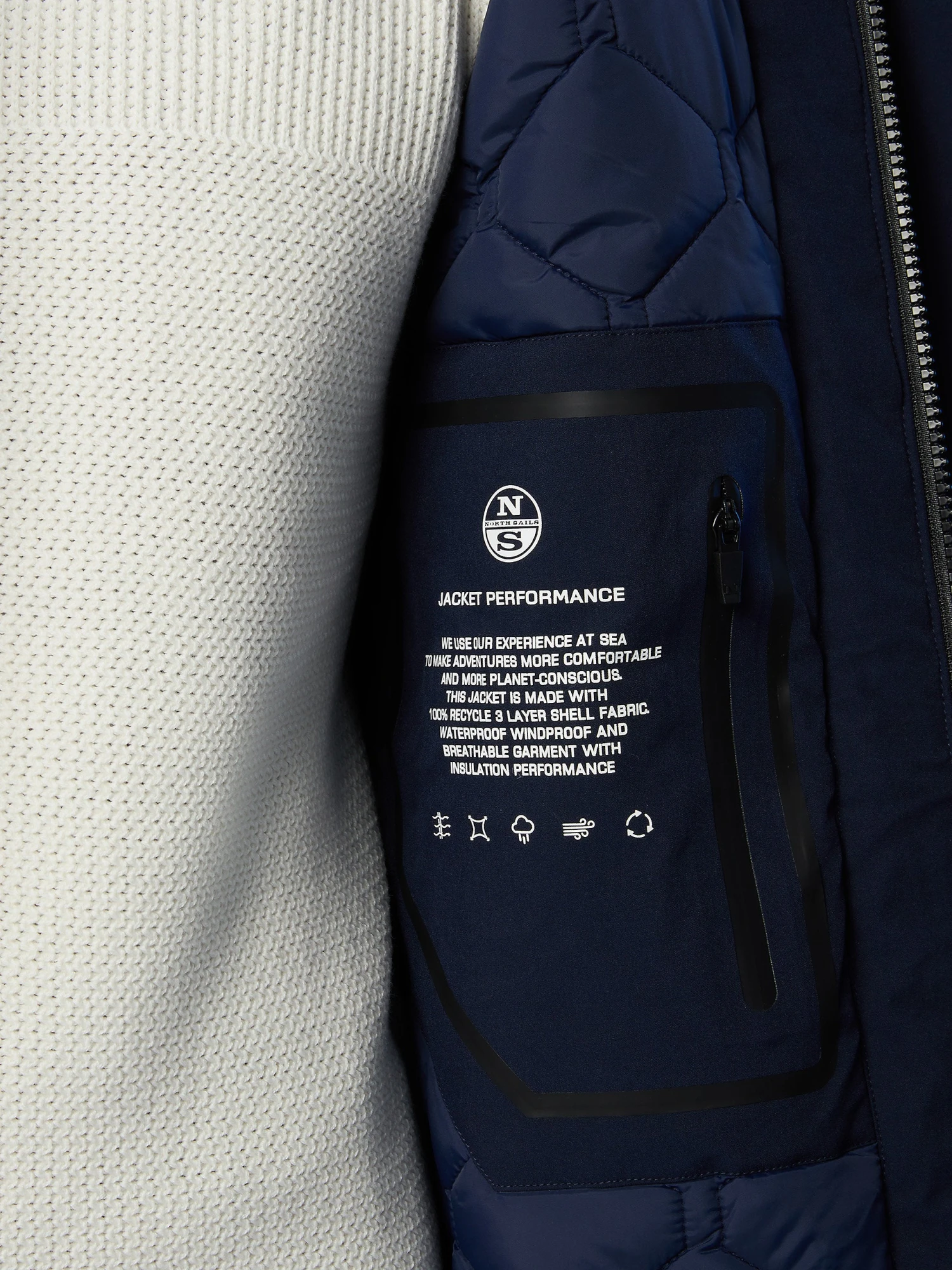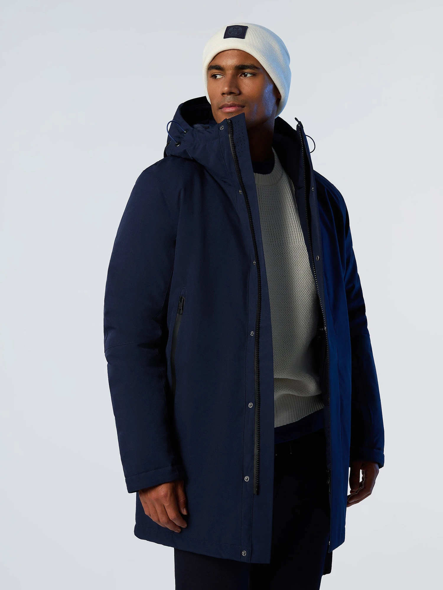 Men’s trench coat made from recycled polyester with triple-layer waterproof construction. Outside waterproof pockets, inside security pockets and reflective North Sails print.