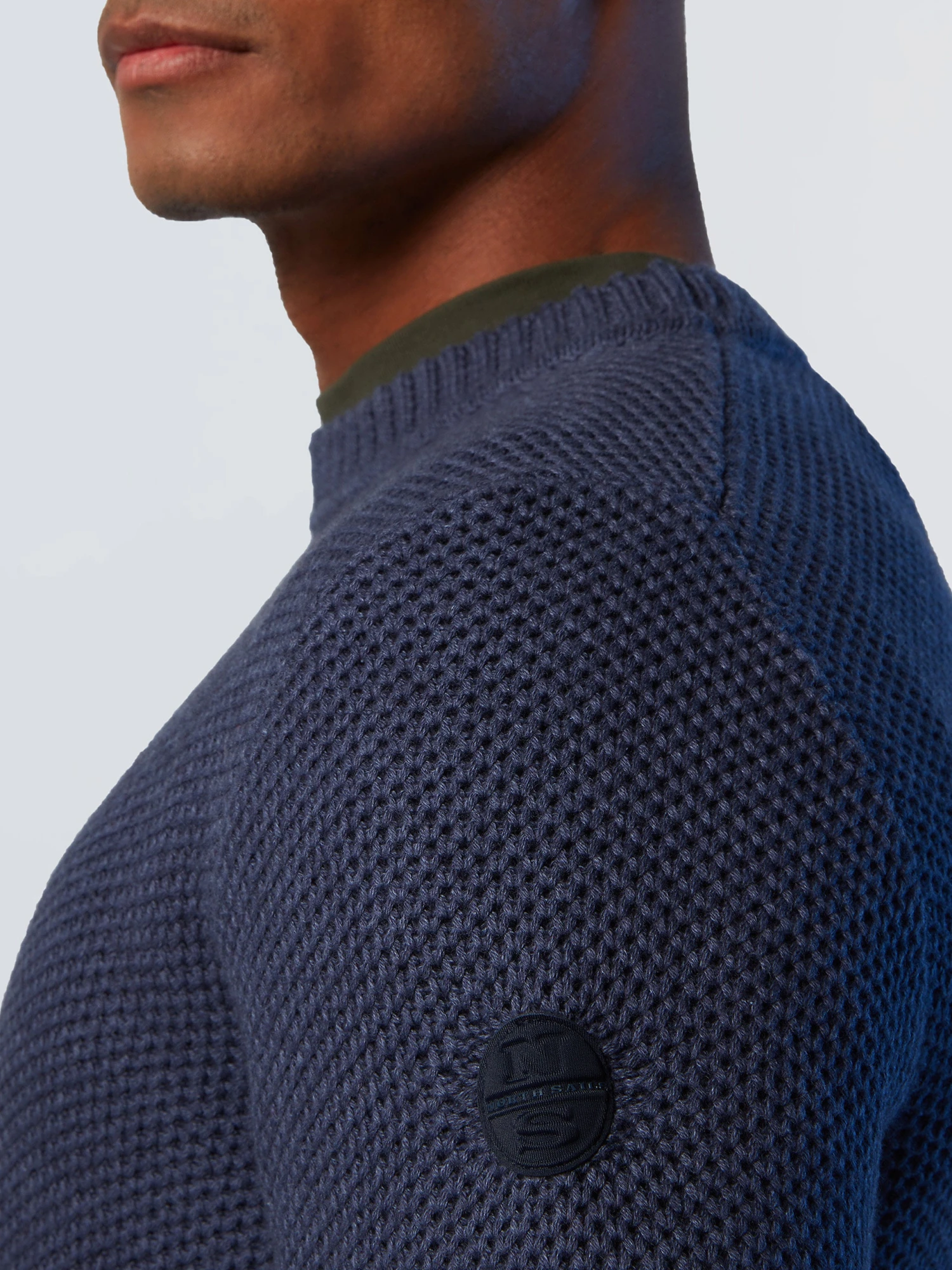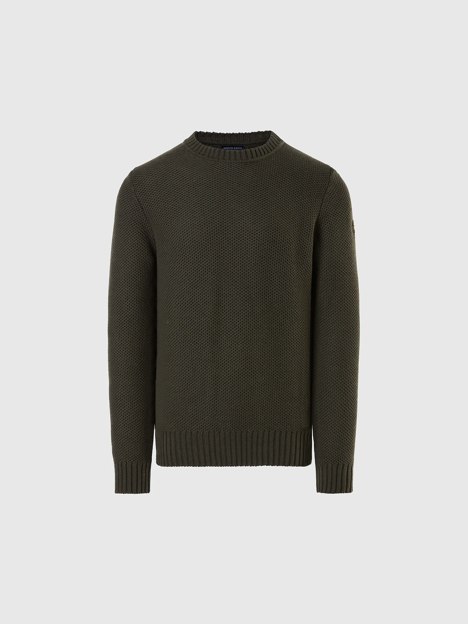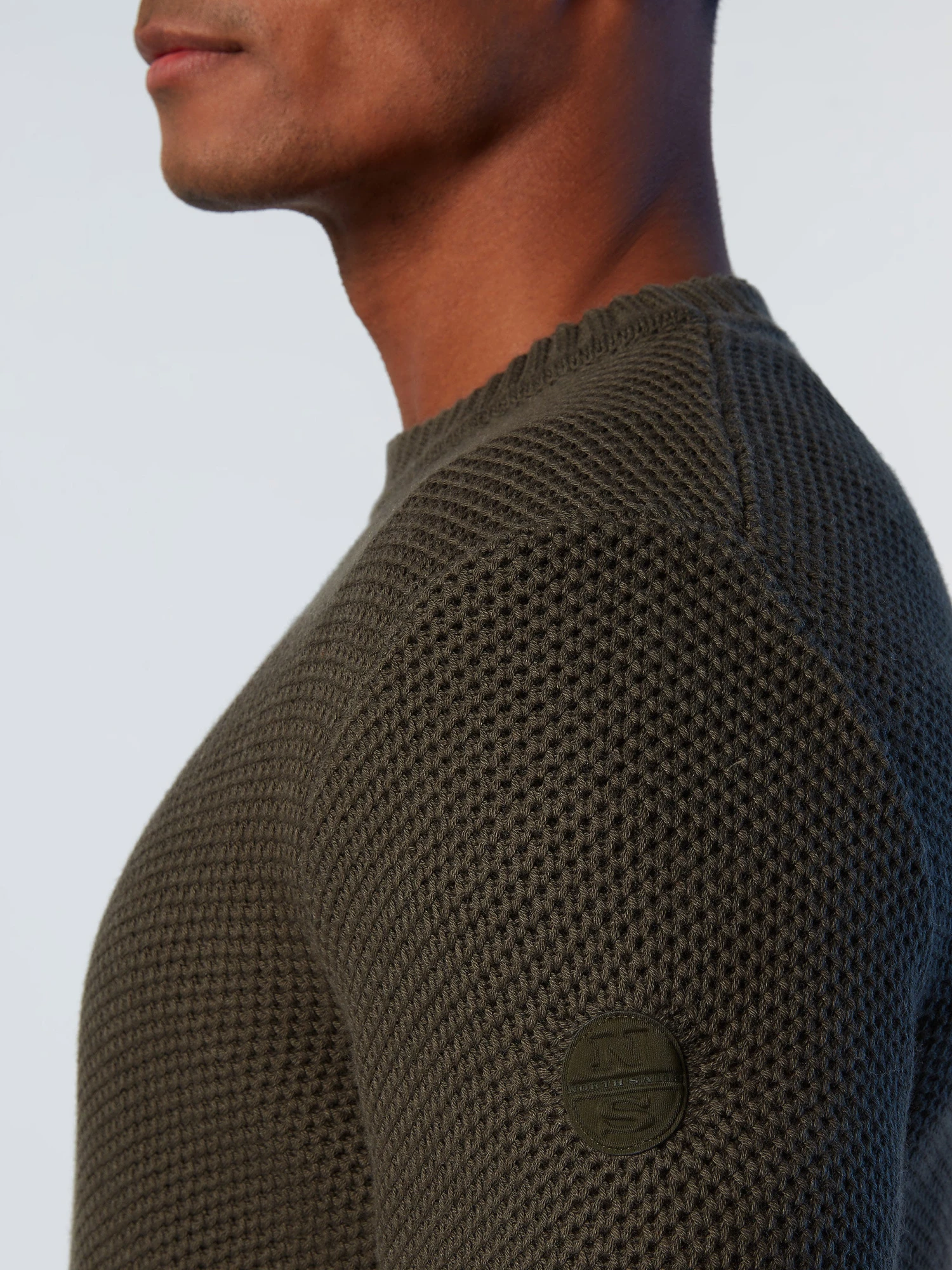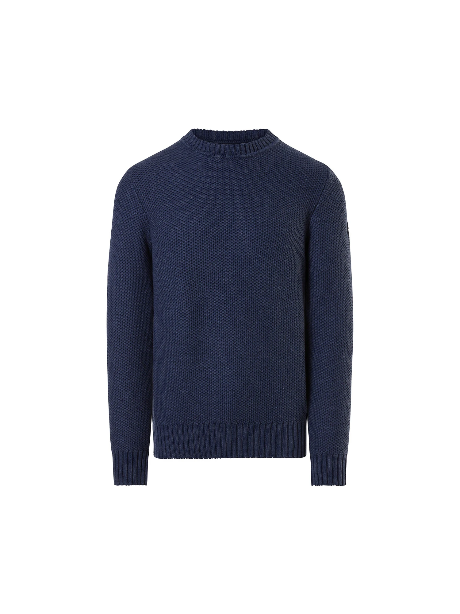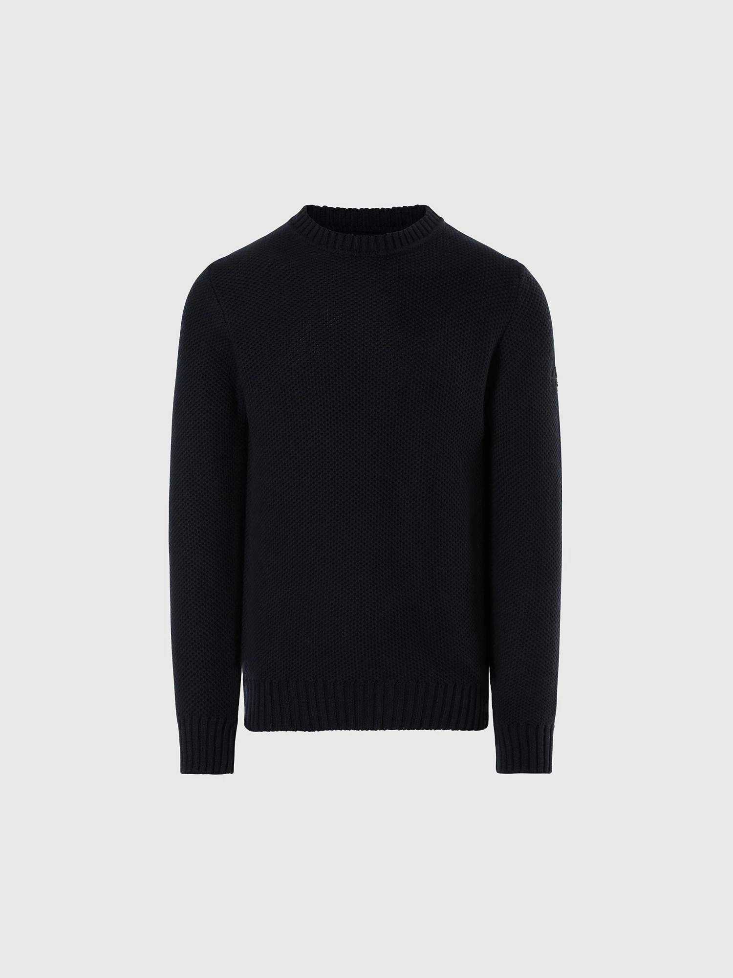 Men’s honeycomb-knit sweater, knitted from wool and organic cotton. Embellished with a logo patch on the sleeve.