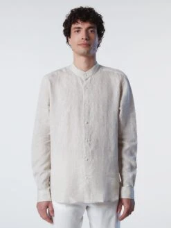 Men’s shirt made from 100% linen. Mandarin collar and rounded hem, embellished with an embroidered logo on the chest.