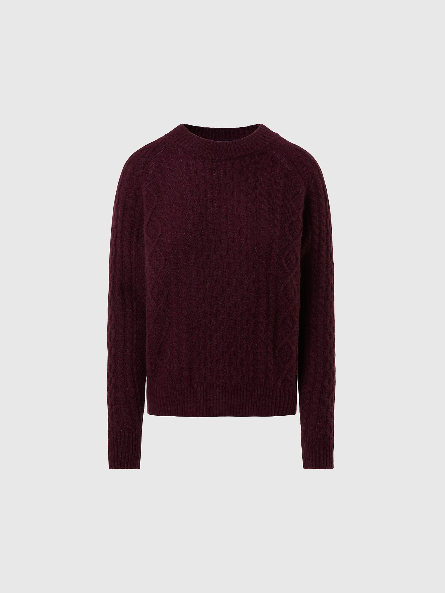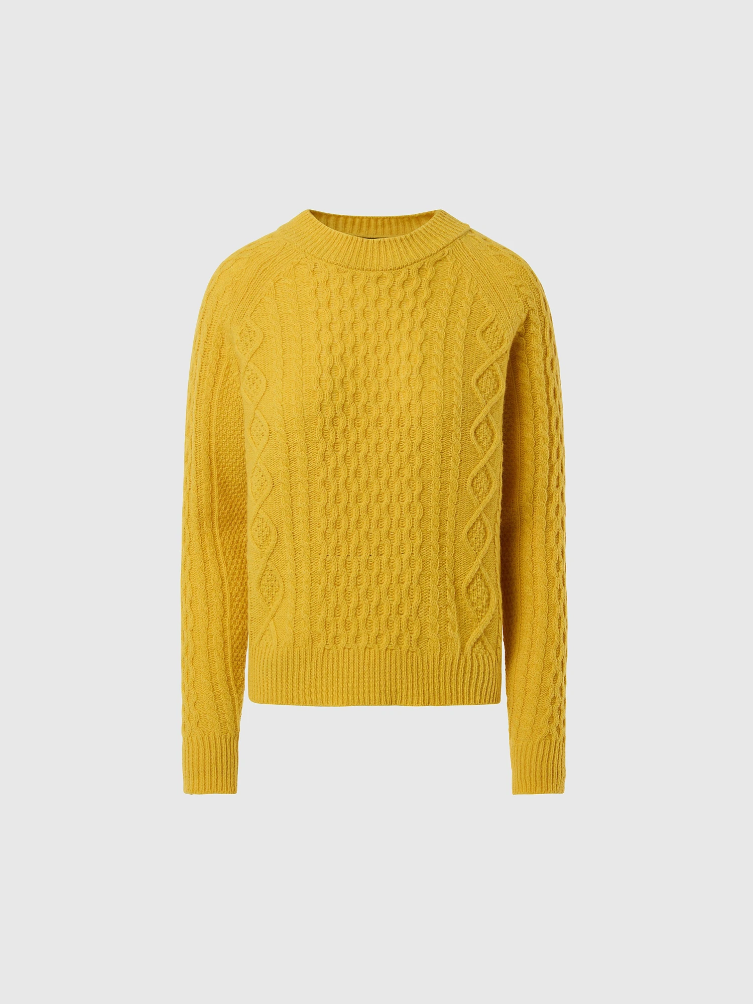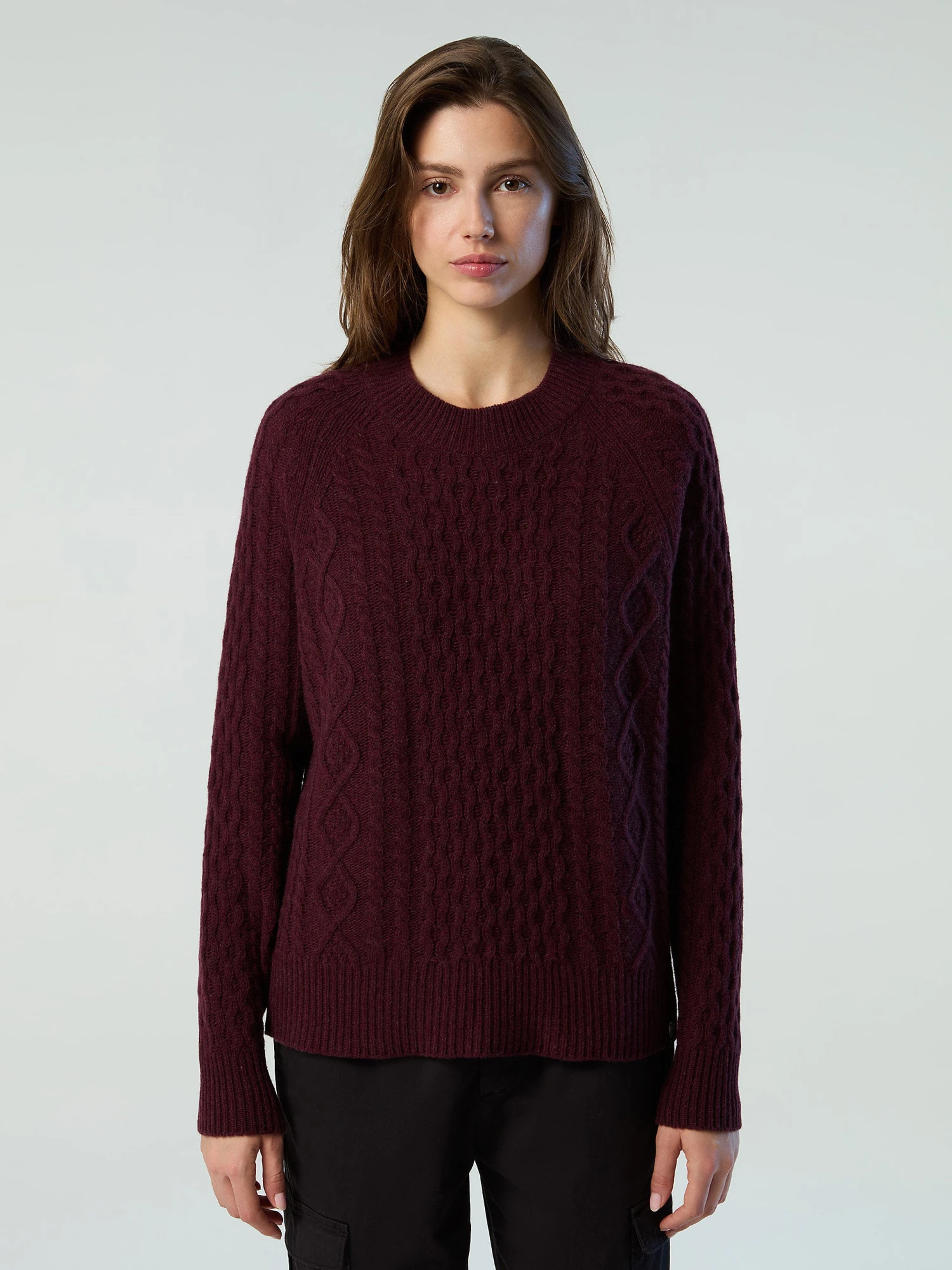 Women’s mock-neck Aran sweater knitted from a recycled Merino wool blend. Embellished with a logo patch.