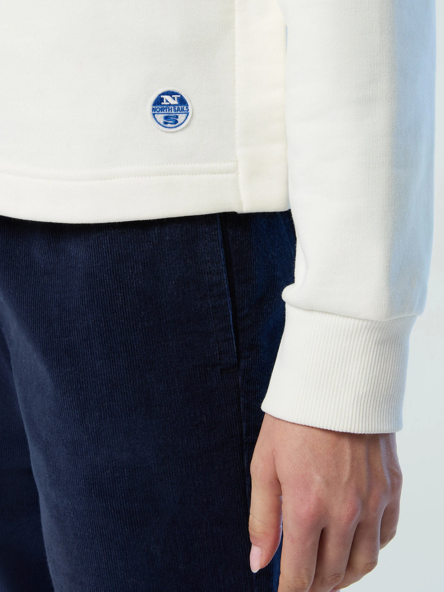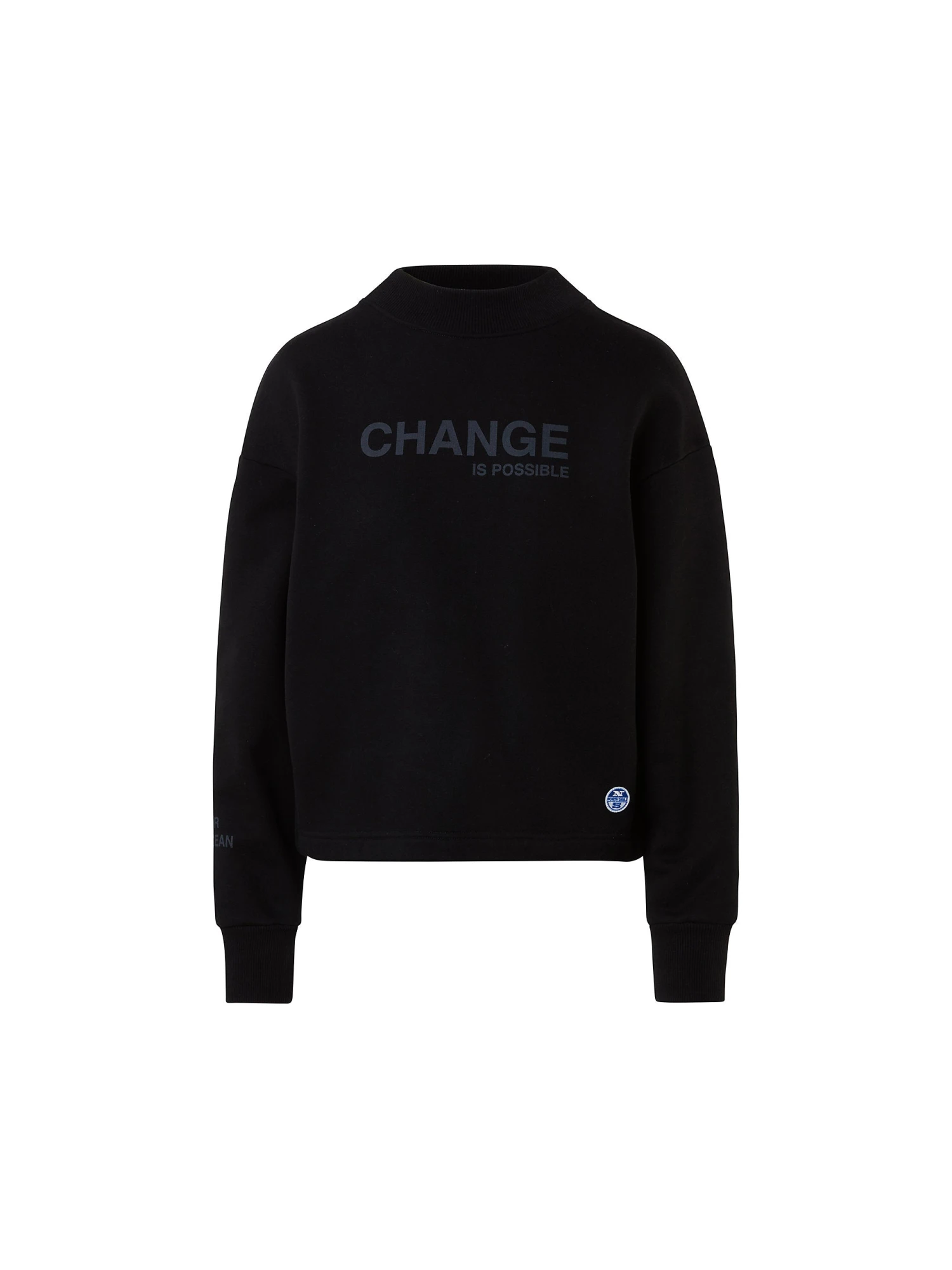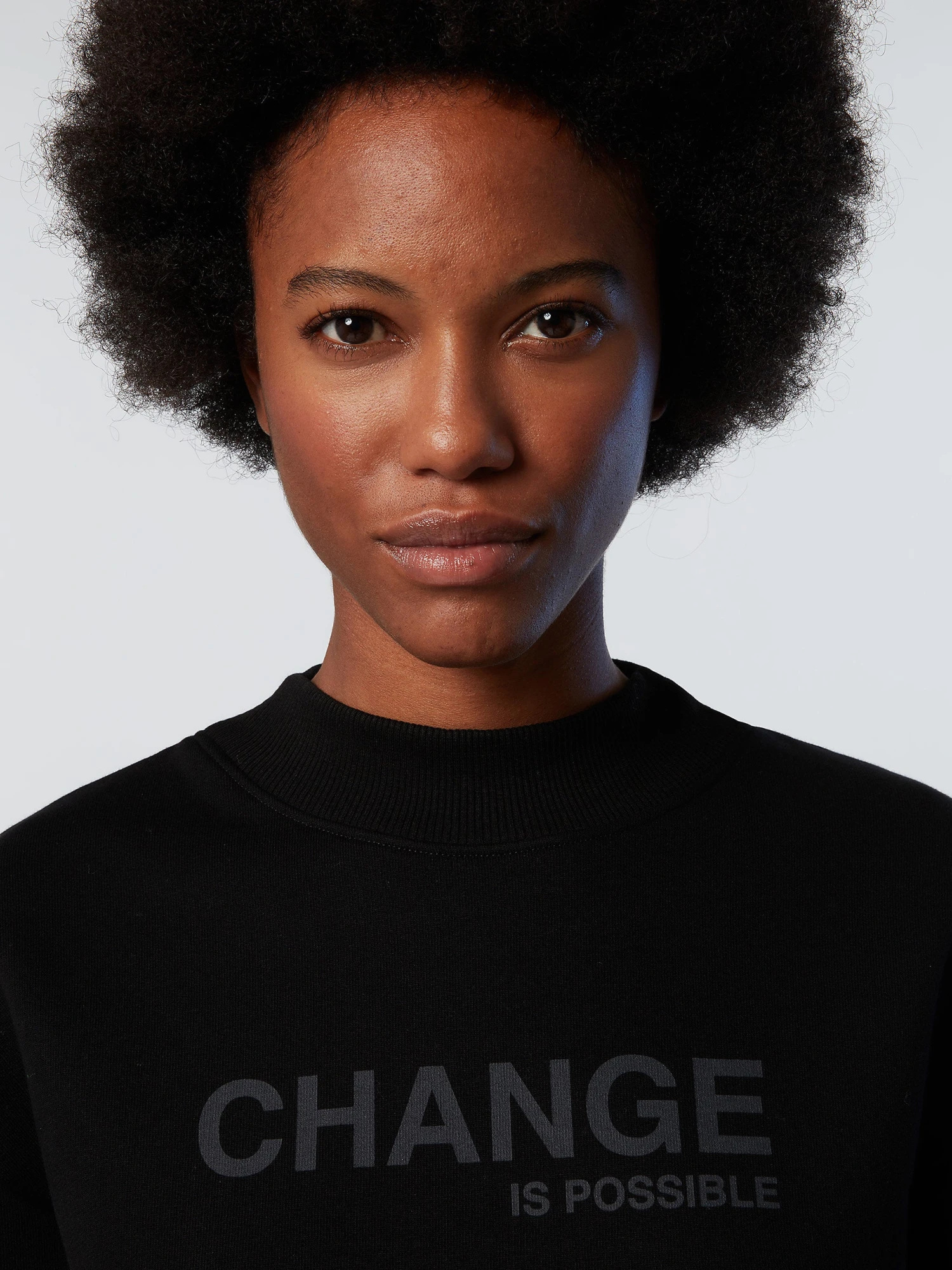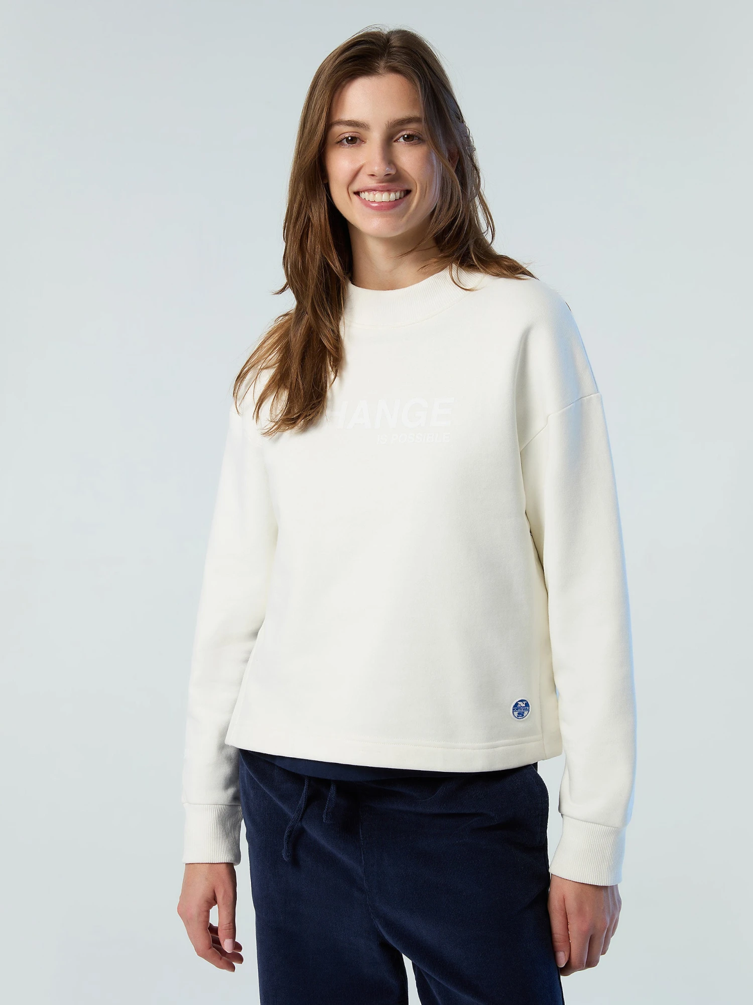 Women’s mock-neck sweatshirt made from organic cotton fleece. Boxy fit, detailed with bold slogan prints on the chest and sleeve.