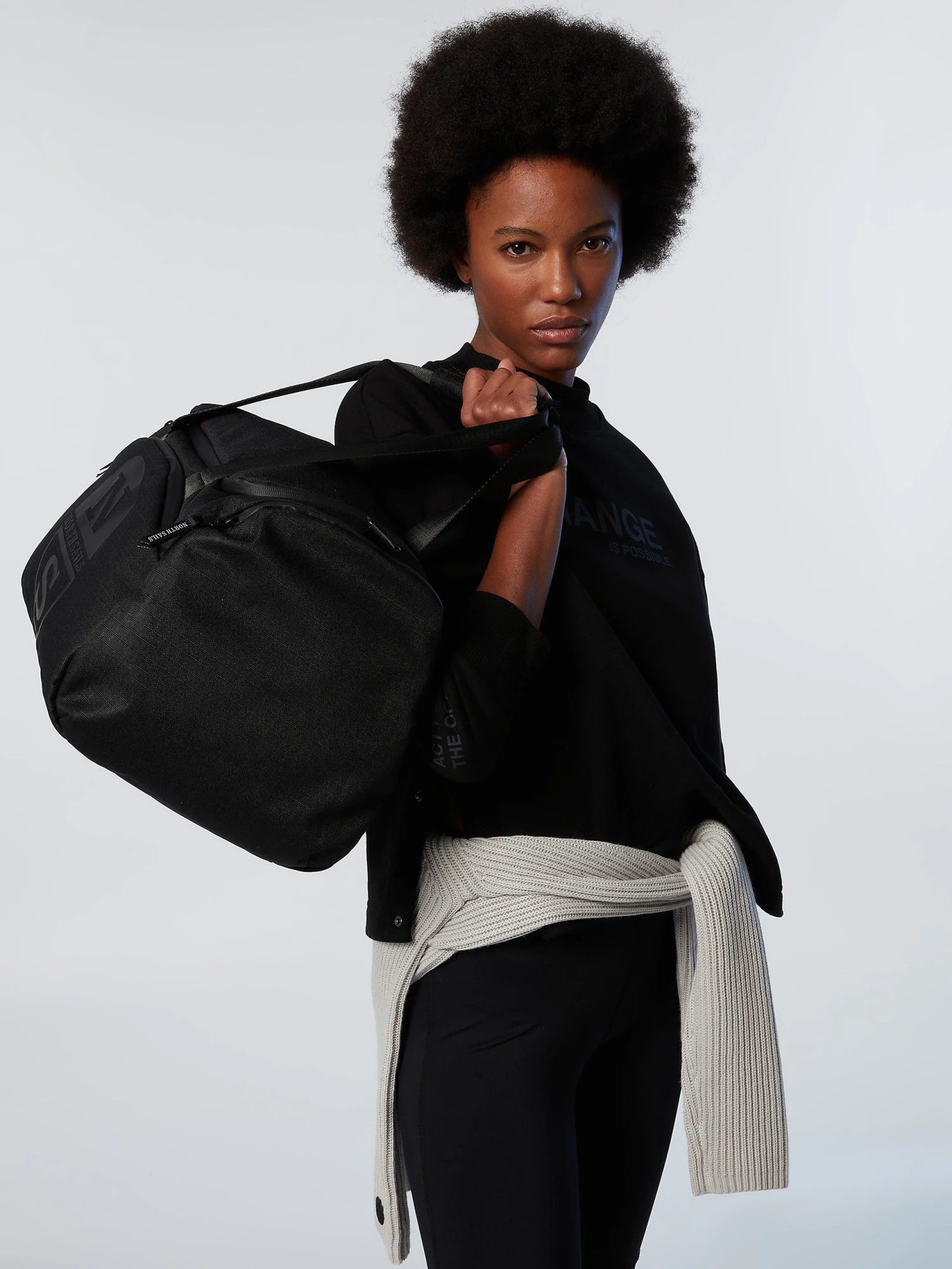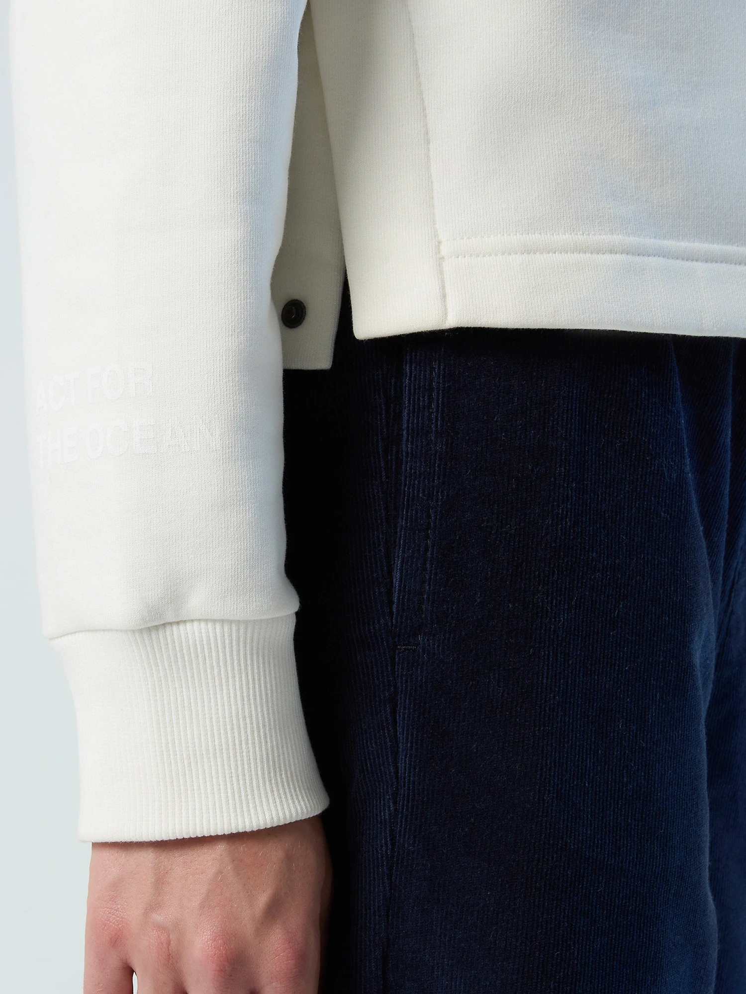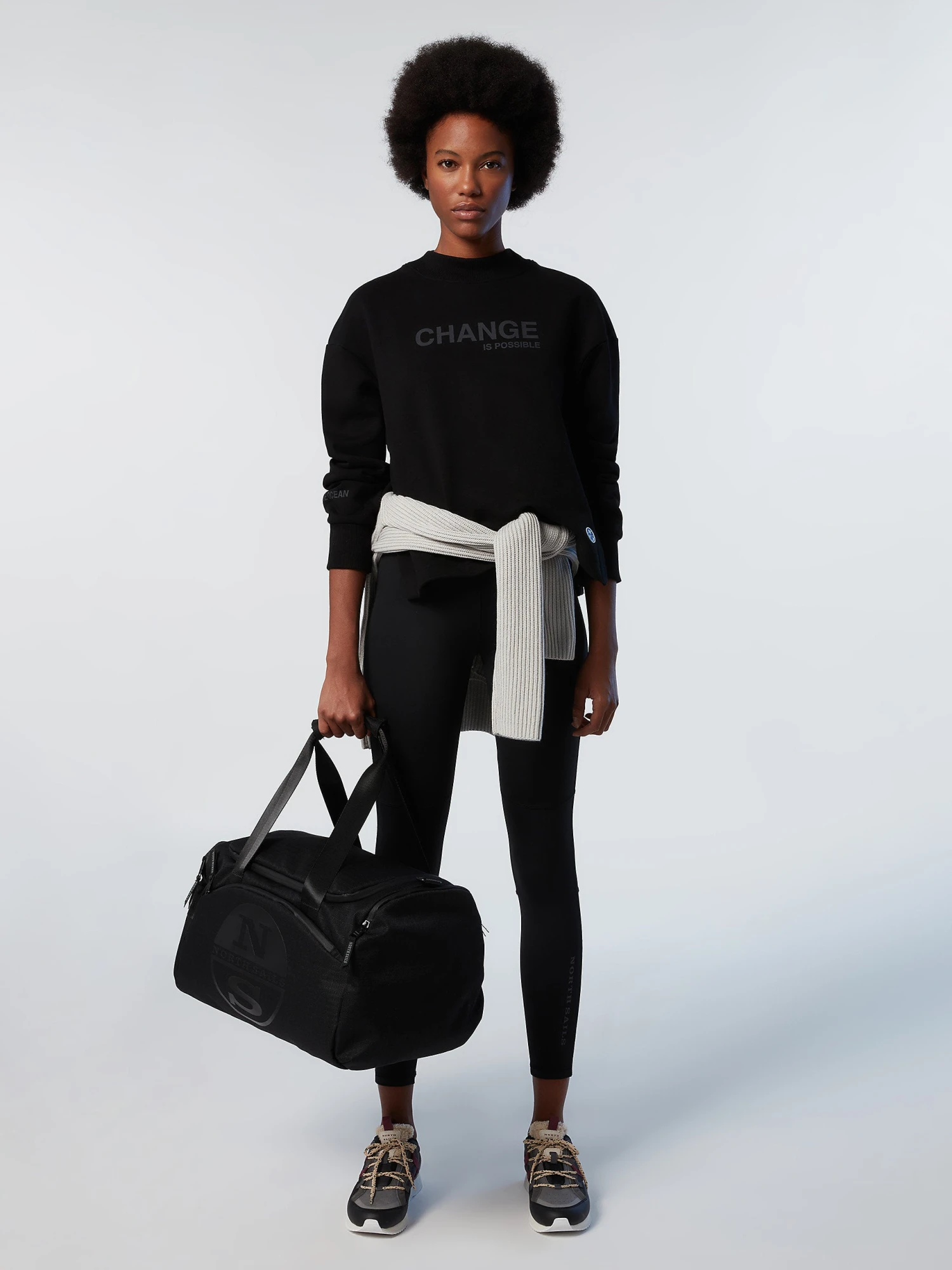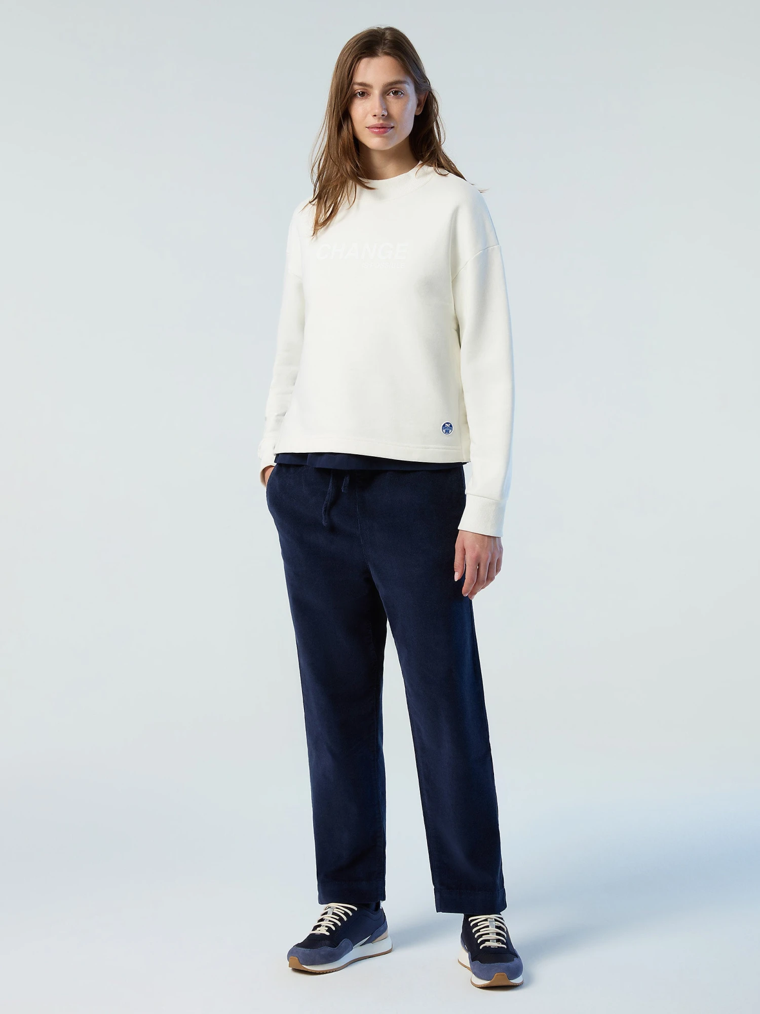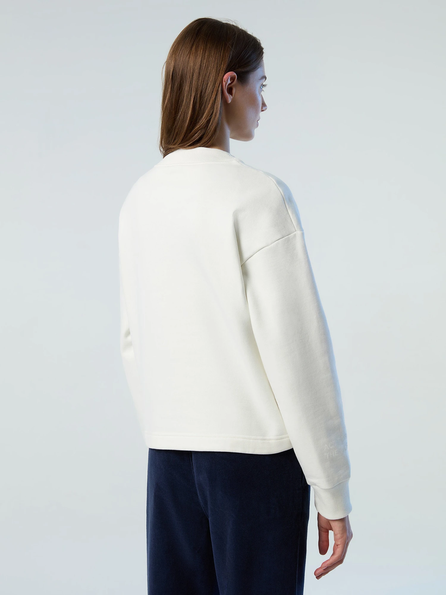 Women’s mock-neck sweatshirt made from organic cotton fleece. Boxy fit, detailed with bold slogan prints on the chest and sleeve.