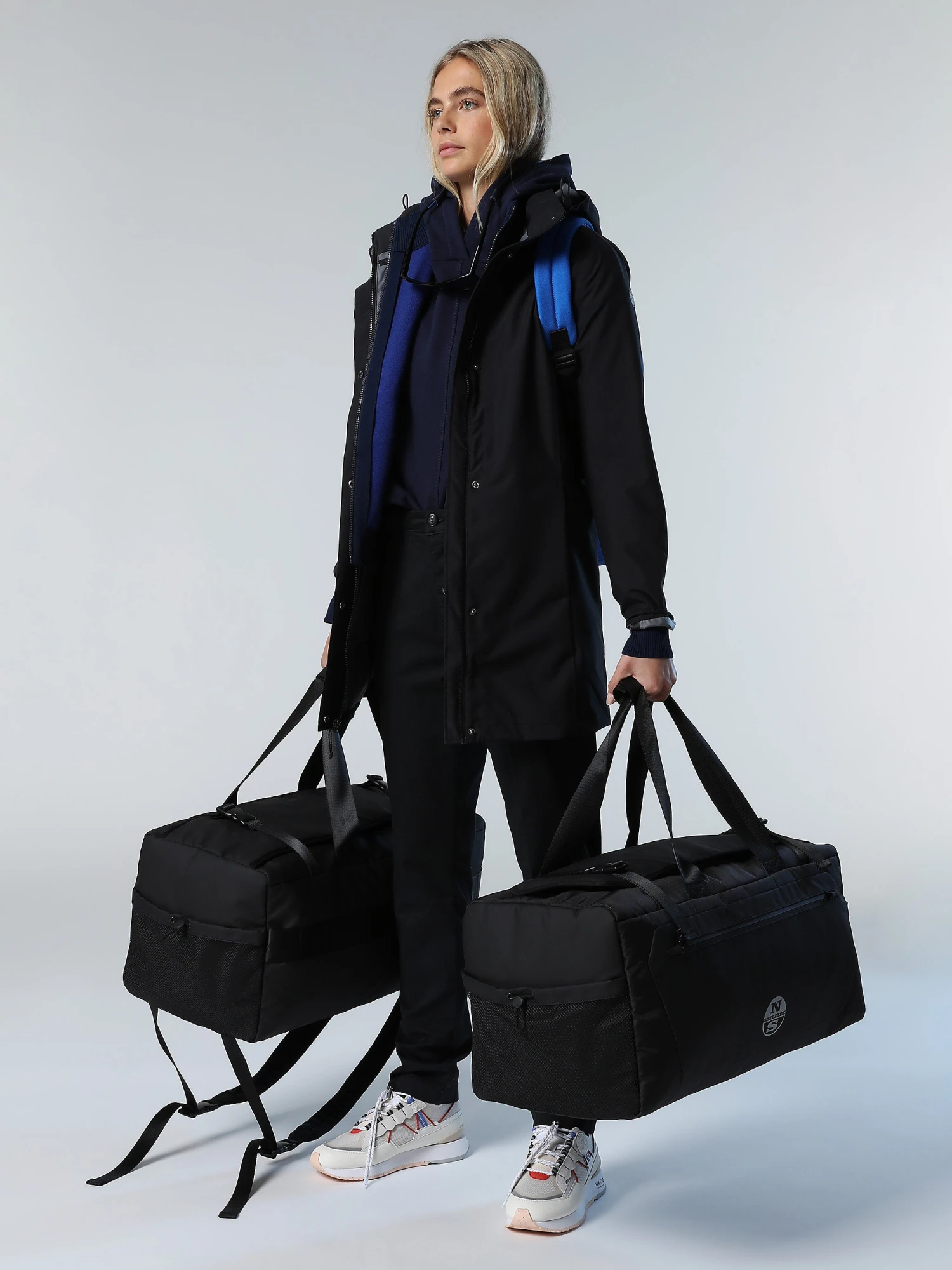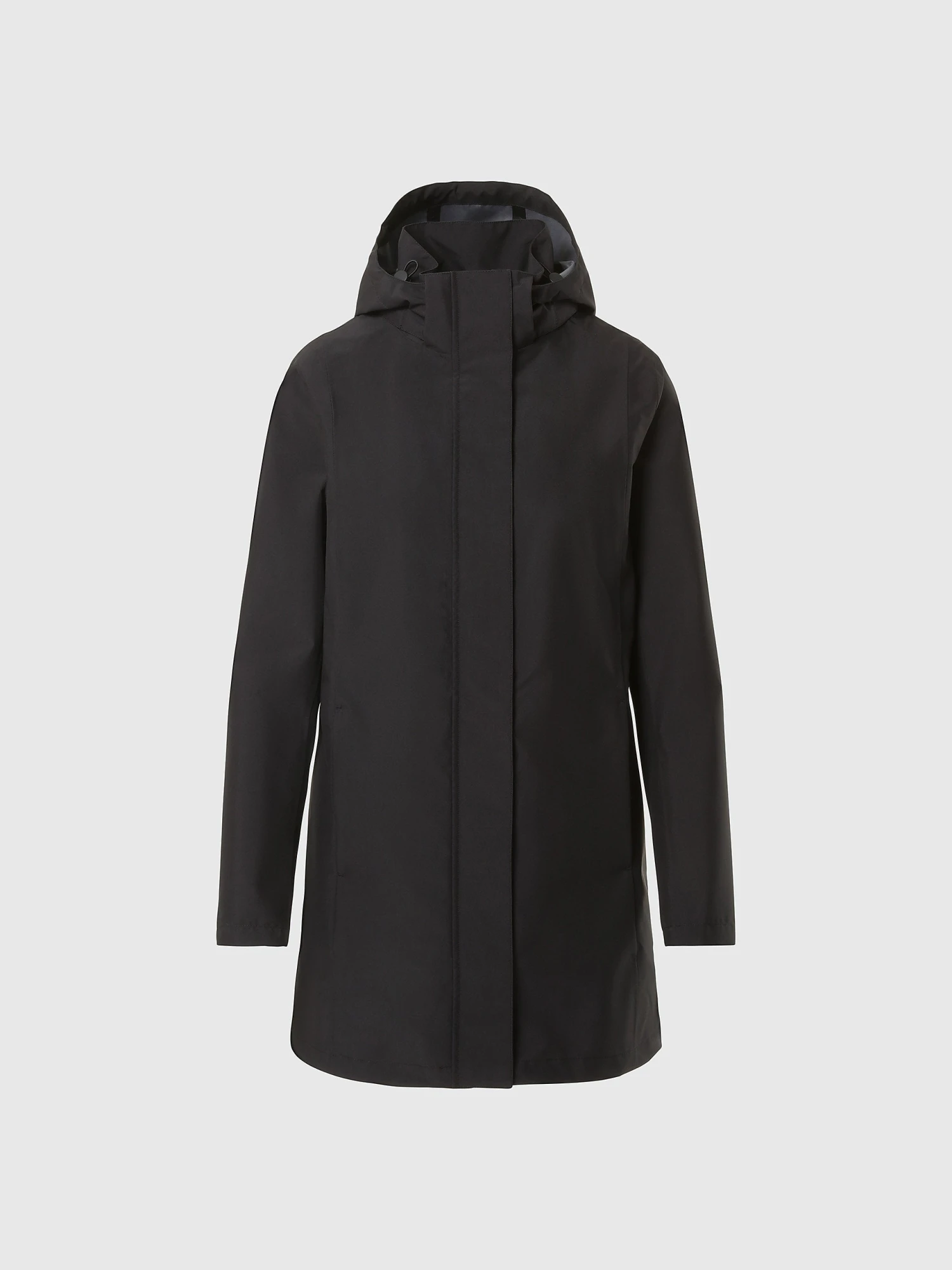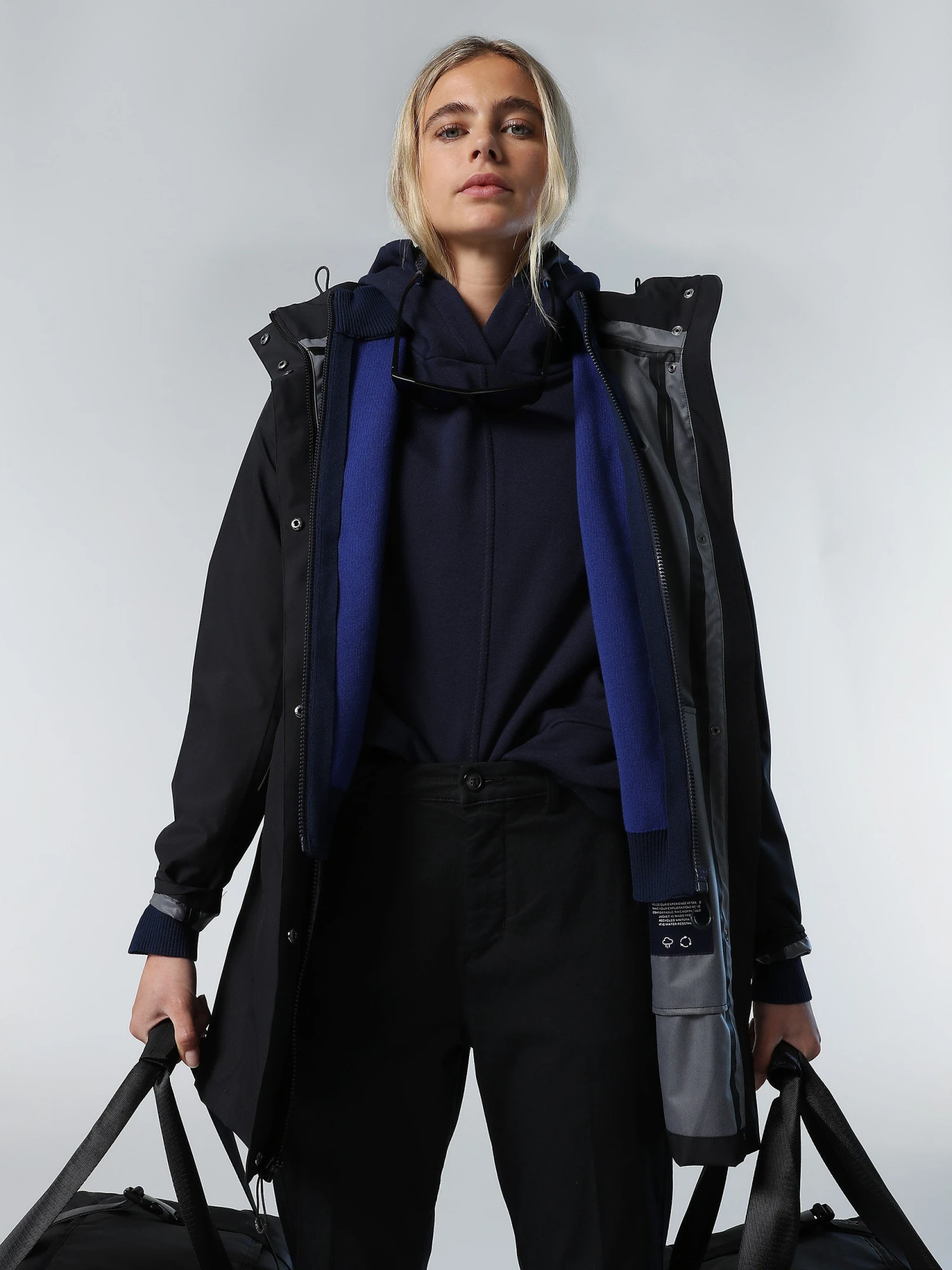 Women’s jacket made from two-layer stretch recycled nylon. Finished with a detachable hood and reflective North Sails logo on the sleeve.