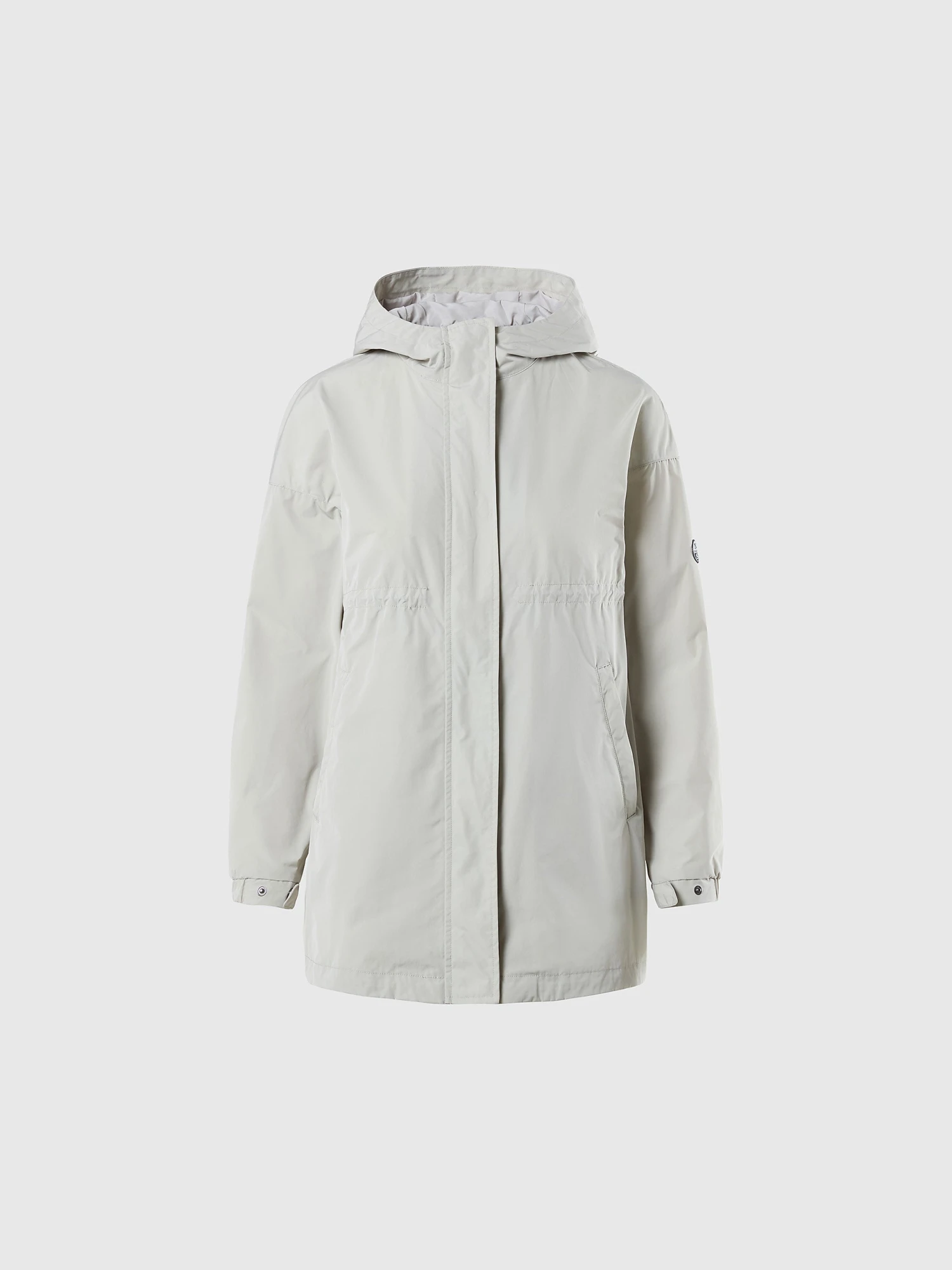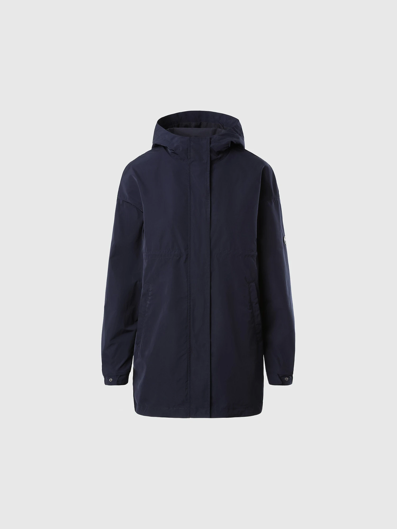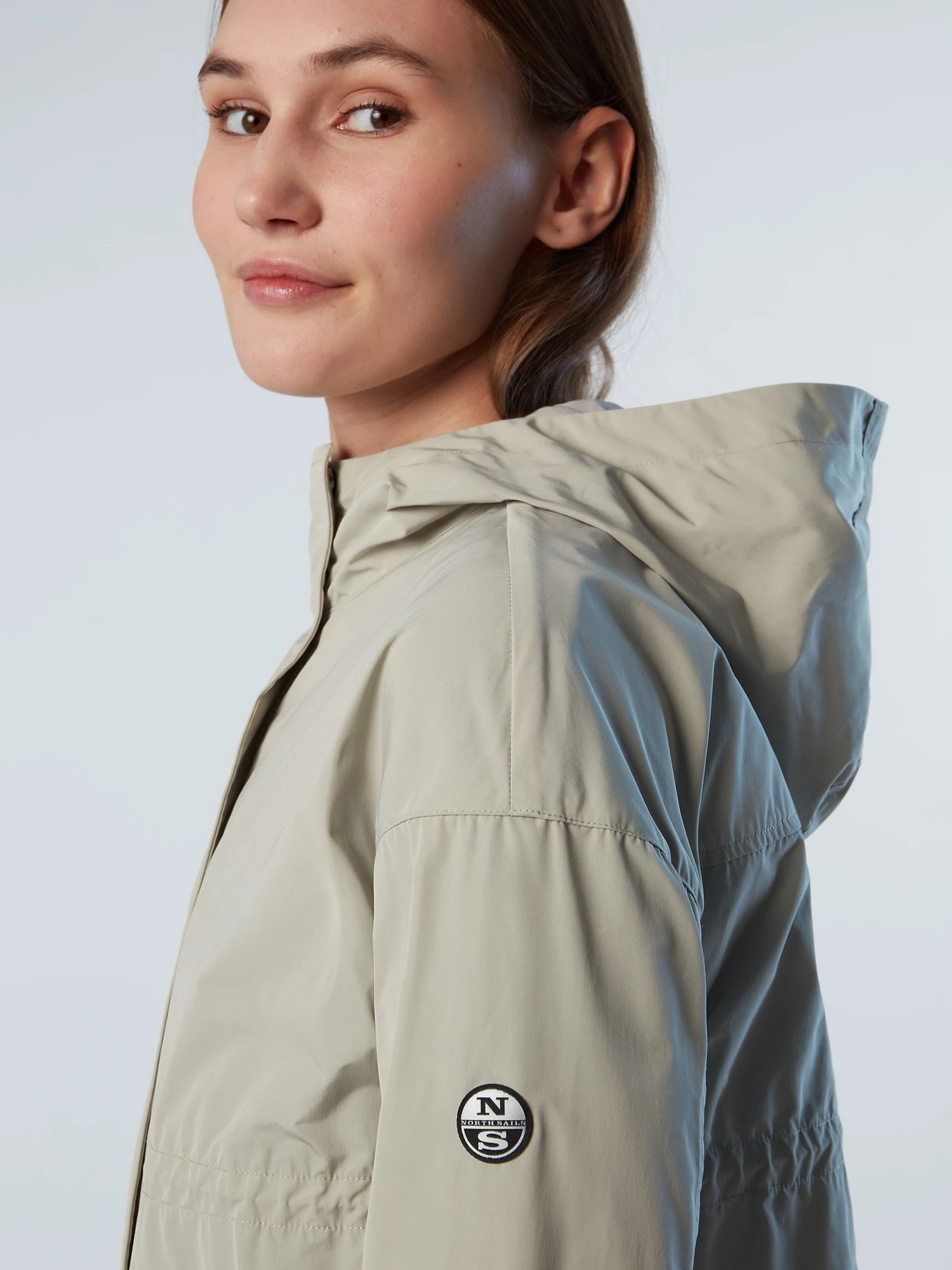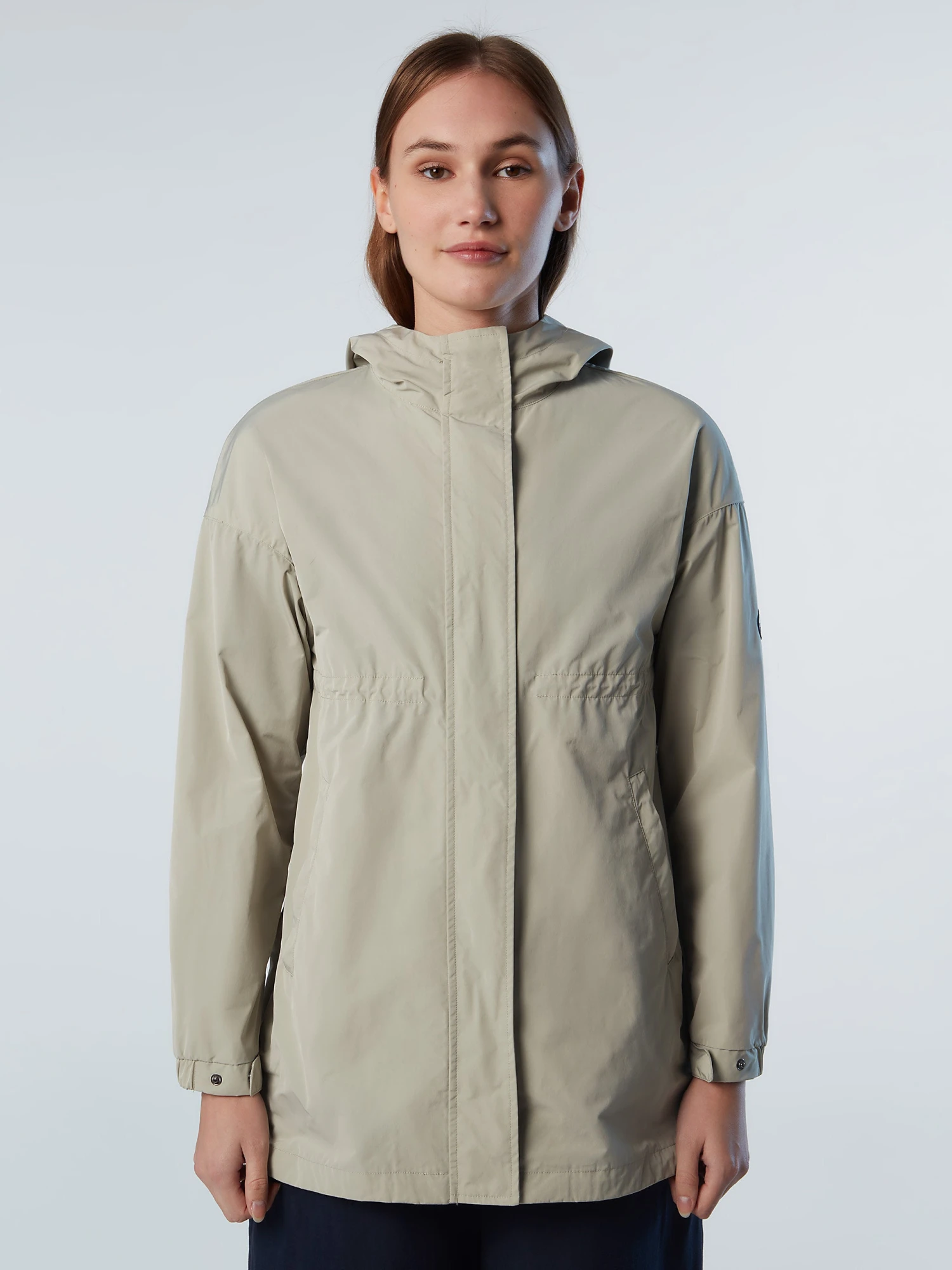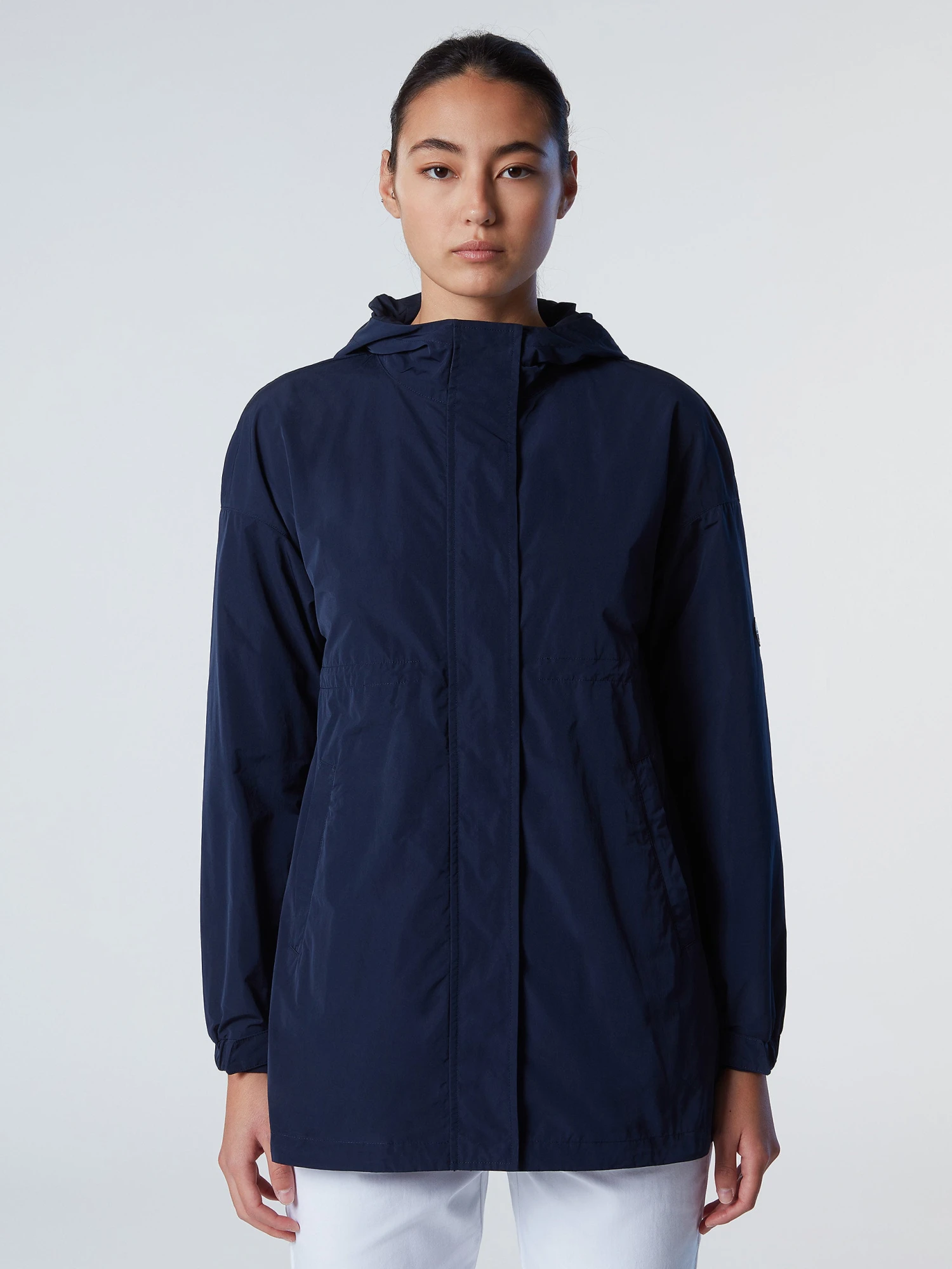 Women’s memory fabric mid-length jacket. Hooded style with elasticated drawstring waist and reflective North Sails logo on the chest.
