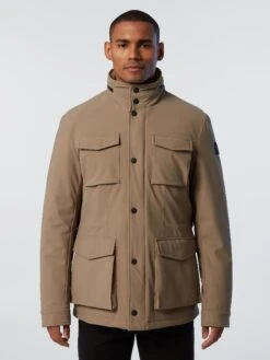 Men’s triple-layer bonded field jacket crafted from recycled fabric. Multiple patch pockets, inside security pockets and adjustable drawstring waist.