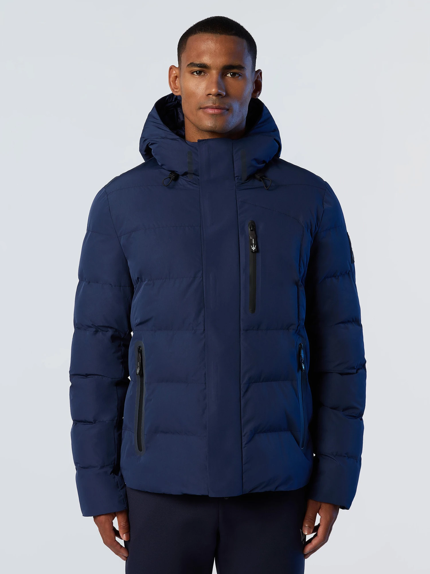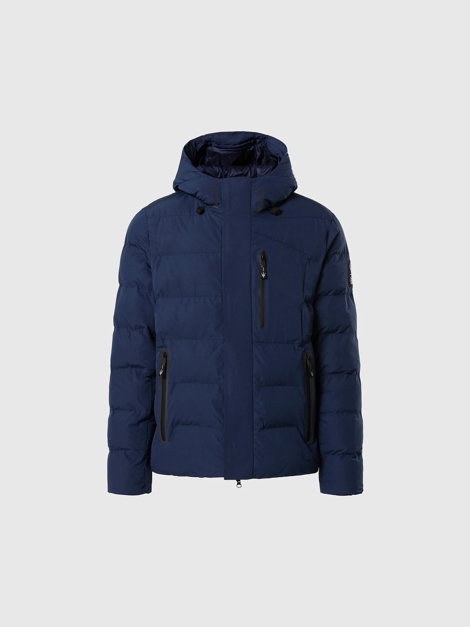 Men’s puffer jacket from the Maserati x North Sails collection, crafted from recycled memory fabric with an in-built mesh ventilation system.