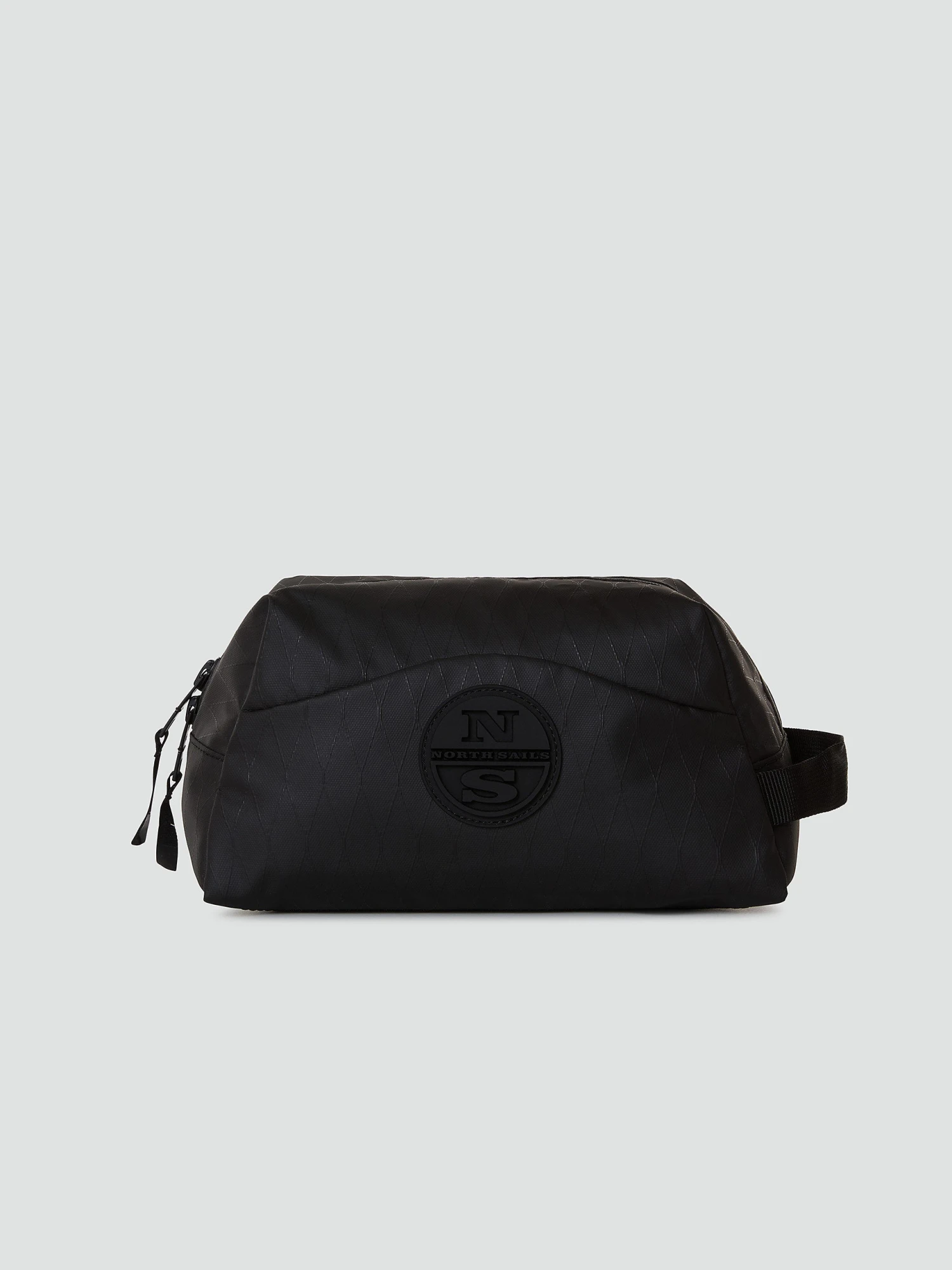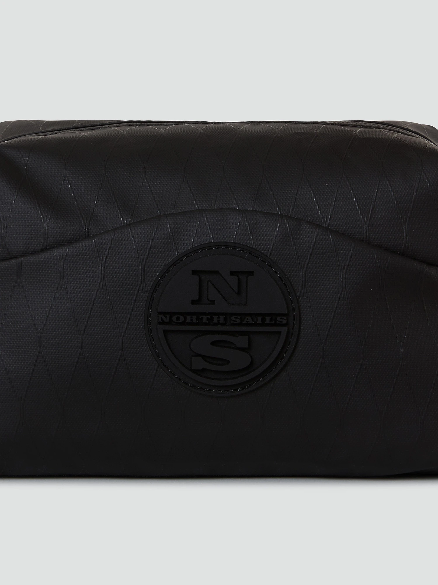 Men’s wash bag made from recycled fabric with a rubberised finish, featuring a zip closure and side handle. Embellished with a silicone North Tech logo patch.