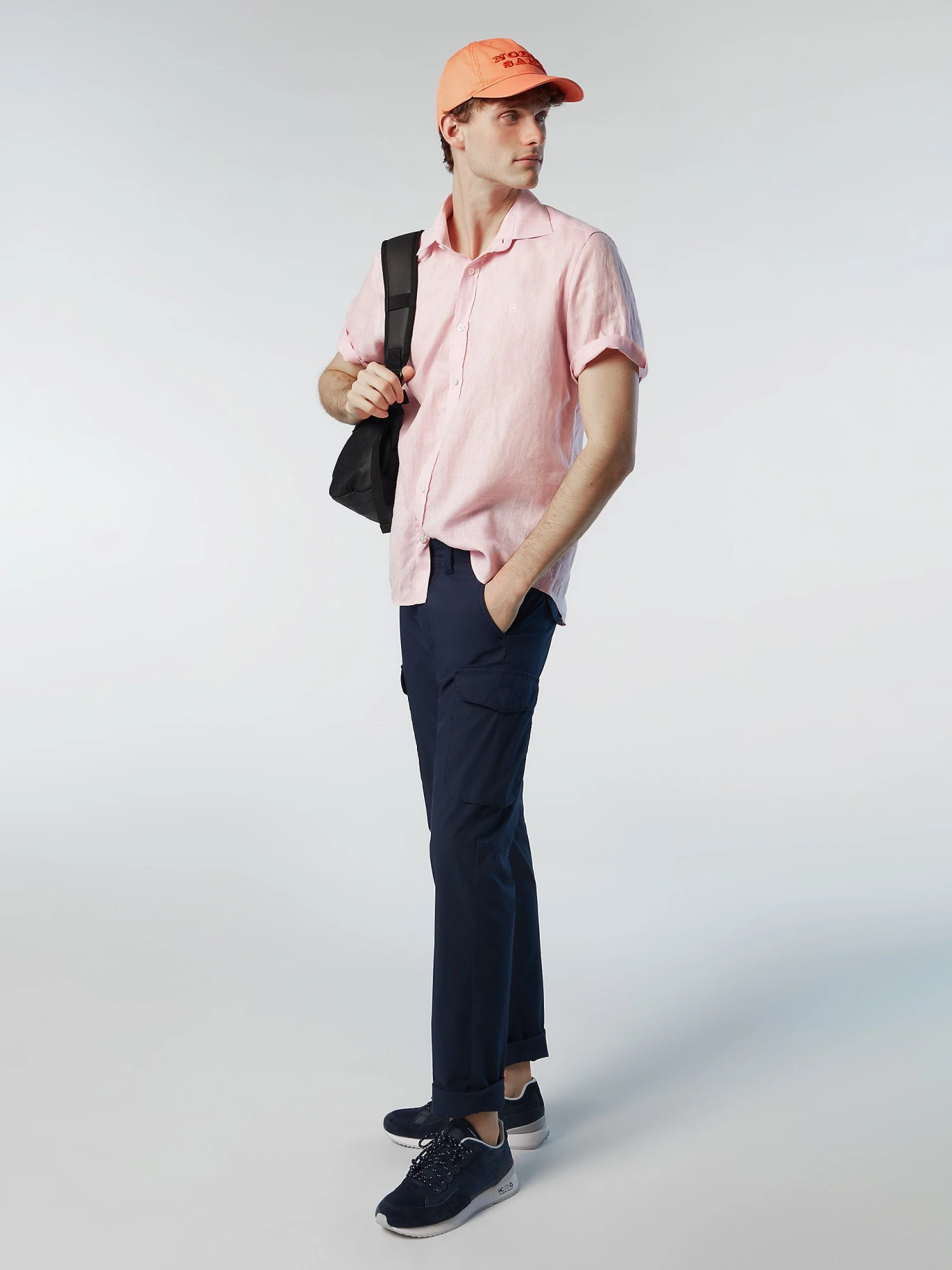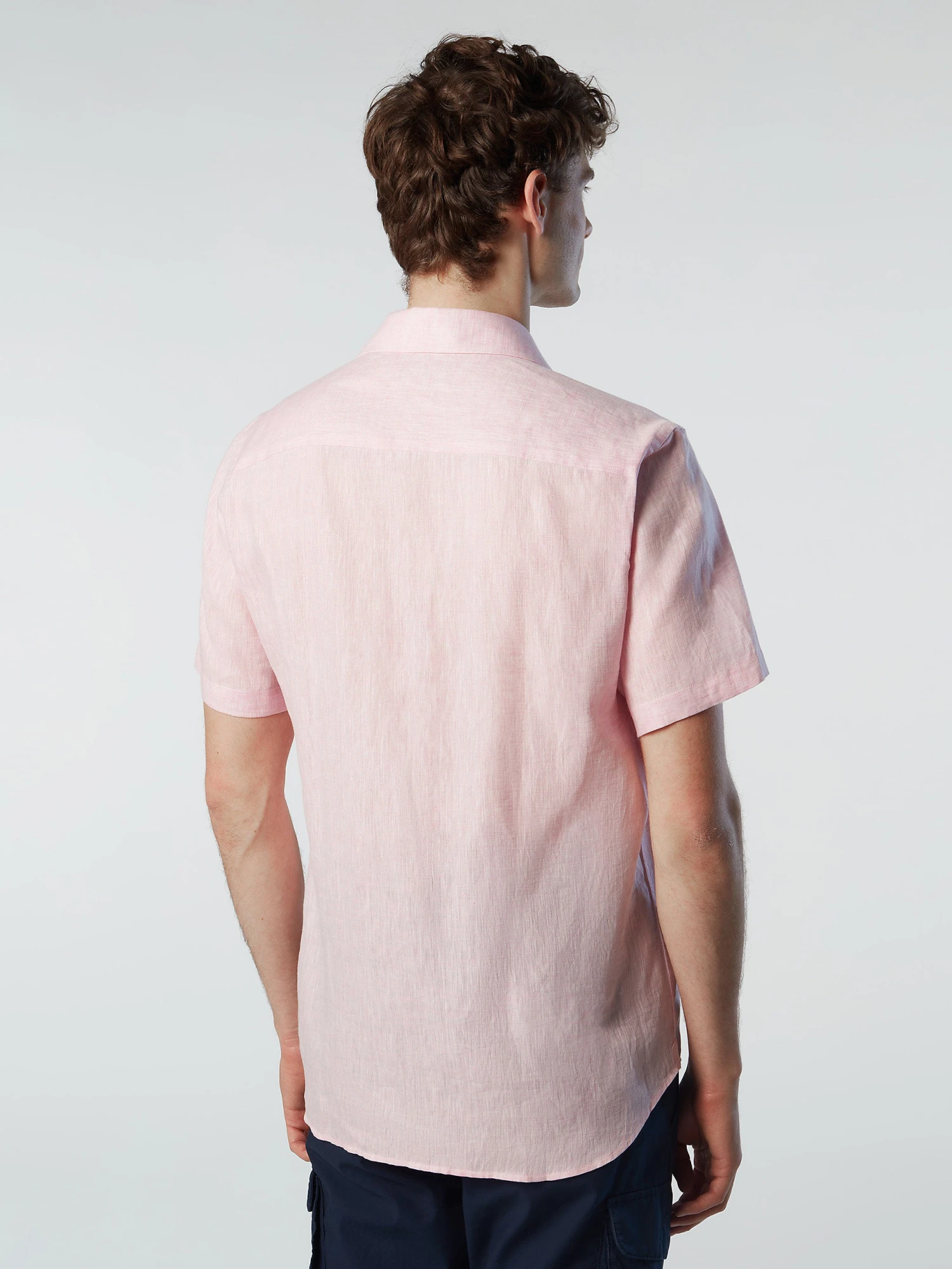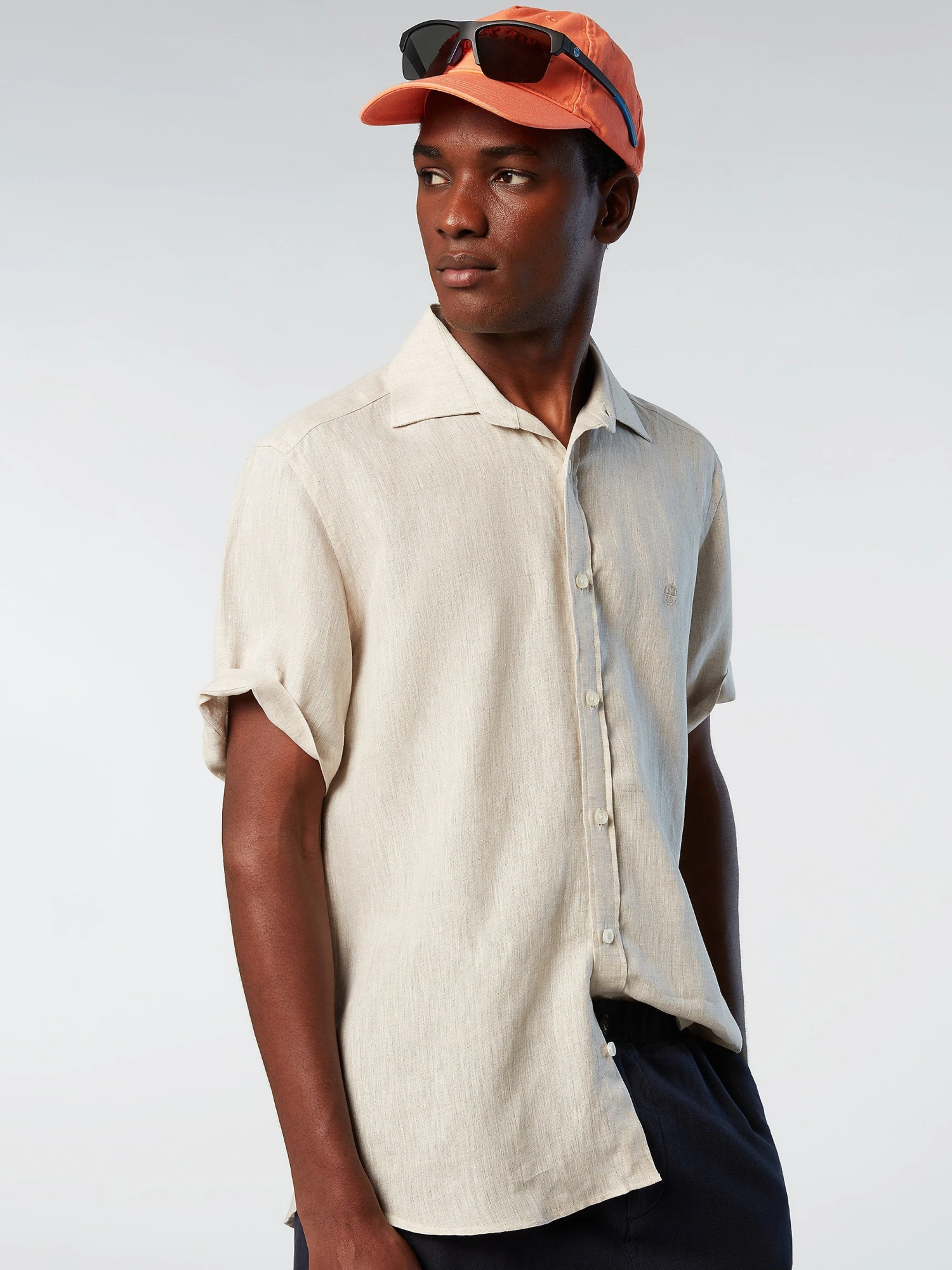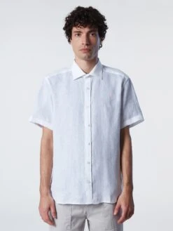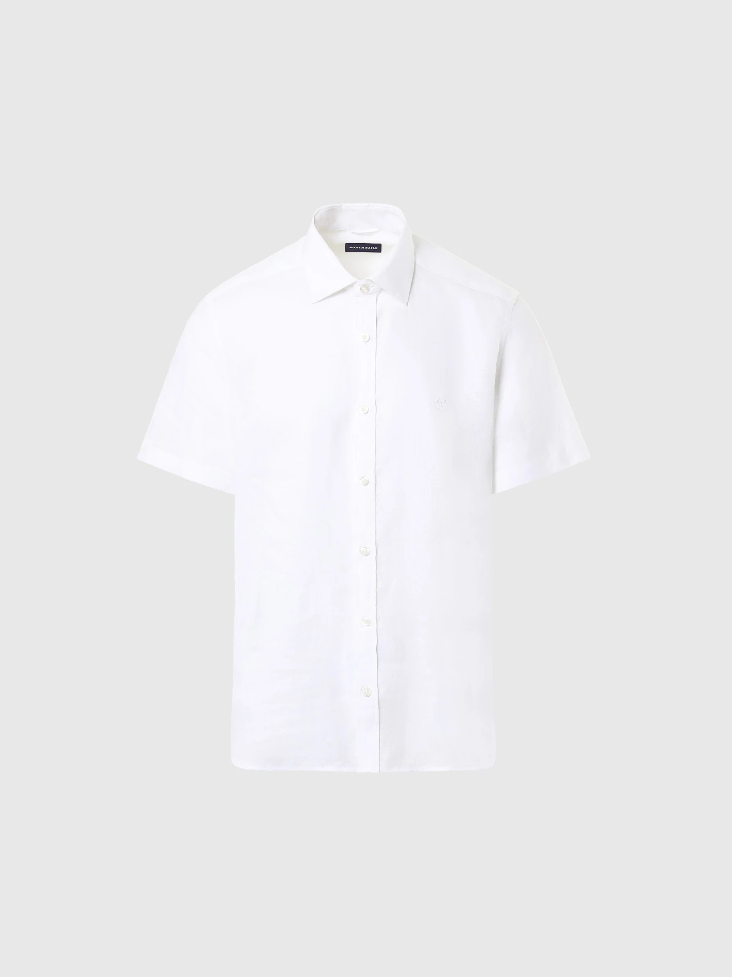Men’s short-sleeved shirt made from 100% linen. Spread collar and rounded hem, embellished with a tonal logo on the chest.