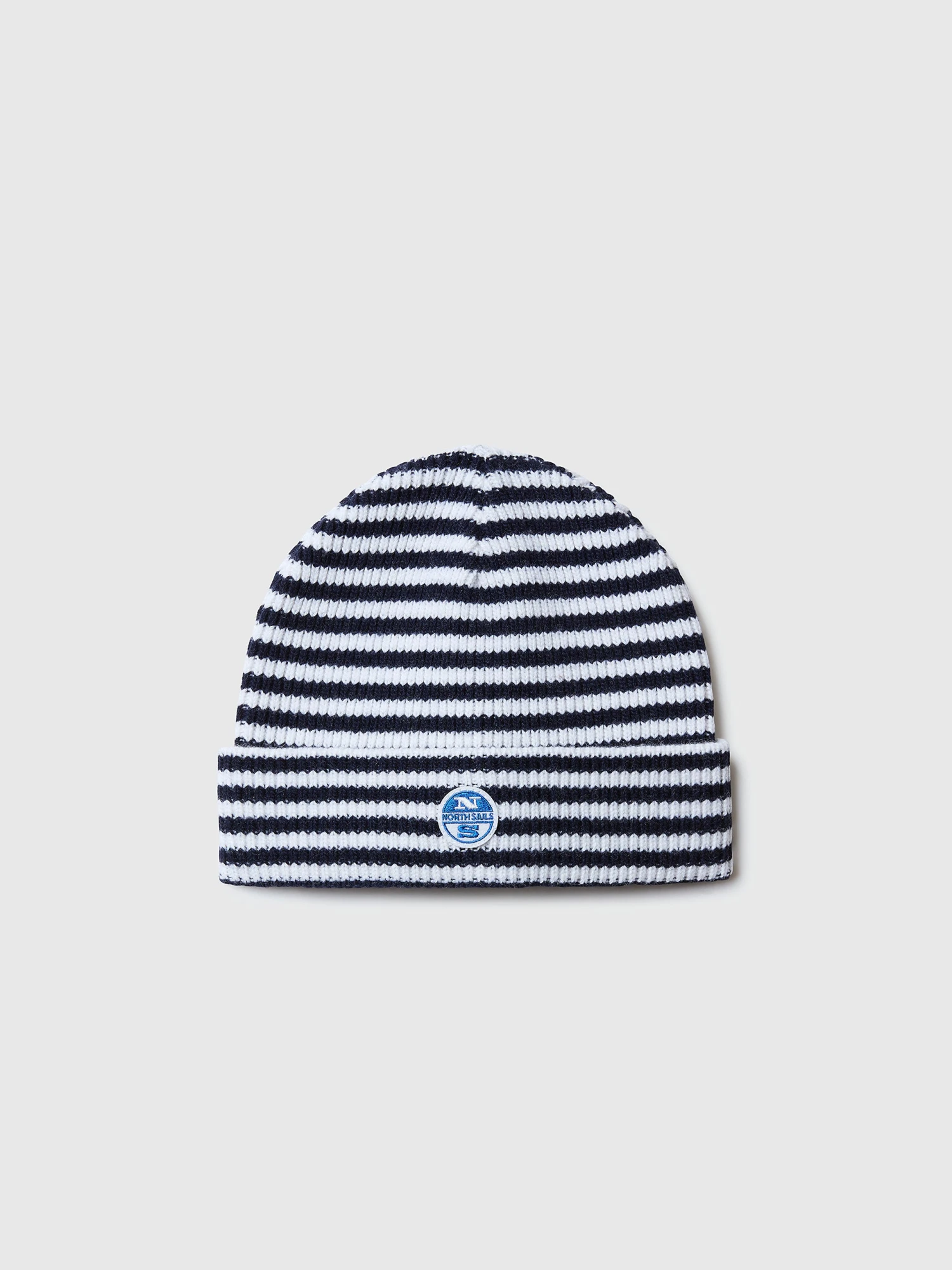 Women’s striped beanie knitted from a recycled cashmere blend. Detailed with a logo patch on the front.