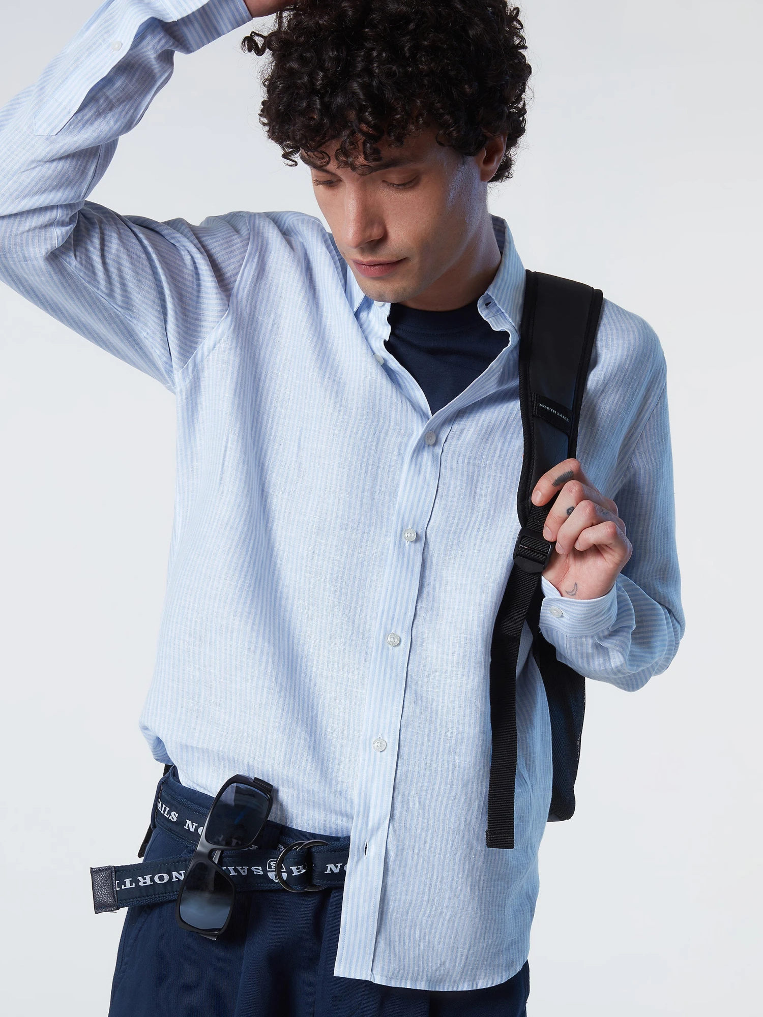 Men’s striped shirt made from 100% linen. Button-down collar and rounded hem, embellished with a logo on the chest.