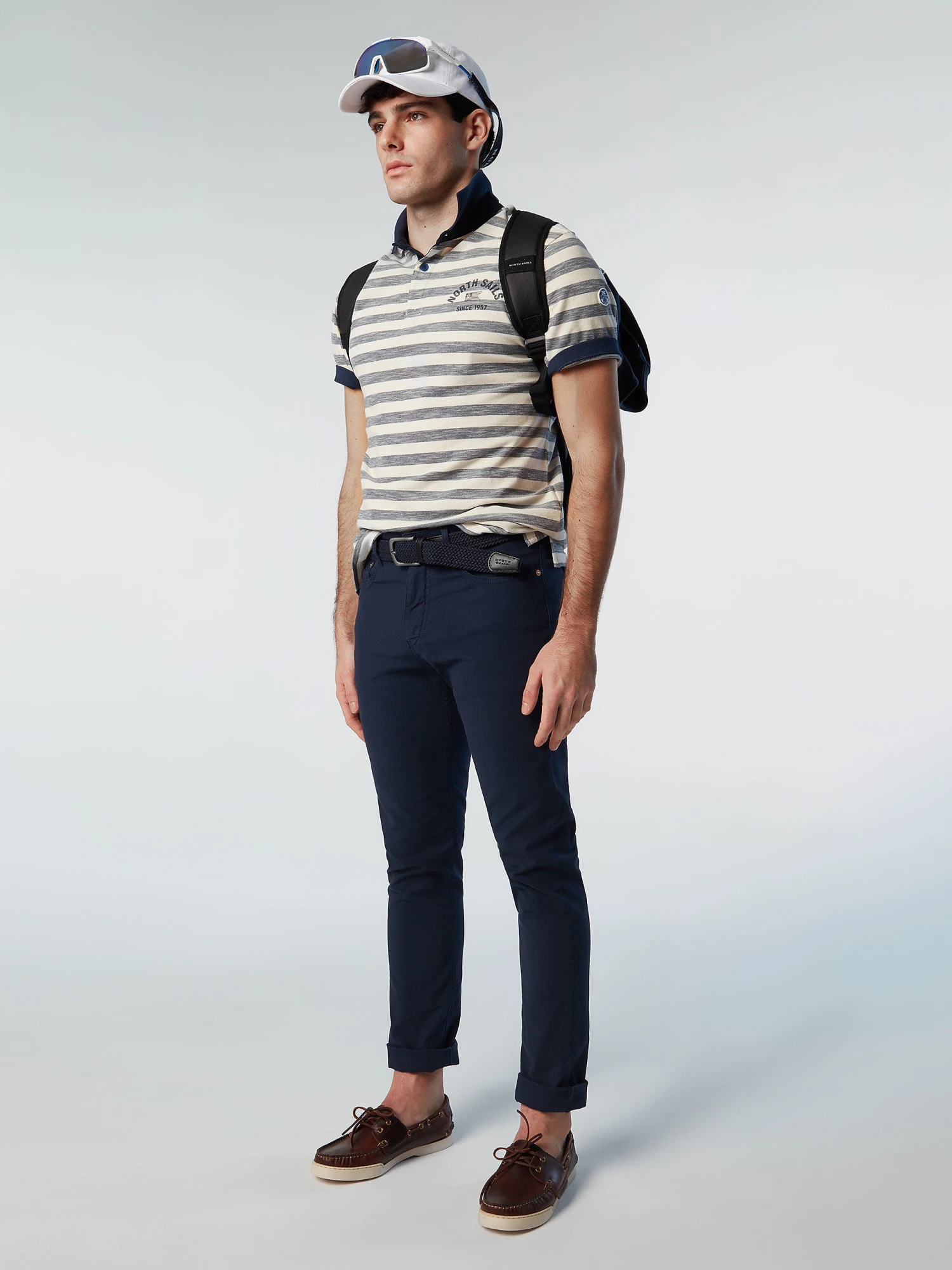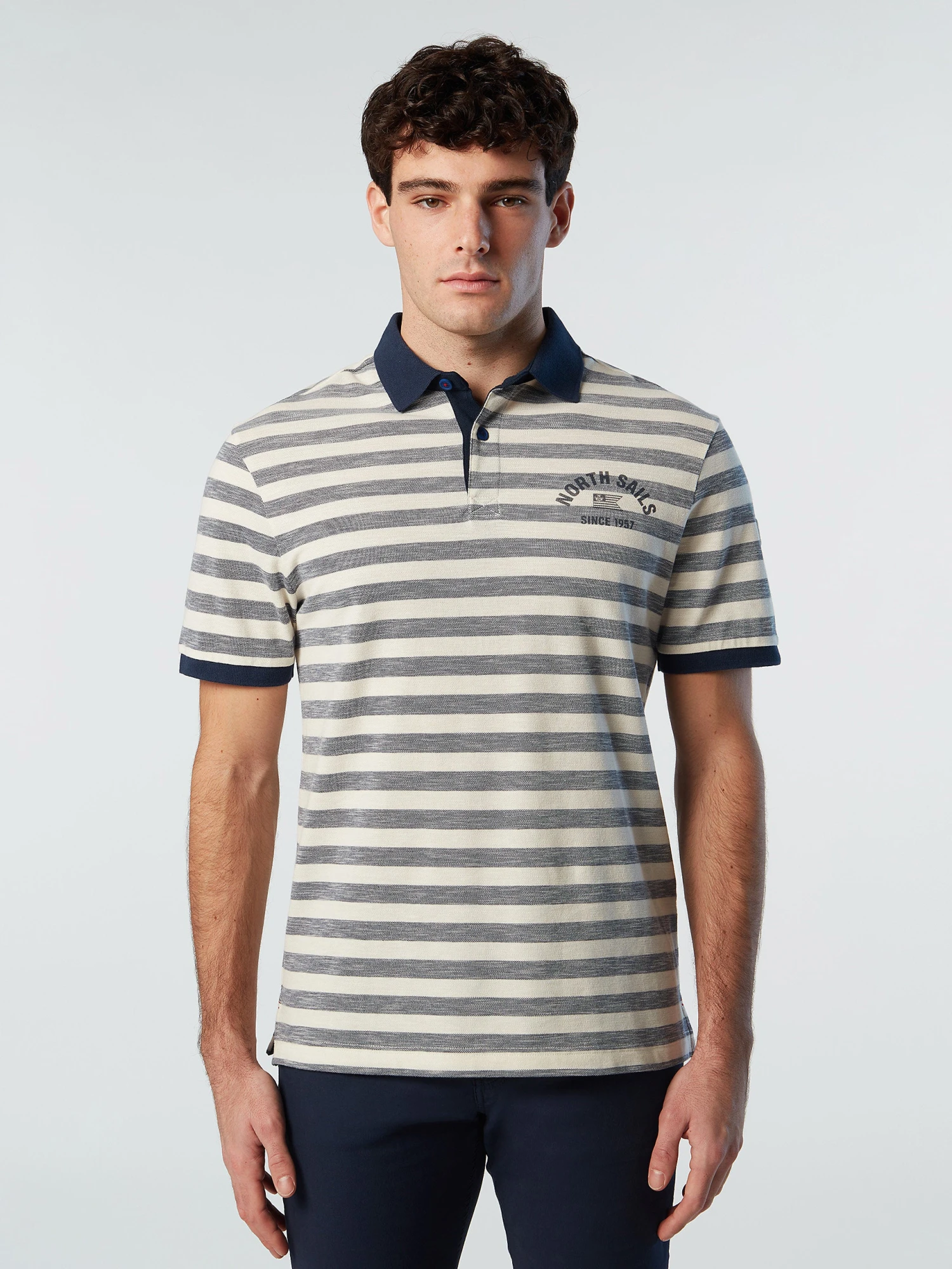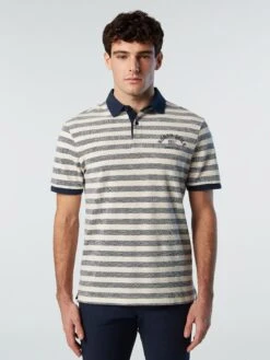 Men’s polo shirt crafted from organic cotton slub piquรฉ. Striped design with felt logo patch on the chest.