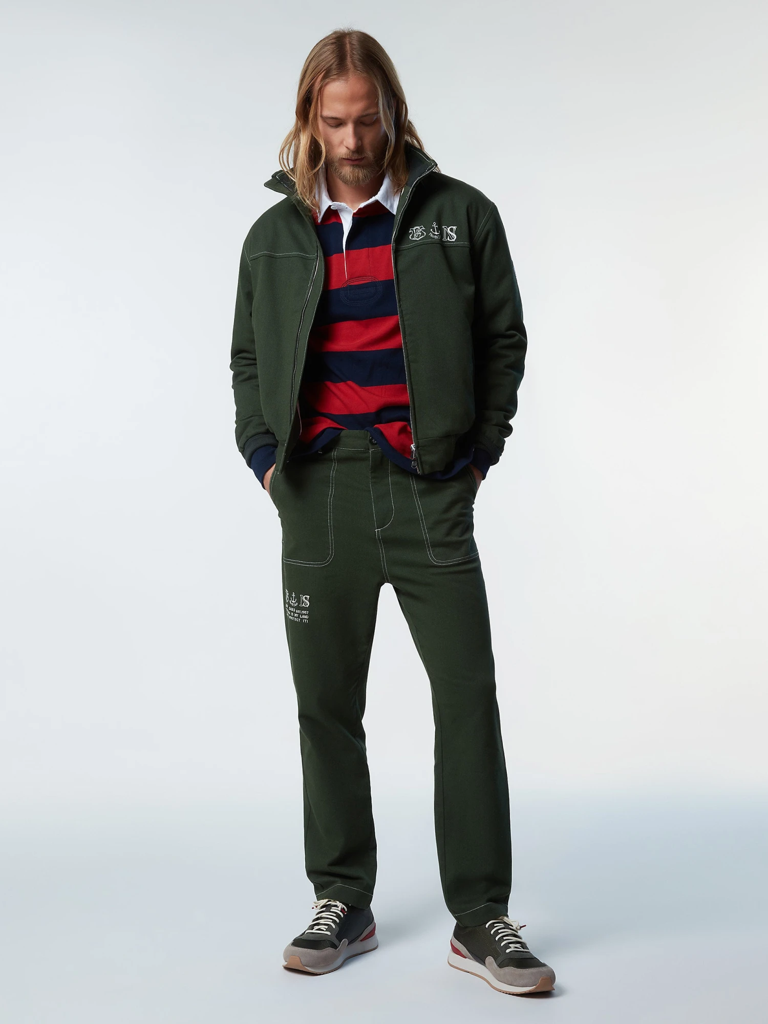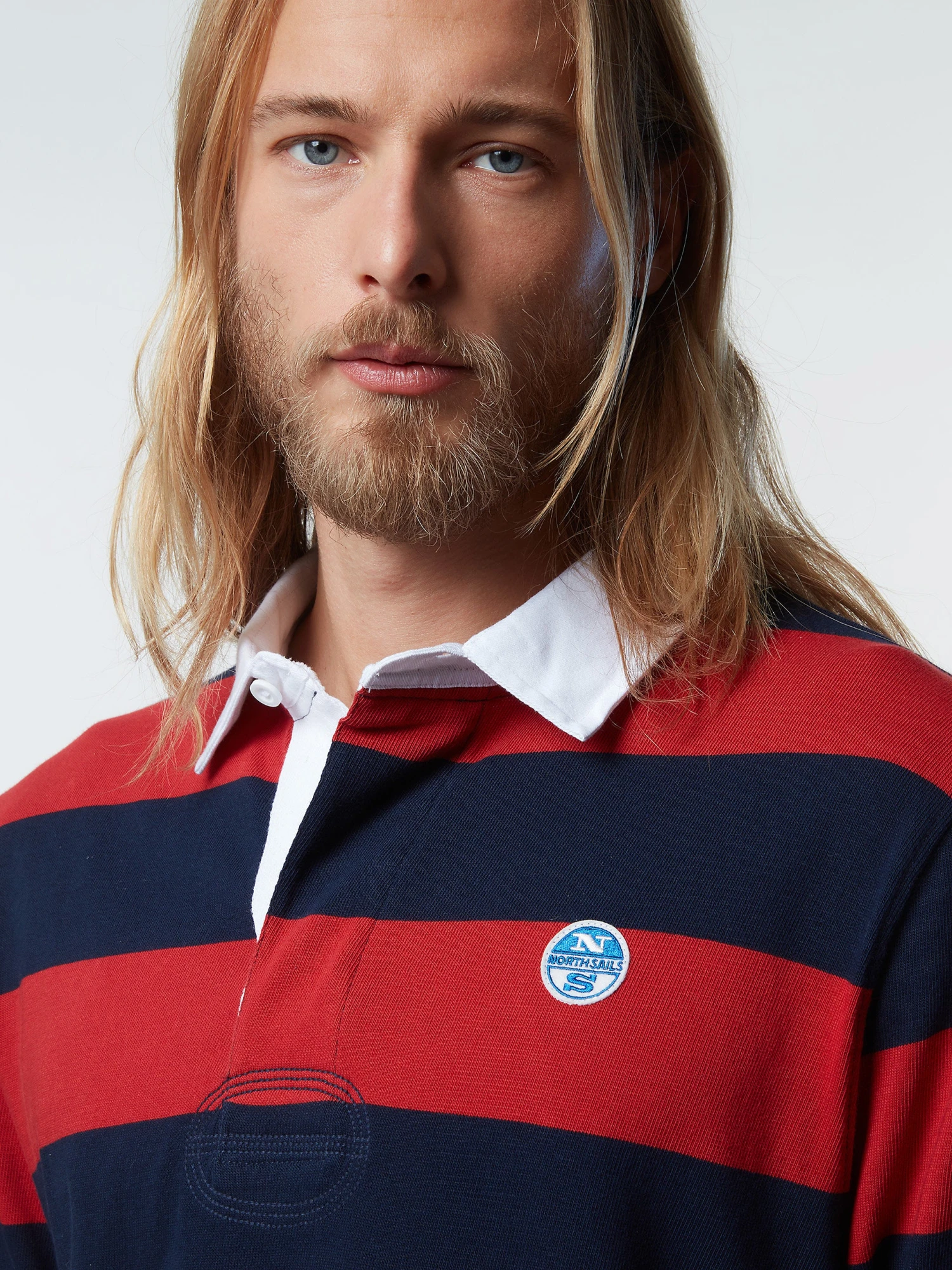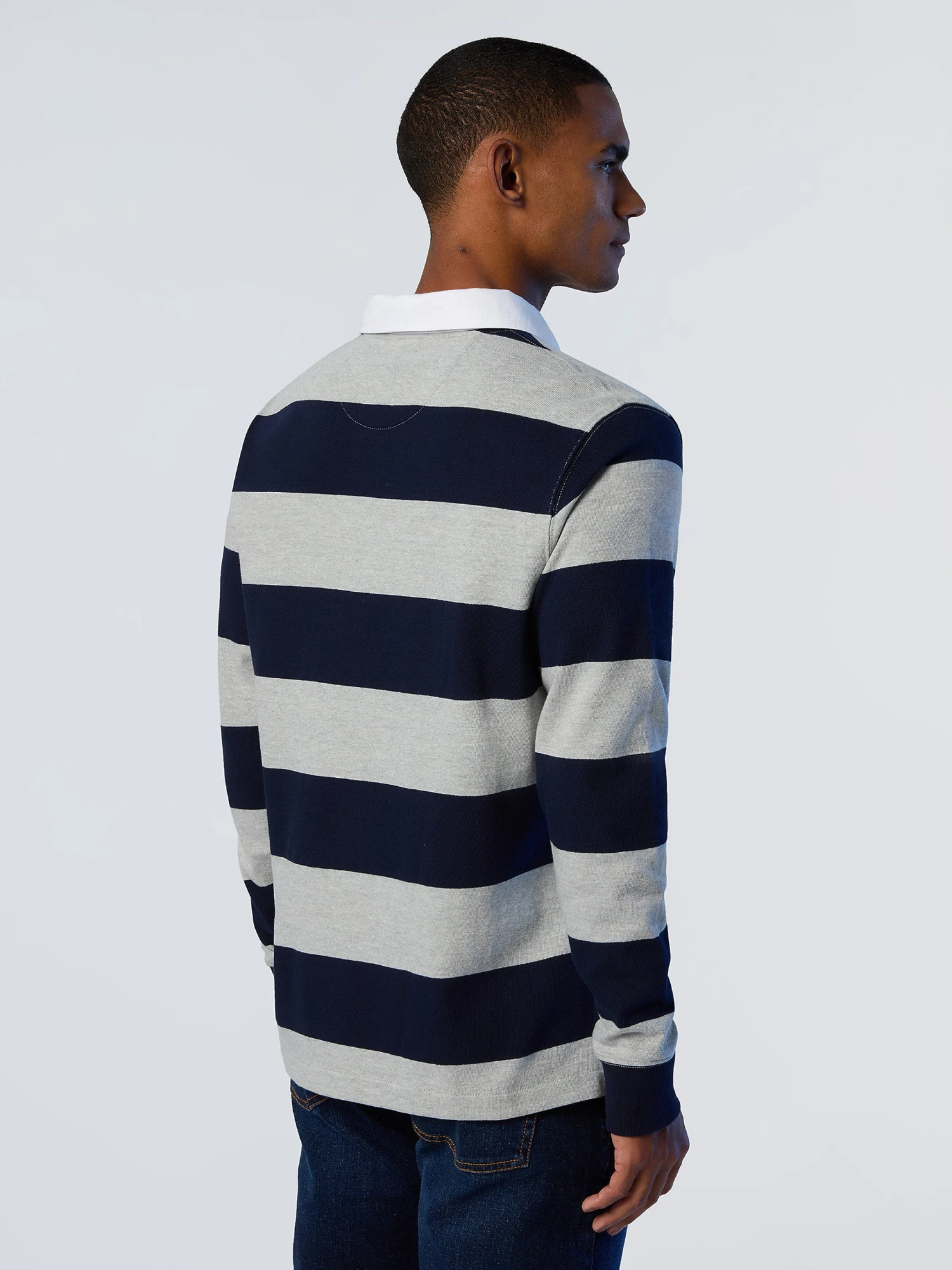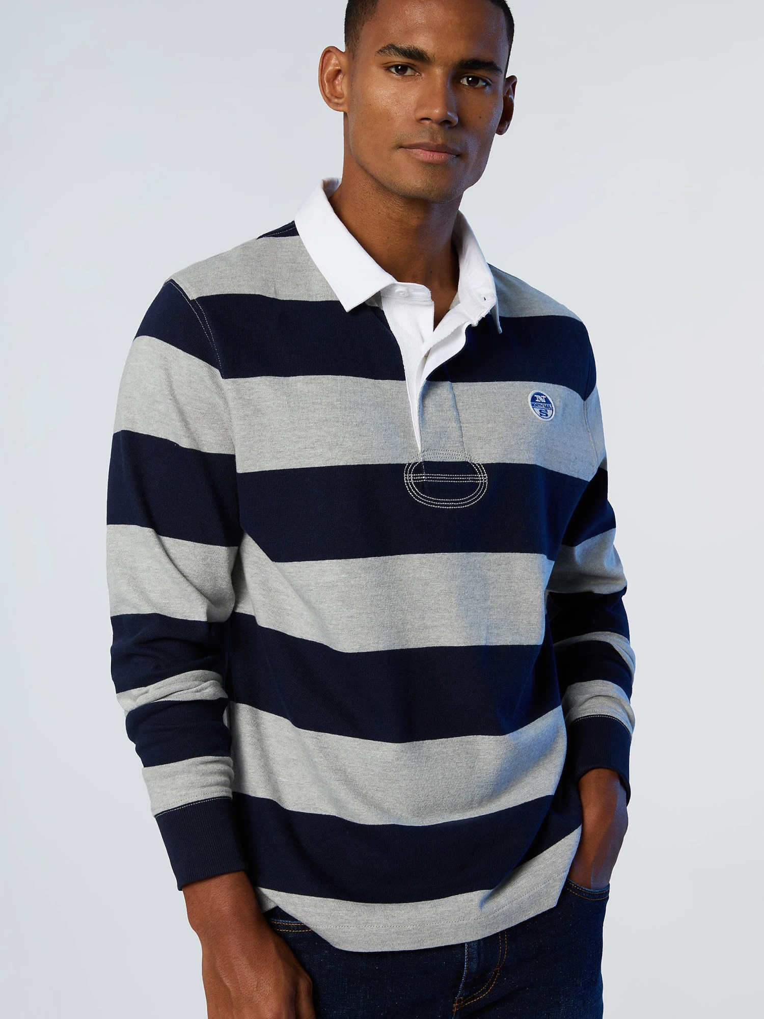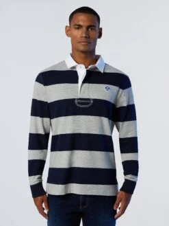Men’s striped rugby top made from organic cotton jersey. Contrast gabardine collar, concealed button placket and North Sails patch on the chest.