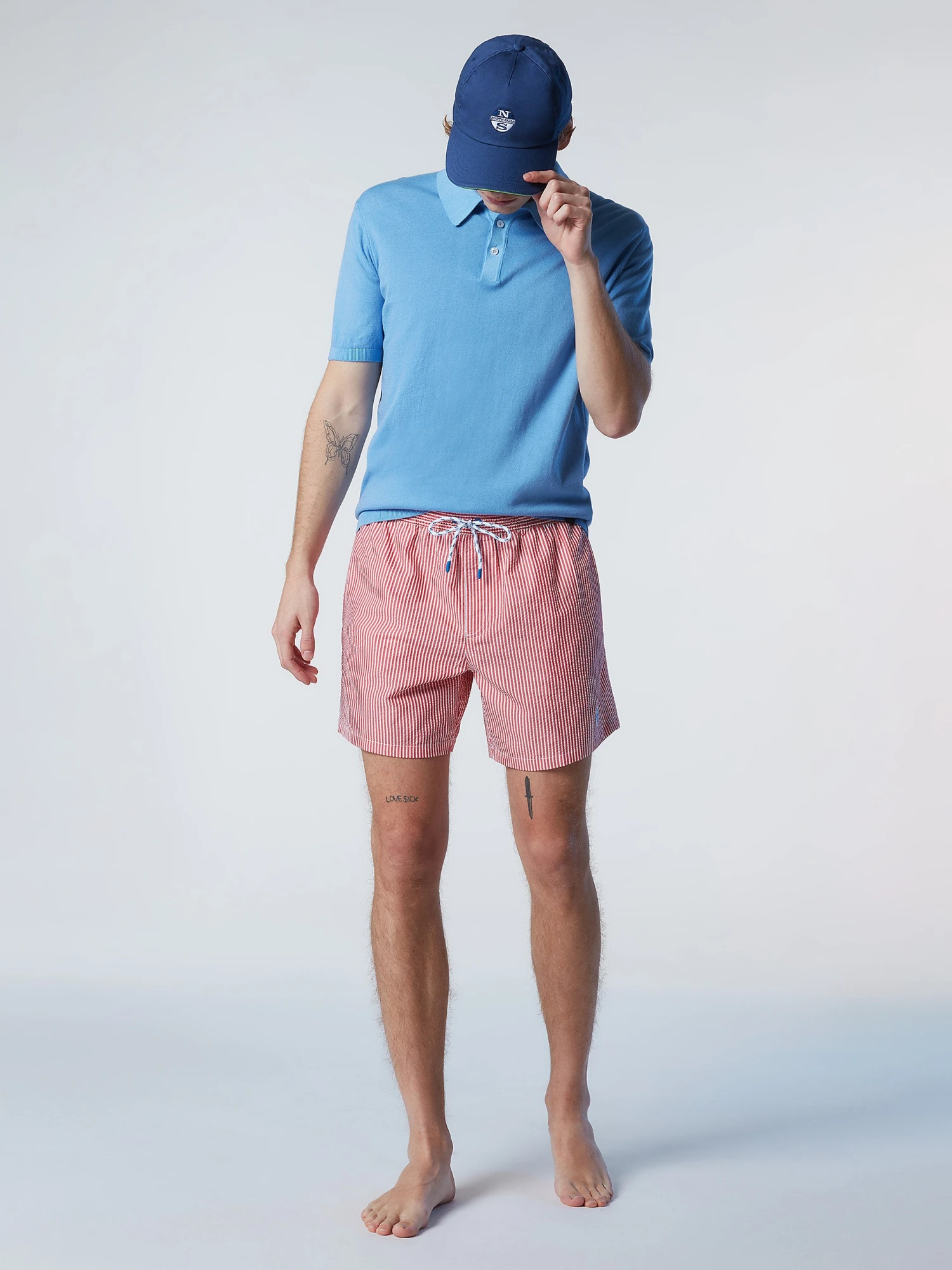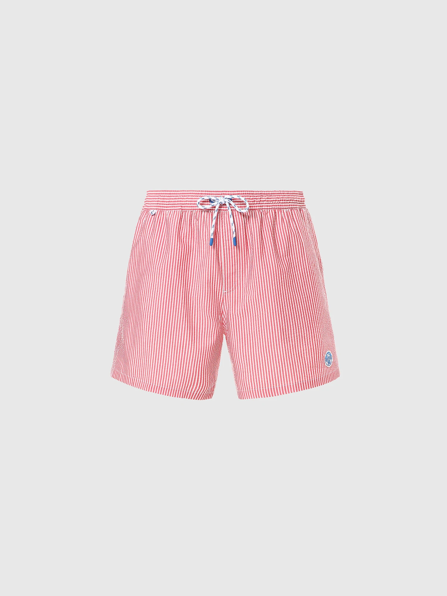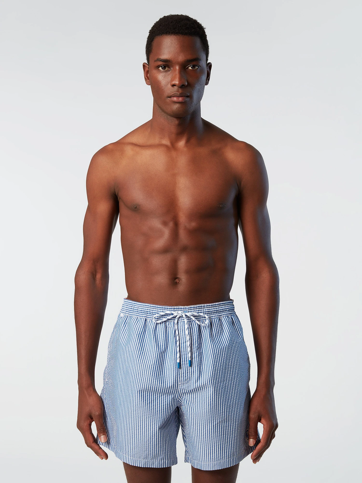 Striped seersucker swim shorts made from blended cotton and recycled polyester. Back flap pocket and logo patch on the left leg.