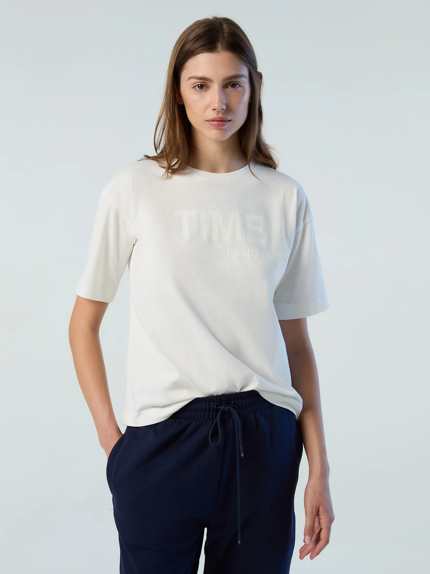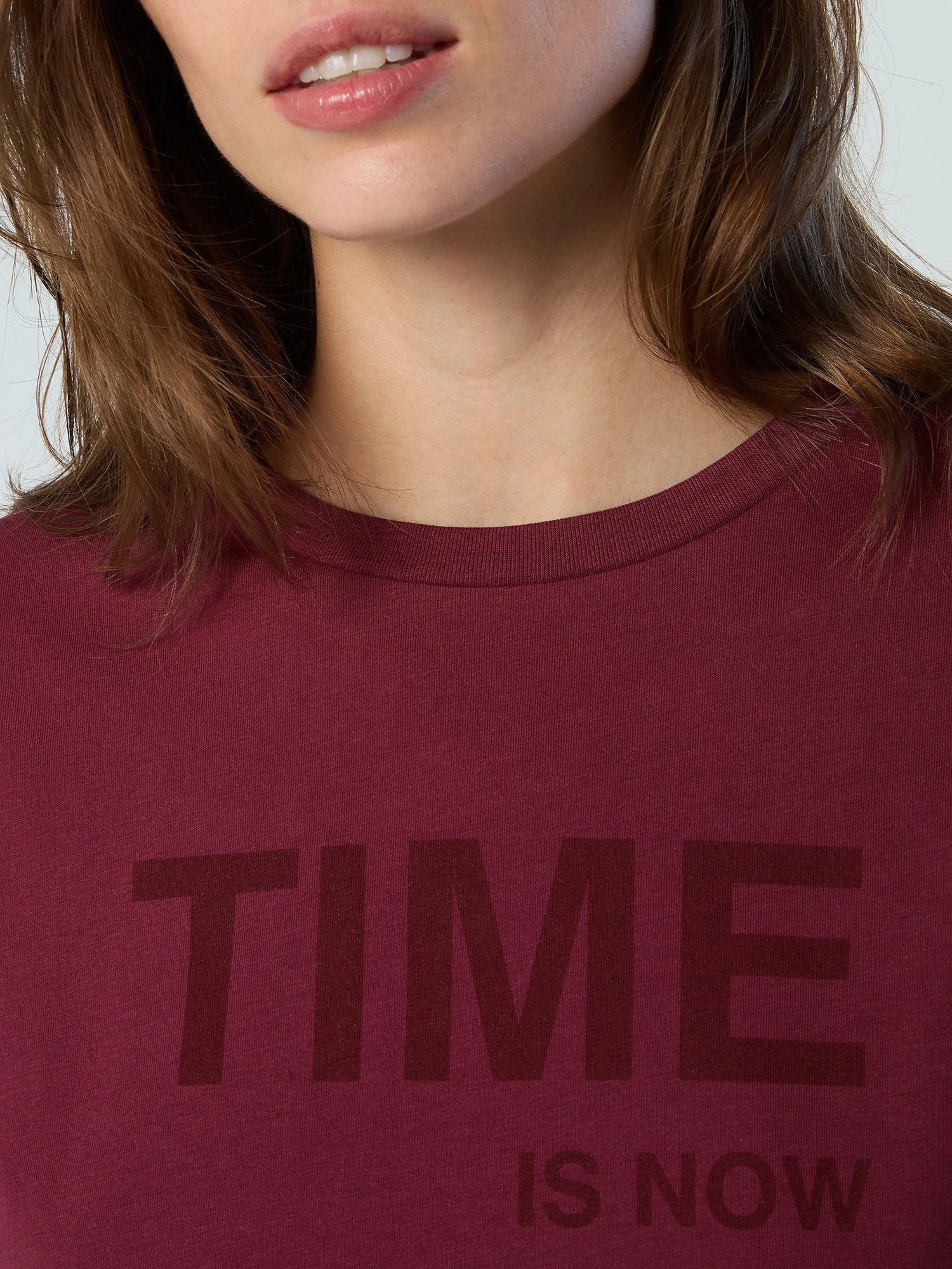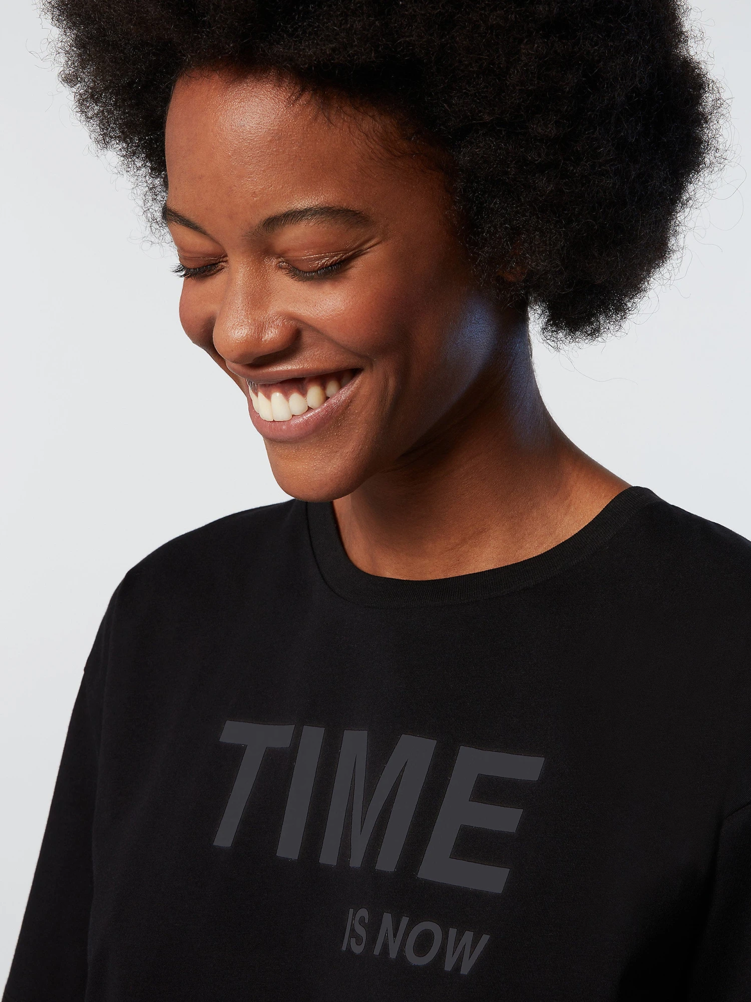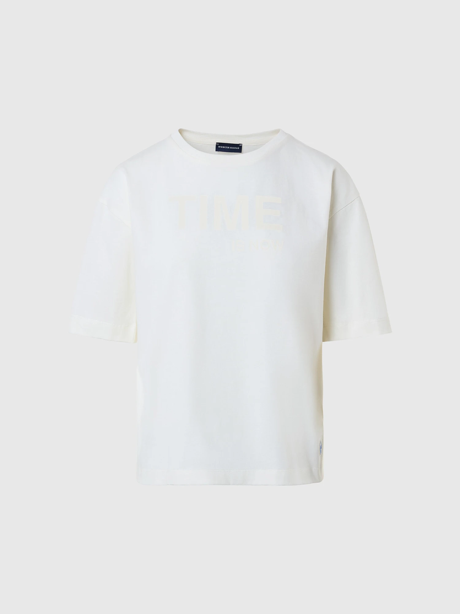 Women’s T-shirt made from organic cotton jersey. Styled with a boxy fit and embellished with slogan prints on the chest and sleeve.